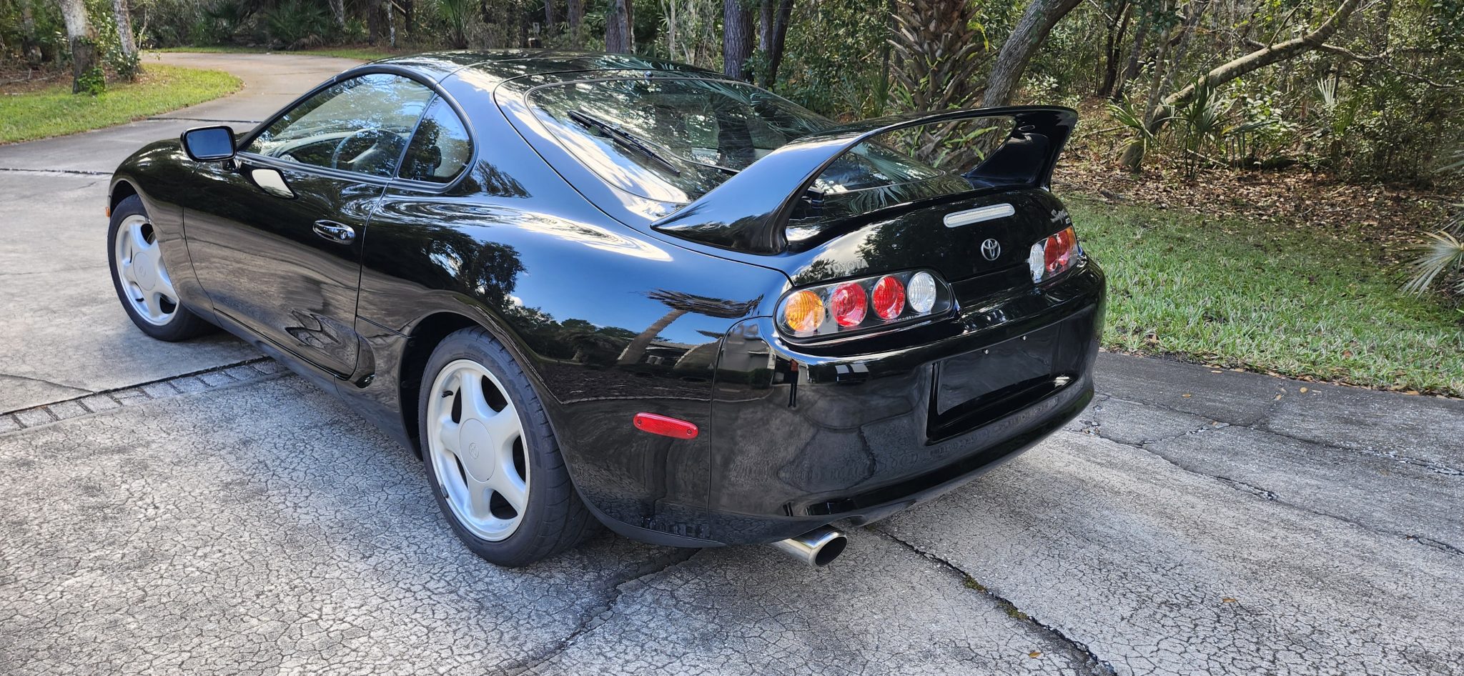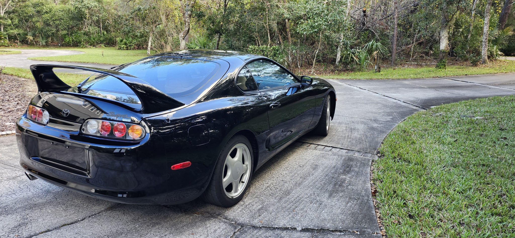 Silver-finished 17″ five-spoke wheels are fitted with an older set of Nitto 555 tires that were mounted in 1999. The car rides on a four-wheel double-wishbone suspension system and features speed-sensing progressive power rack-and-pinion steering and electronic traction control. Anti-lock braking is provided by ventilated discs at each corner.