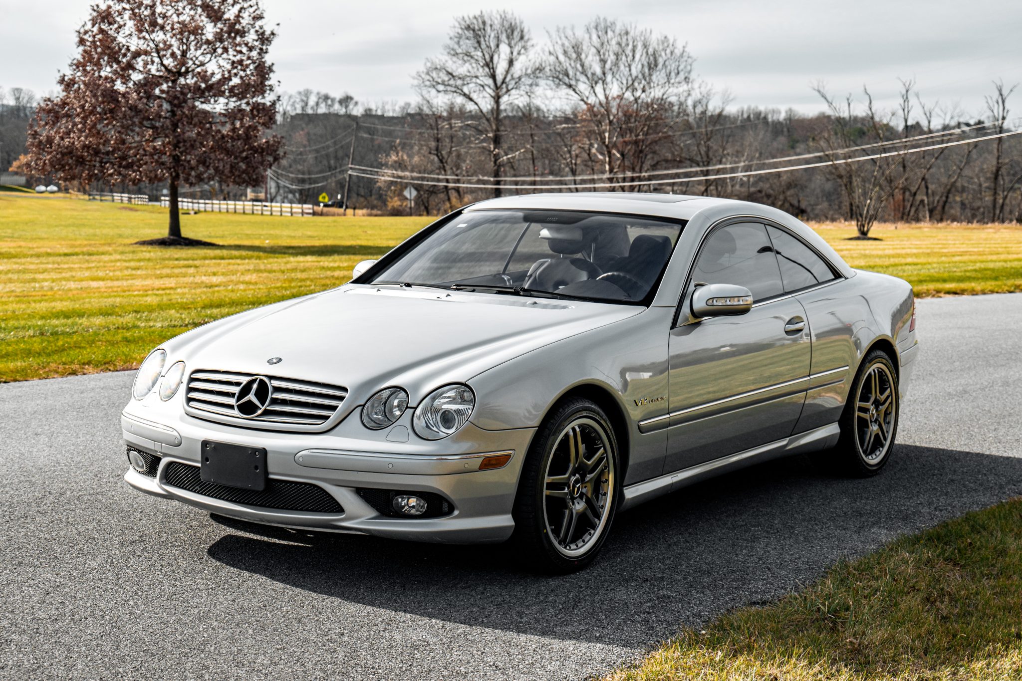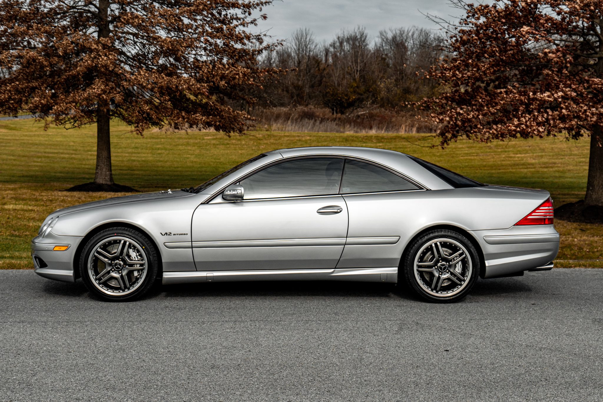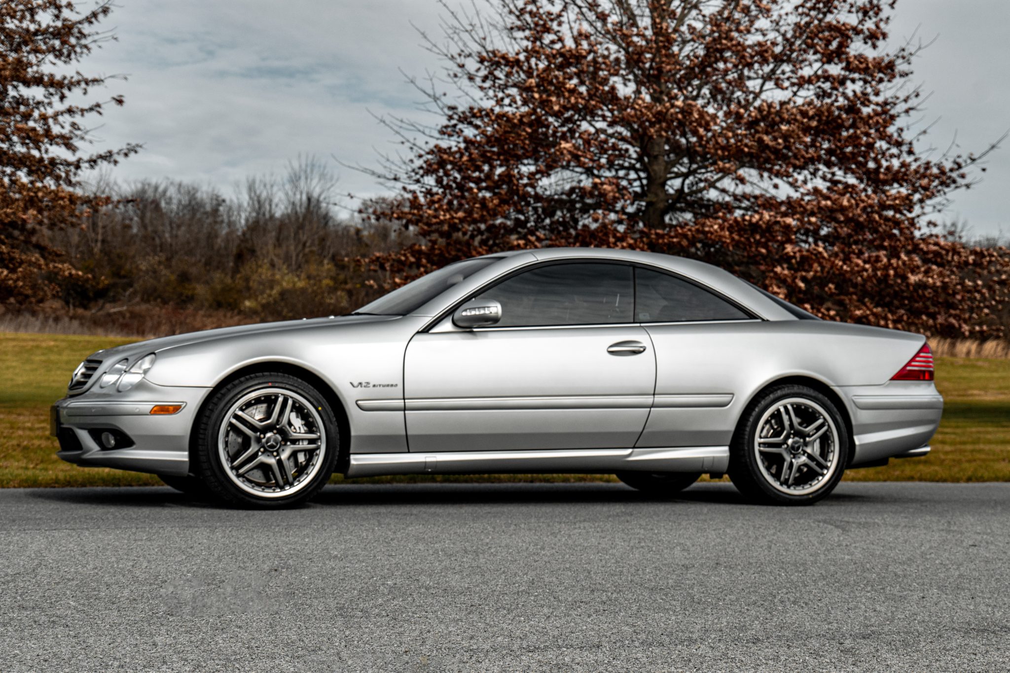 The two-piece 19″ AMG wheels feature anthracite-finished spokes and are mounted with 245/40 front and 275/35 rear Bridgestone Potenza RE050A tires. Active Body Control (ABC) suspension and an Electronic Stability Program (ESP) were standard equipment, and braking is handled by AMG-branded calipers mounted over cross-drilled rotors at each corner. The tandem pump was replaced in September 2024.