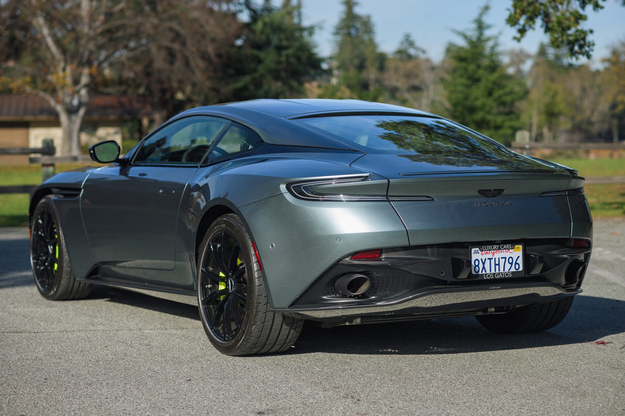 This example is finished in Stirling Green with an exposed carbon-fiber roof, front splitter, rear diffuser, hood and fender blades, side mirror housings, and rocker panels. Additional details include LED headlights and taillights, front and rear parking sensors, and an AeroBlade with a deployable rear spoiler.