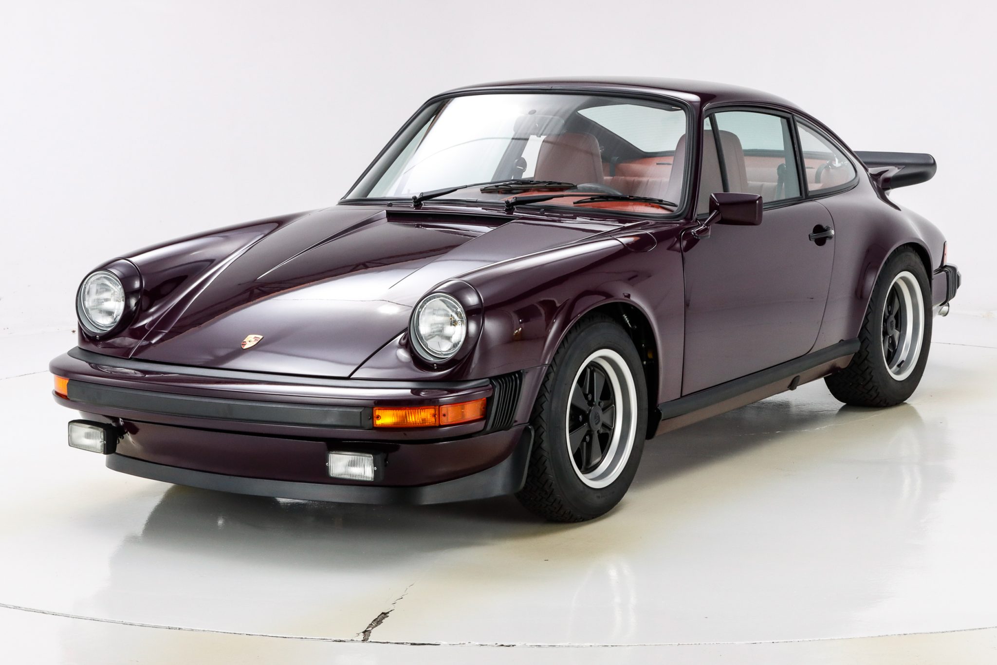 Replacement 15″ Fuchs forged alloy wheels with black centers were mounted with 185/70 front and 215/60 rear Pirelli CN36 tires. A space-saver spare is stored in the front trunk. ATE brake calipers and replacement pads and rotors were installed during the work, and the suspension and steering systems were rebuilt, including the installation of Bilstein sport shocks.