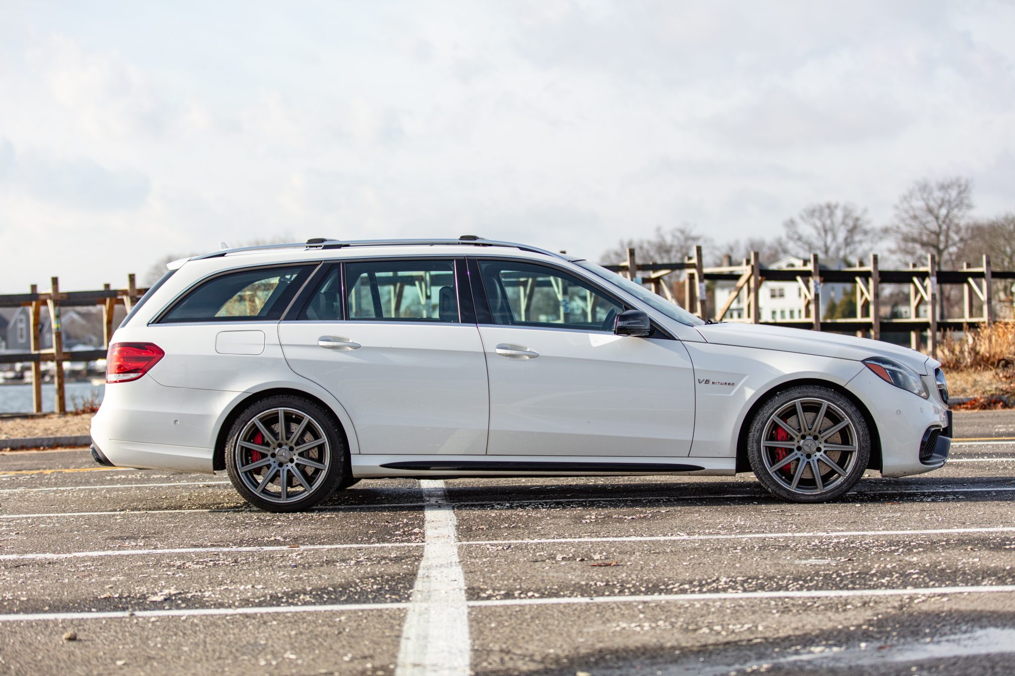 Silver 19″ AMG 10-spoke alloy wheels are mounted with Pirelli Sottozero Serie II tires. A gouge is present on the rear-left tire’s sidewall. The car features an AMG Adaptive Sport Suspension with rear air springs and three driver-selectable modes. Control arms are said to have been replaced under current ownership, and the cross-drilled and slotted brake rotors were replaced in December 2024. A set of four Michelin Pilot Sport A/S 3+ tires said to have been purchased in July 2021 are included in the sale.