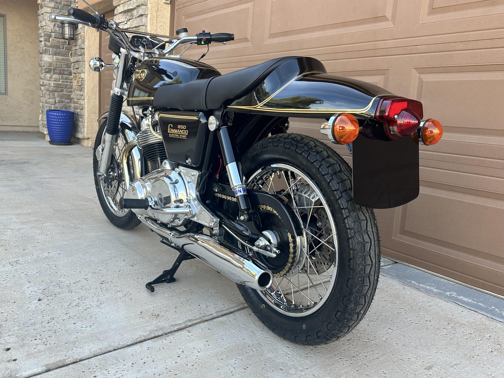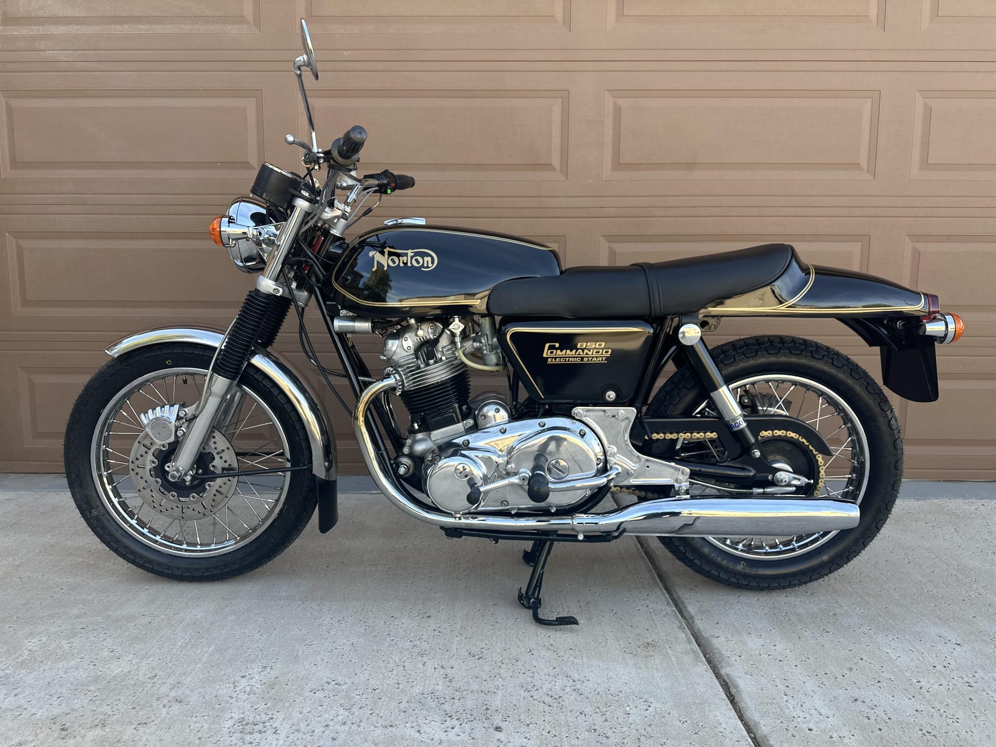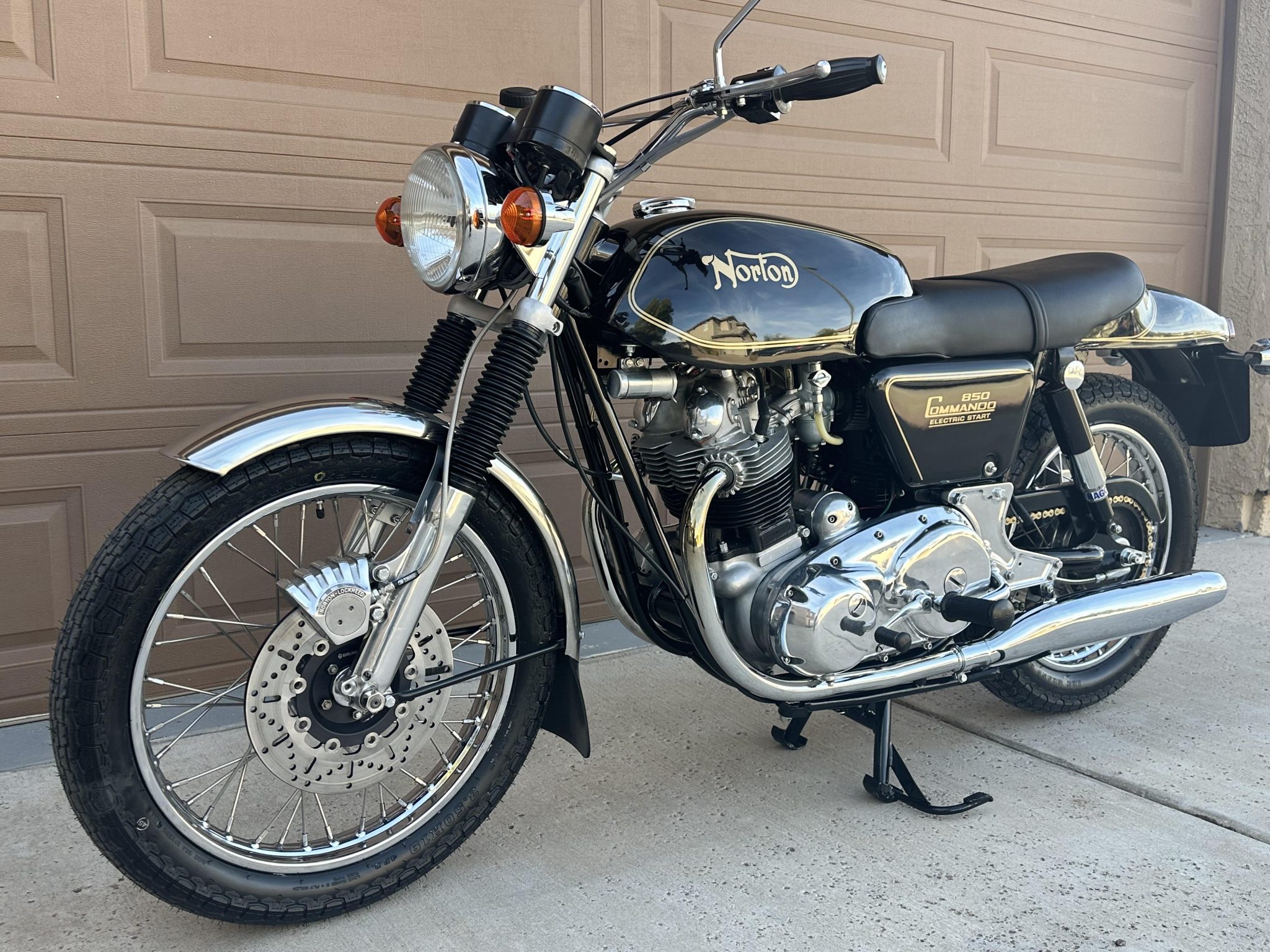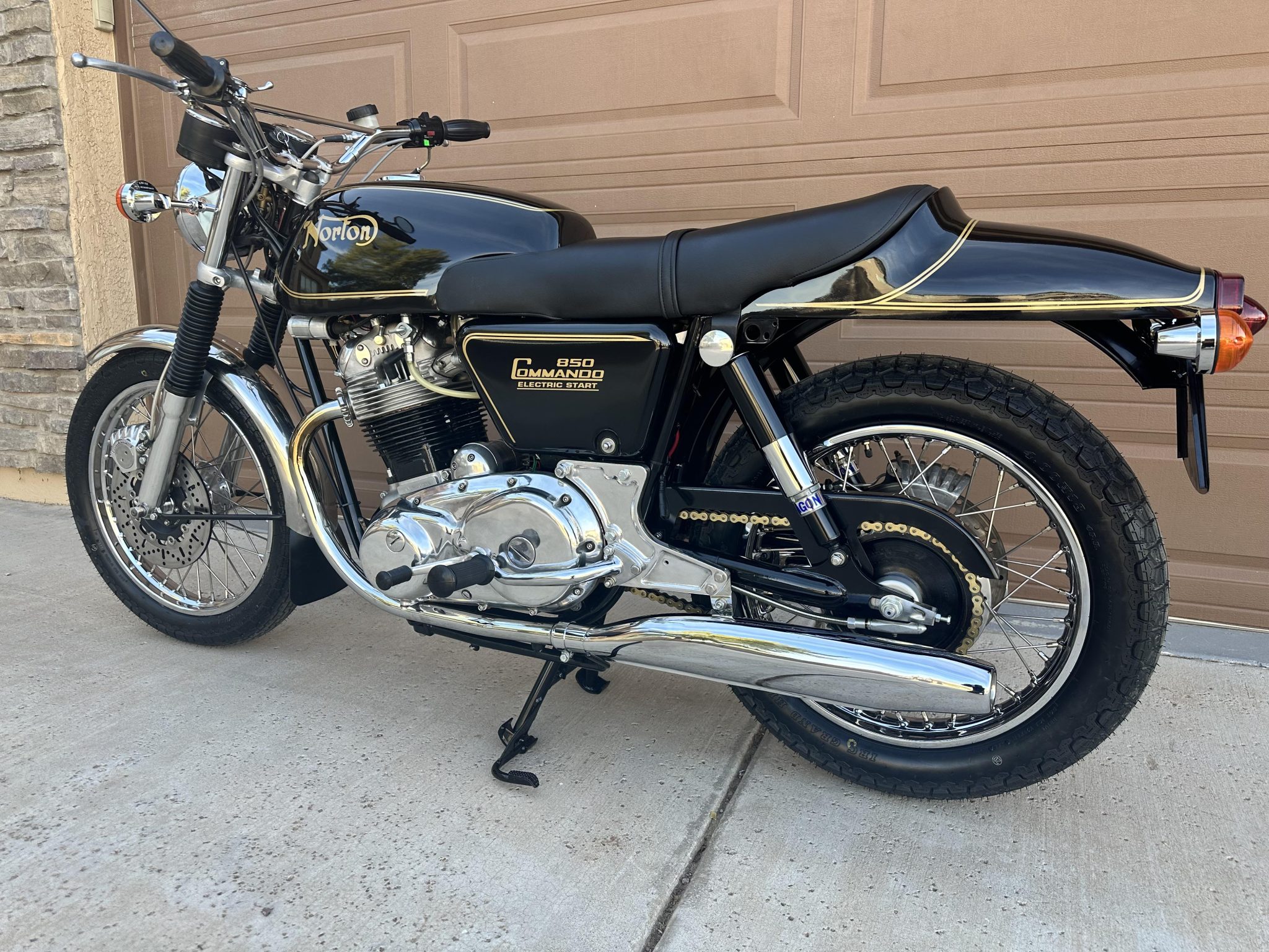 Wire-spoke wheels measuring 19” up front and 18” out back feature stainless-steel spokes and chrome-steel rims, and they are mounted with IRC Grand High Speed tires. Suspension consists of a polished Roadholder telescopic fork with JS Engineering internals and black gaiters as well as dual Hagon shocks mounted to the swingarm. Braking is handled by a disc at each end featuring Girling master cylinders, braided stainless-steel lines, rebuilt calipers, and Girling floating cross-drilled rotors.
