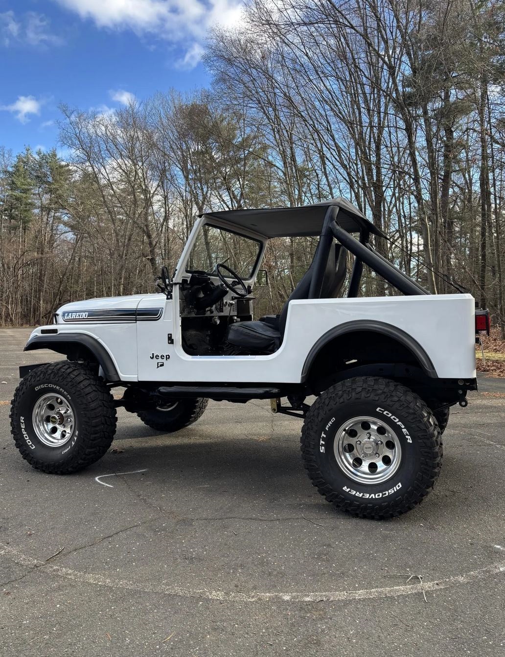 Polished 15″ Pro Comp wheels are mounted with 35×12.5″ Cooper Discoverer STT Pro tires. The Jeep is equipped with manually locking front hubs, power steering, an SPOA suspension lift, and a YJ steering box and springs. Braking is handled by power-assisted front discs and rear drums. The seller states that a high-steer kit was installed along with replacement shock absorbers under previous ownership.