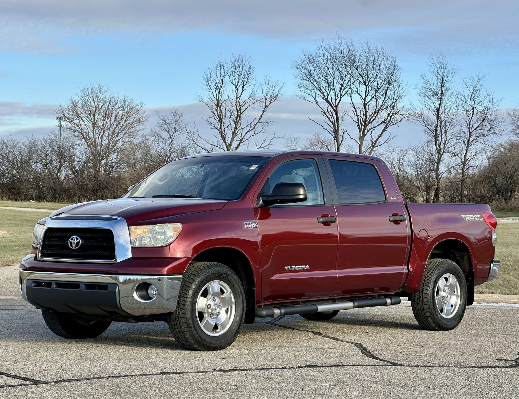 The 18″ five-spoke TRD Off-Road alloy wheels are mounted with Yokohama Geolandar tires measuring 275/65, and braking is provided by power-assisted discs at each corner. The TRD Off-Road Package added an off-road suspension.