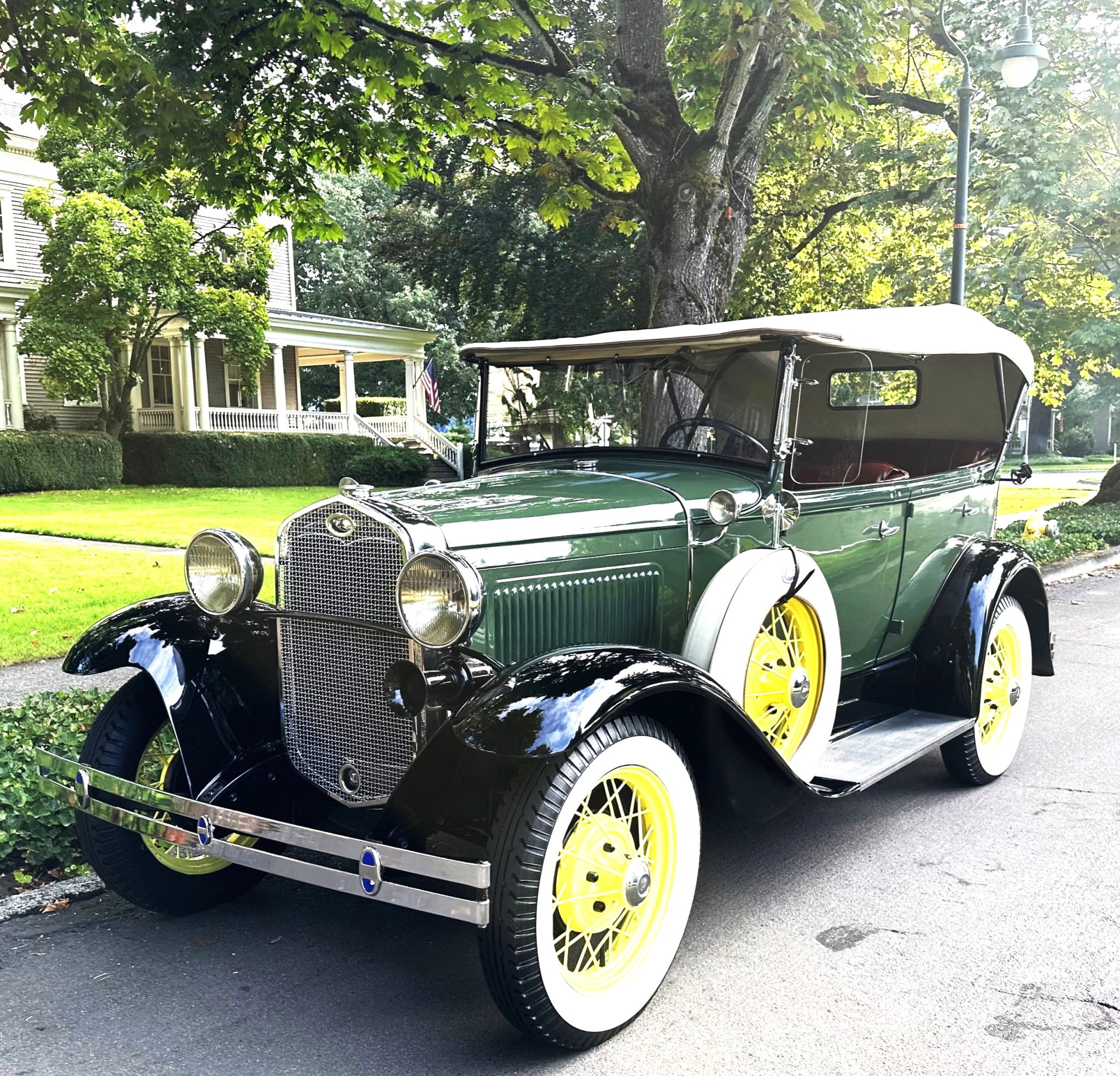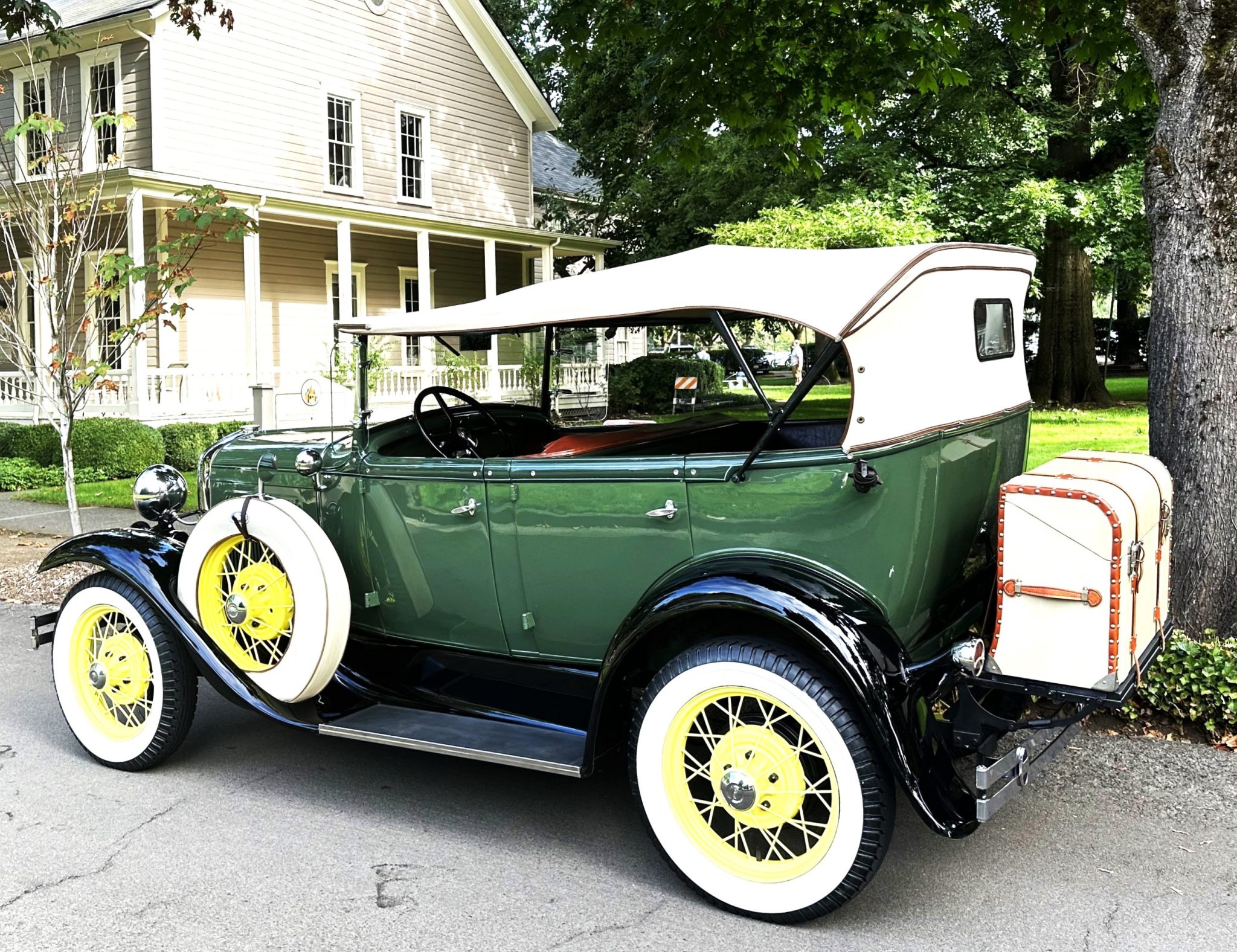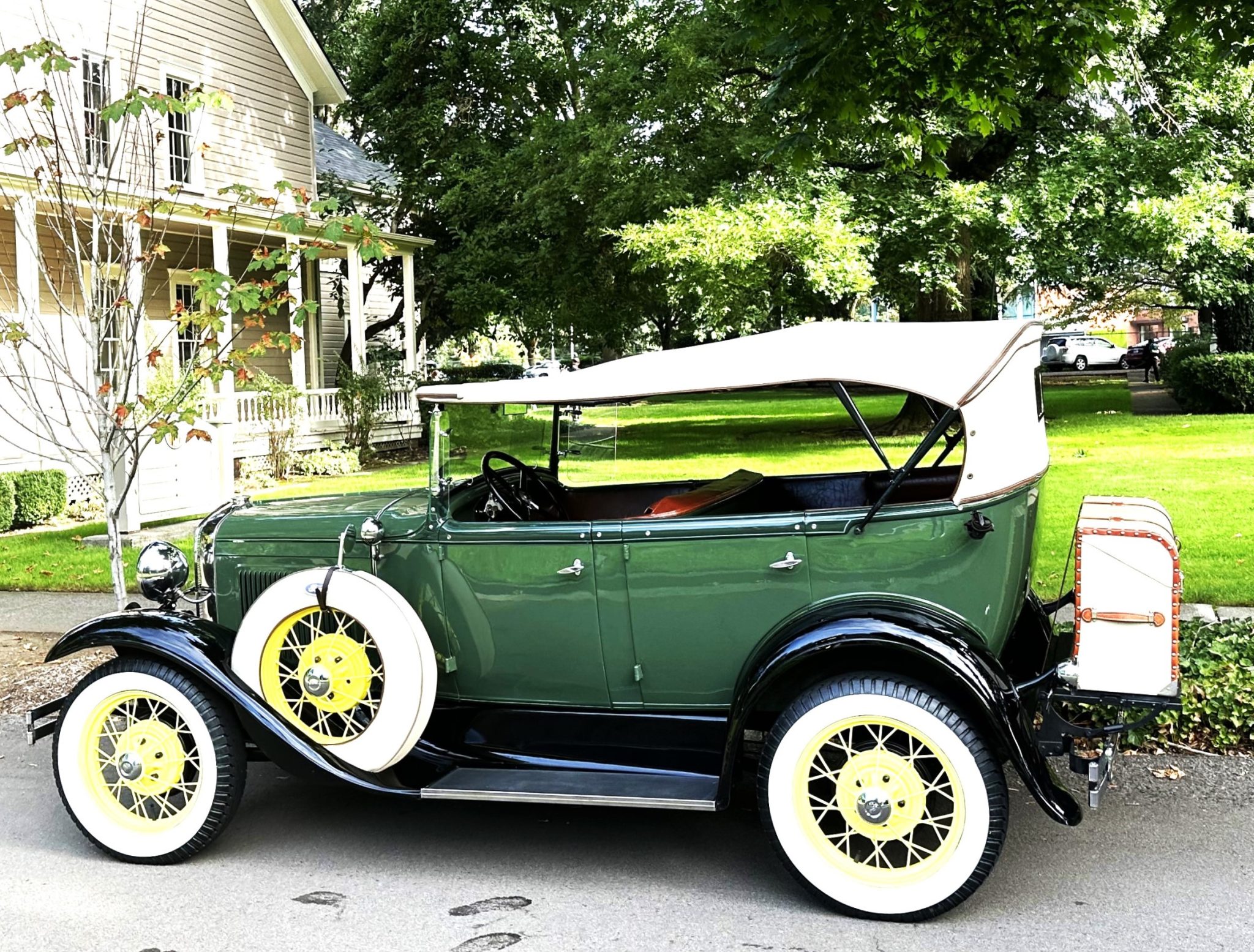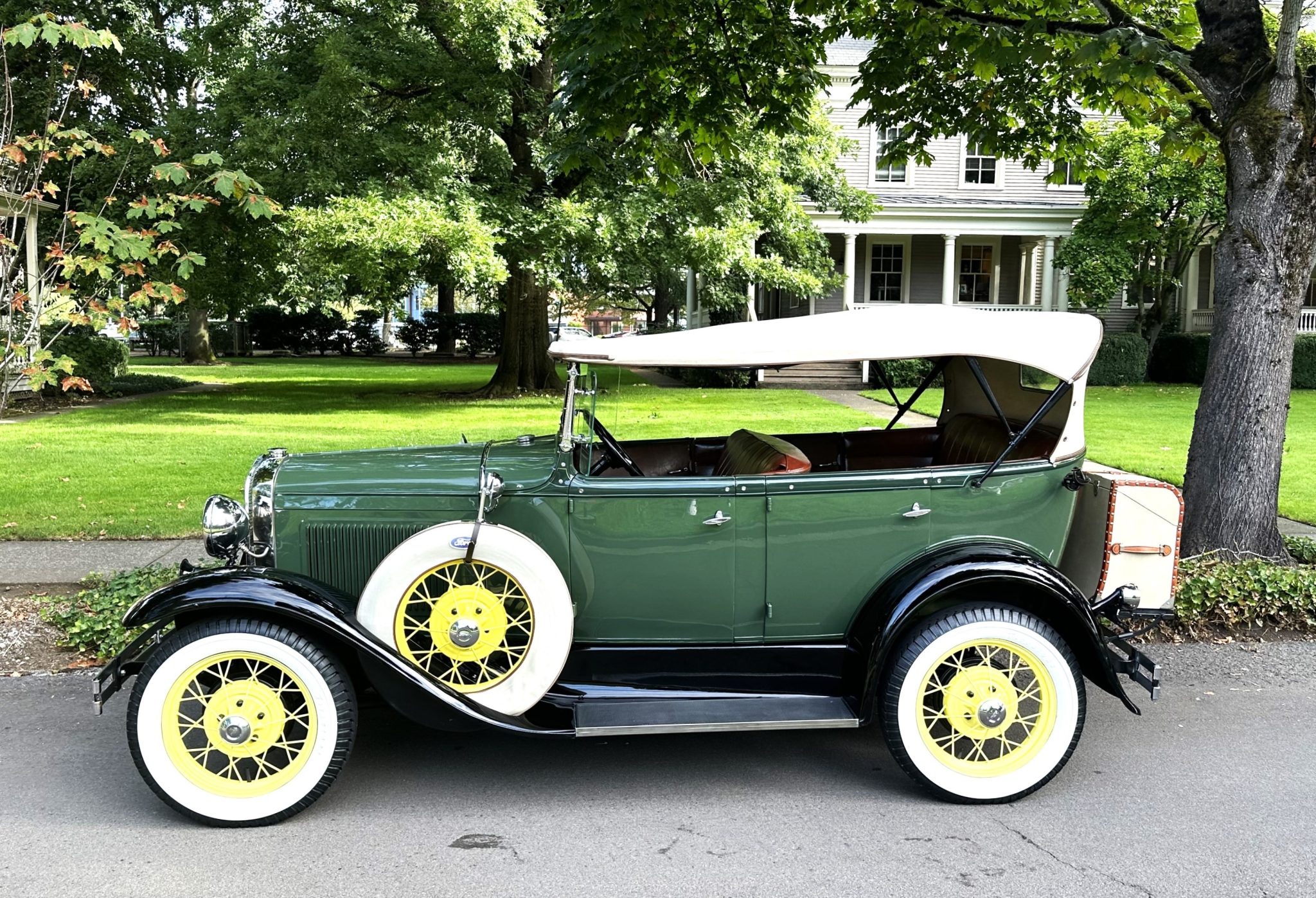 Yellow-painted 19″ wire wheels are mounted with Firestone tires measuring 4.75-5.00, and matching spares are mounted in the front fenders under covers topped by mirrors. Braking is provided by four-wheel drums.