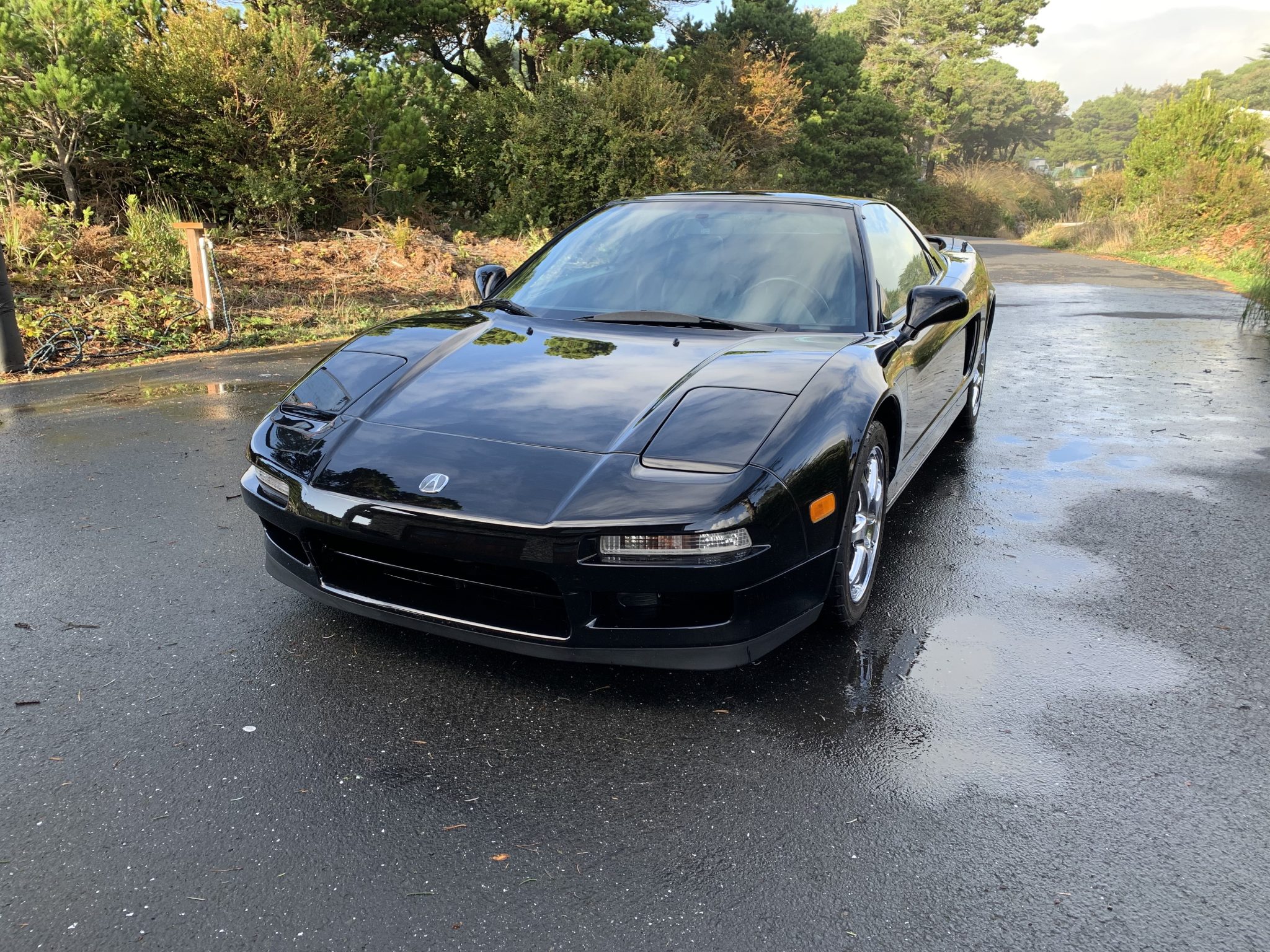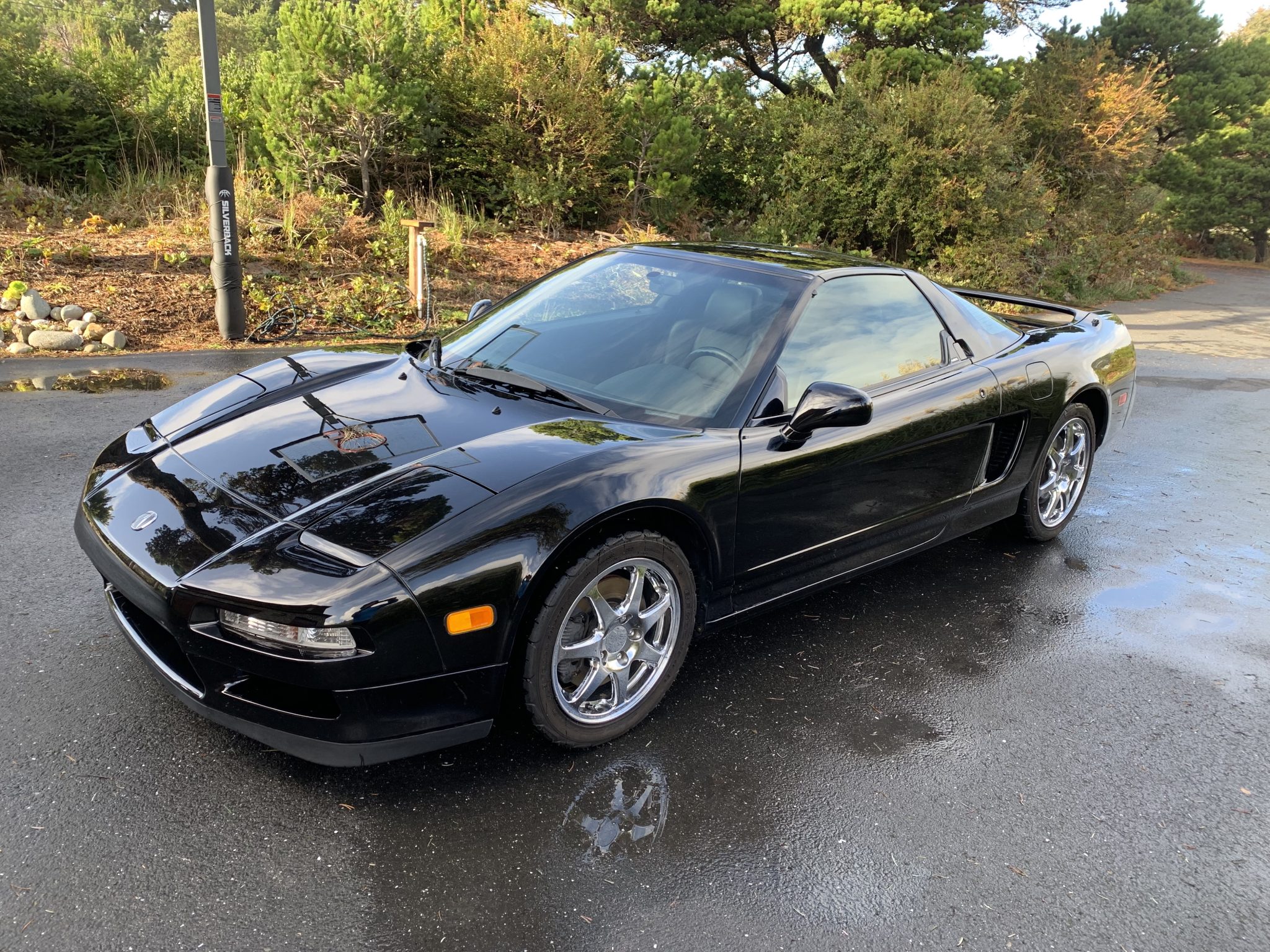 Staggered-diameter 16” and 17” seven-spoke aluminum wheels are mounted with BFGoodrich g-Force Rival tires measuring 215/45 in front and 245/40 out back. The car features a four-wheel double-wishbone suspension with front and rear stabilizer bars, and braking is handled by NSX-branded calipers over vented rotors at each corner.