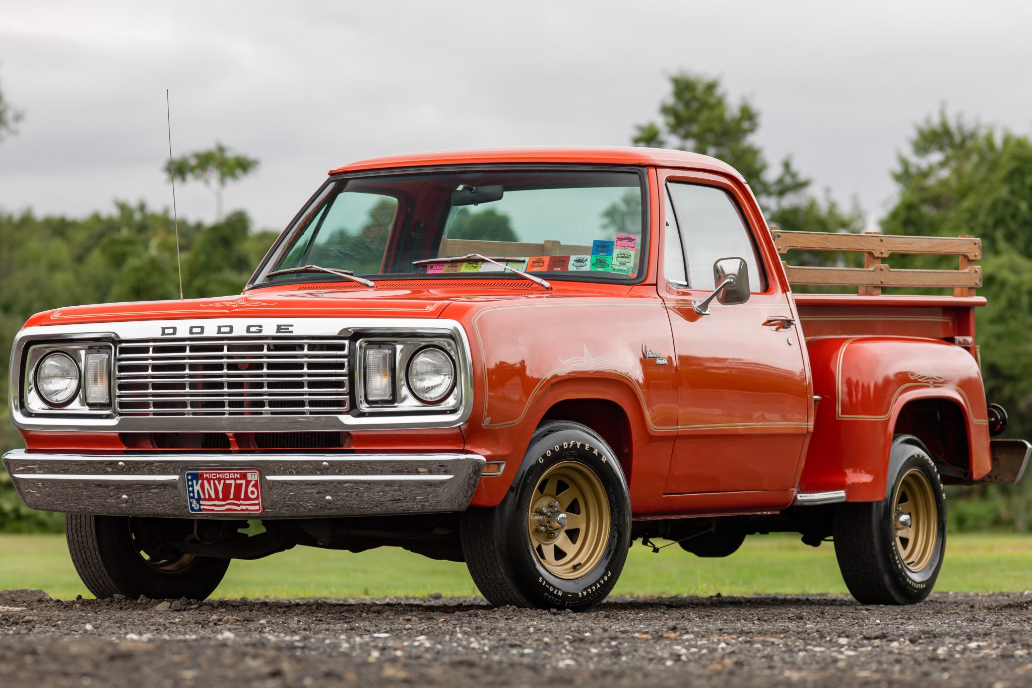 Gold-finished 15″ eight-spoke wheels are mounted with Goodyear tires. Stopping power is provided by front disc and rear drum brakes. The emergency brake cable was replaced in preparation for the sale.