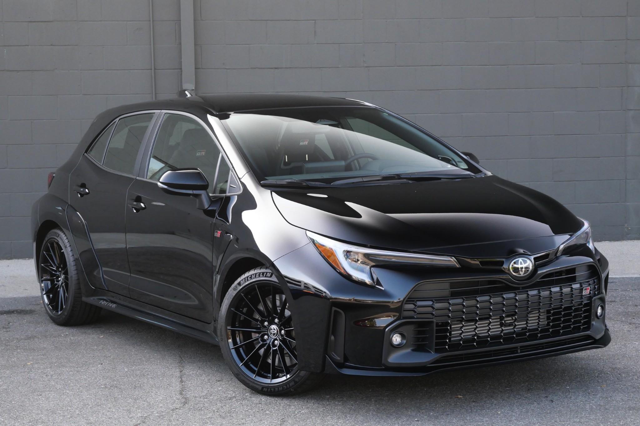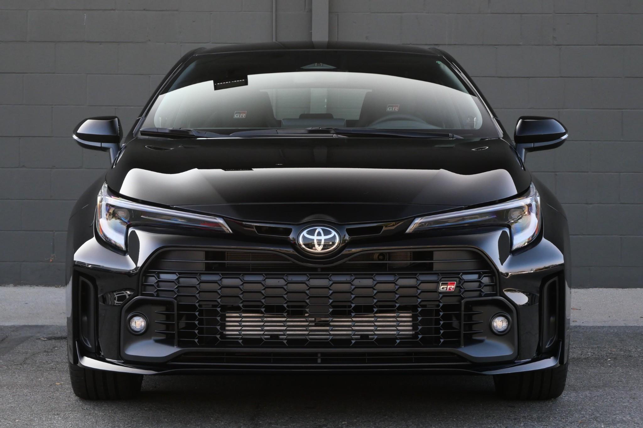 Gloss black–finished 18″ alloy wheels are wrapped in 235/40 Michelin Pilot Sport 4 tires. Braking is handled by red GR-branded four-piston front and two-piston rear calipers over slotted rotors at all four corners.