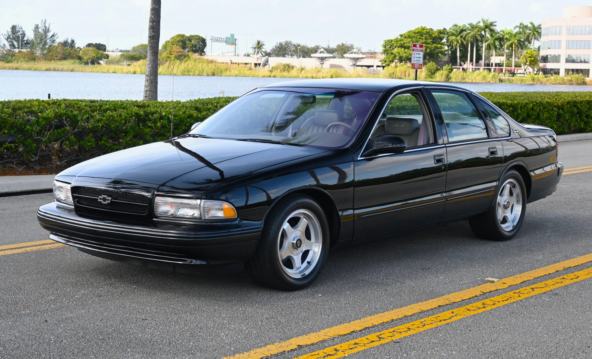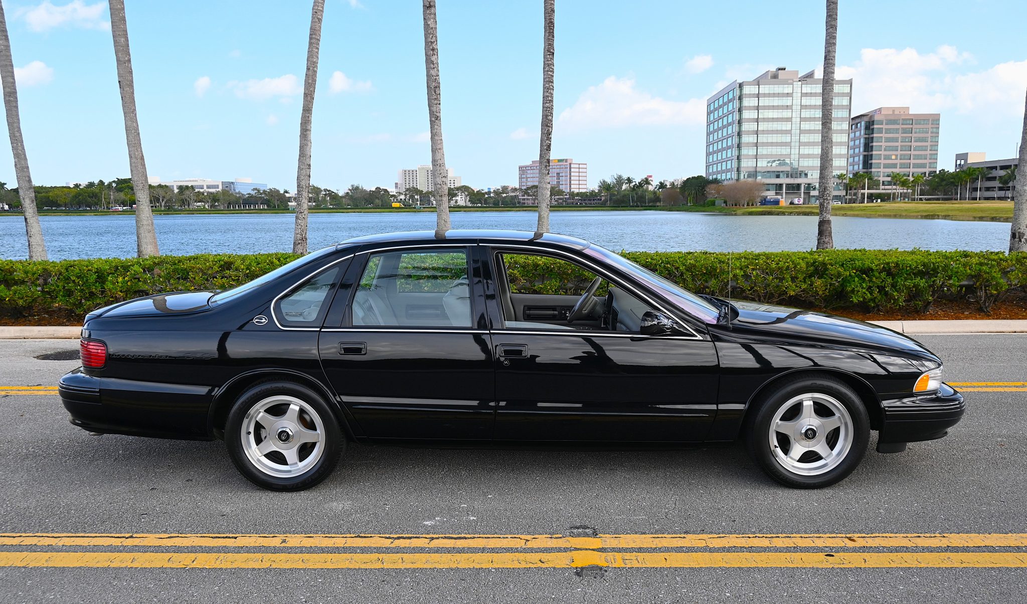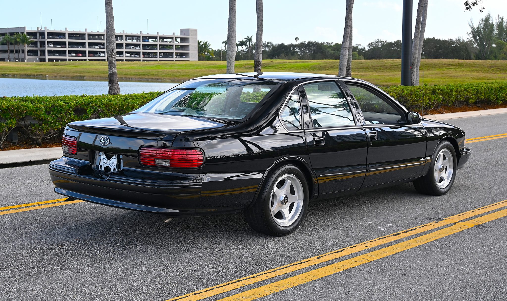 Polished 17″ five-spoke alloy wheels are mounted with older BFGoodrich Comp T/A tires. The Impala SS was fitted with heavy-duty dampers, 12.1″ disc brakes, and a 1″ lower sport-tuned suspension when compared with the contemporary Caprice.