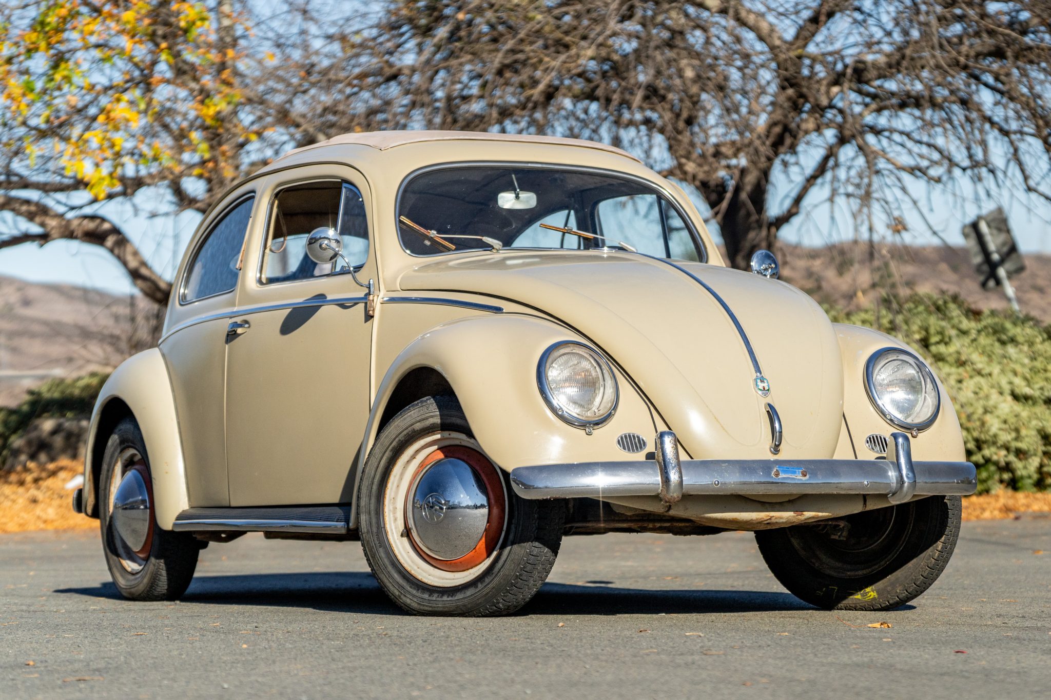 The 15” steel wheels wear chrome VW-stamped hubcaps and are mounted with 155-series Michelin XZX tires. A matching steel wheel with an older bias-ply tire is housed in the front trunk. Braking is handled by four-wheel drums.