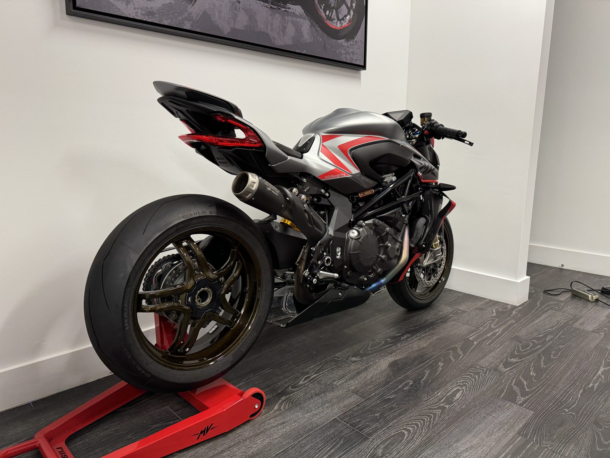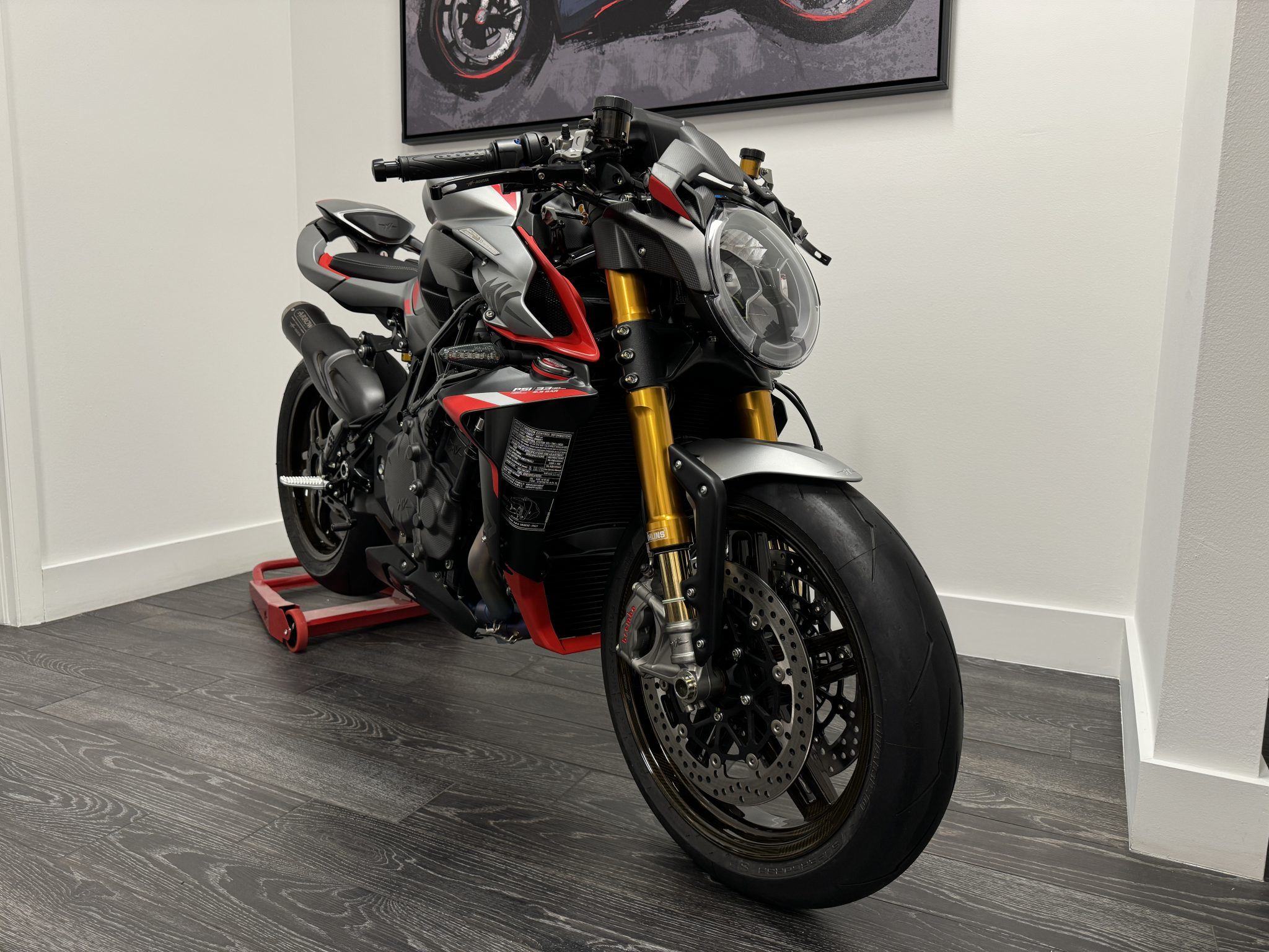 BST carbon-fiber 17″ aluminum wheels are mounted with 120/70 front and 200/55 rear Pirelli Diablo Supercorsa tires. Electronically adjustable Öhlins suspension consists of an inverted 43mm NIX EC fork with TiN-plated tubes as well as an EC TTX piggyback monoshock mounted to the single-sided swingarm. ABS braking is from dual Brembo Stylema Monobock calipers over 320mm discs up front and a single two-piston caliper with a 220mm disc out back.