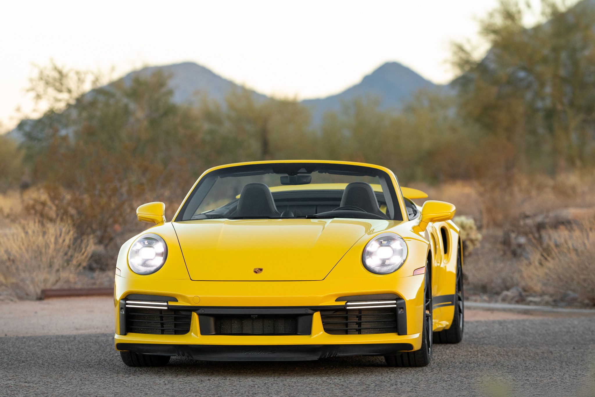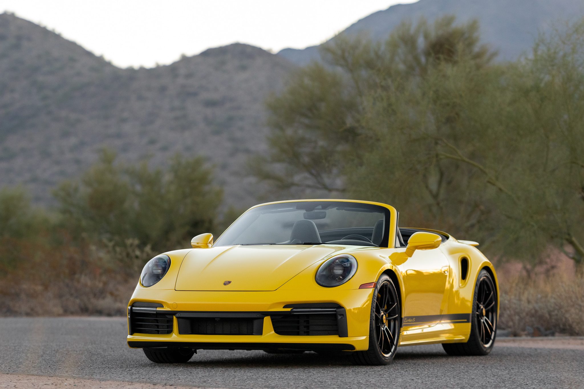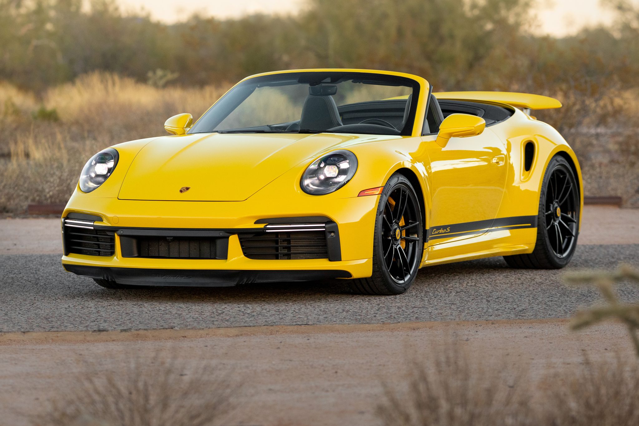 Center-locking 20″ and 21″ Turbo S alloy wheels are mounted with Pirelli P Zero tires. Stopping power is provided by Porsche Ceramic Composite Brakes (PCCB) with yellow-finished multi-piston calipers. The car is equipped with PASM sport suspension, rear-axle steering, Power Steering Plus, and a front-axle lift system.