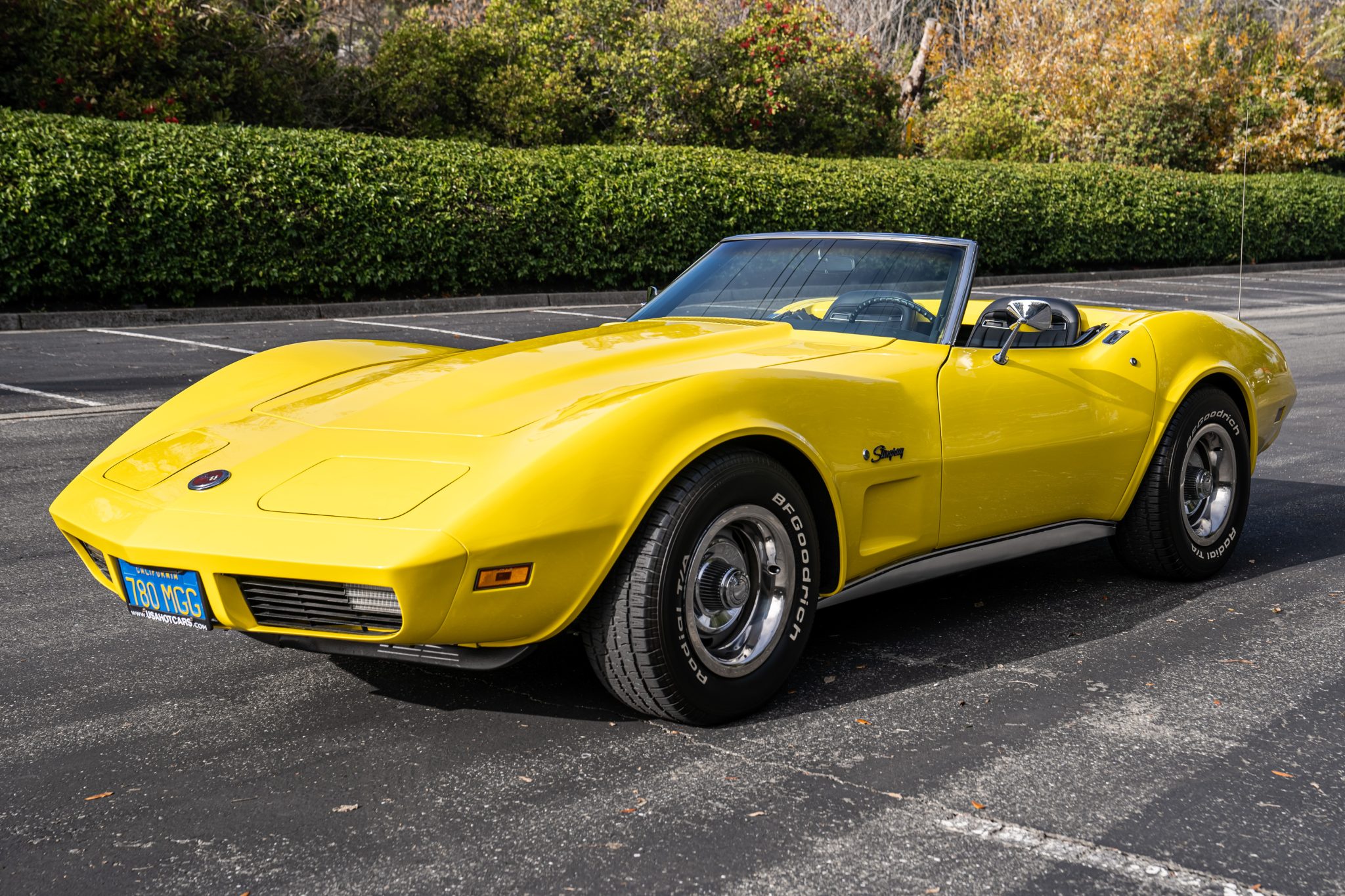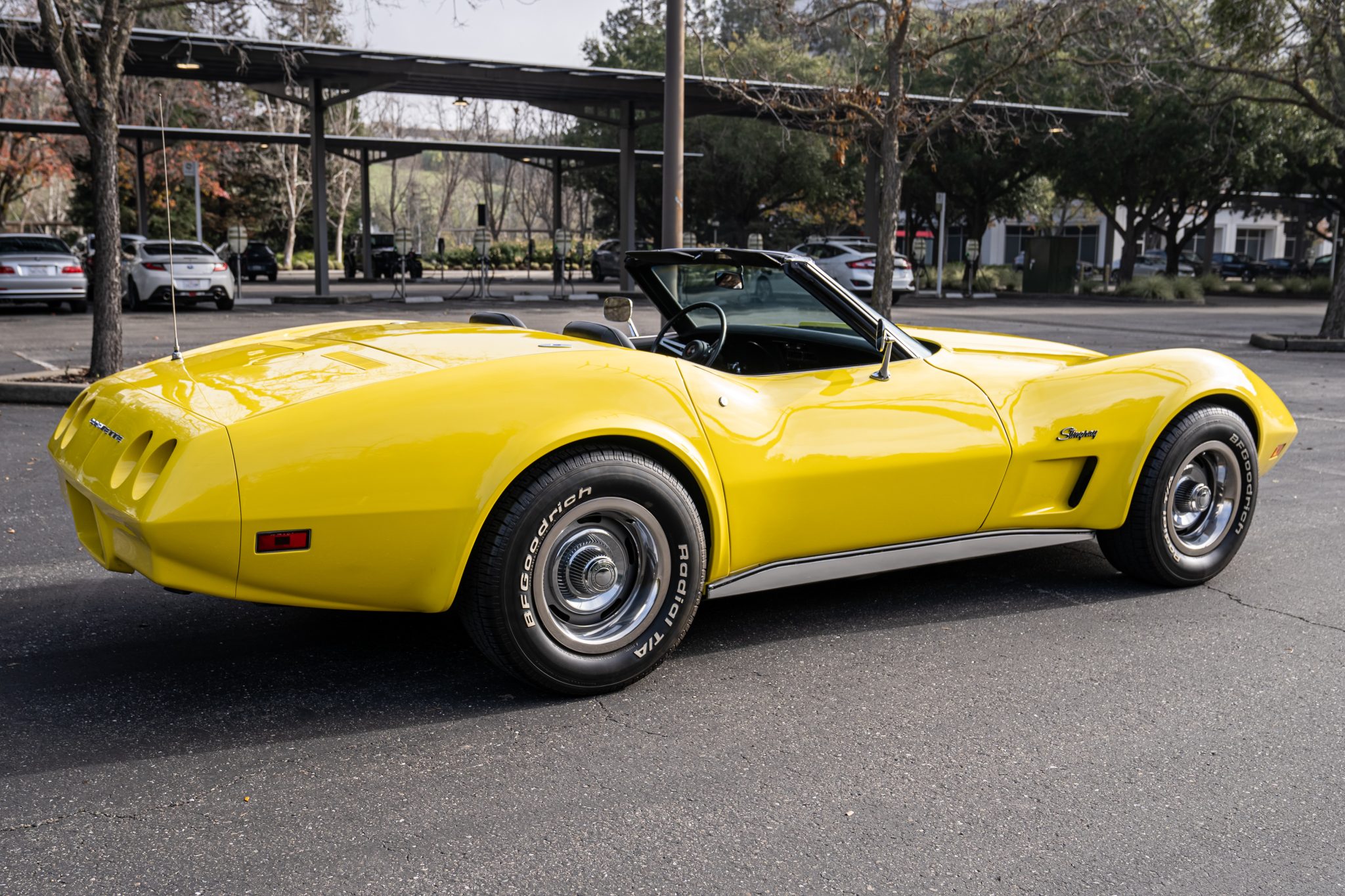 Silver-finished 15″ Rally wheels wearing bright hubcaps and trim rings are wrapped in 255/60 BFGoodrich Radial T/A tires. The car features power steering and a four-wheel independent suspension. Stopping power is provided by power-assisted four-wheel disc brakes with ventilated rotors.