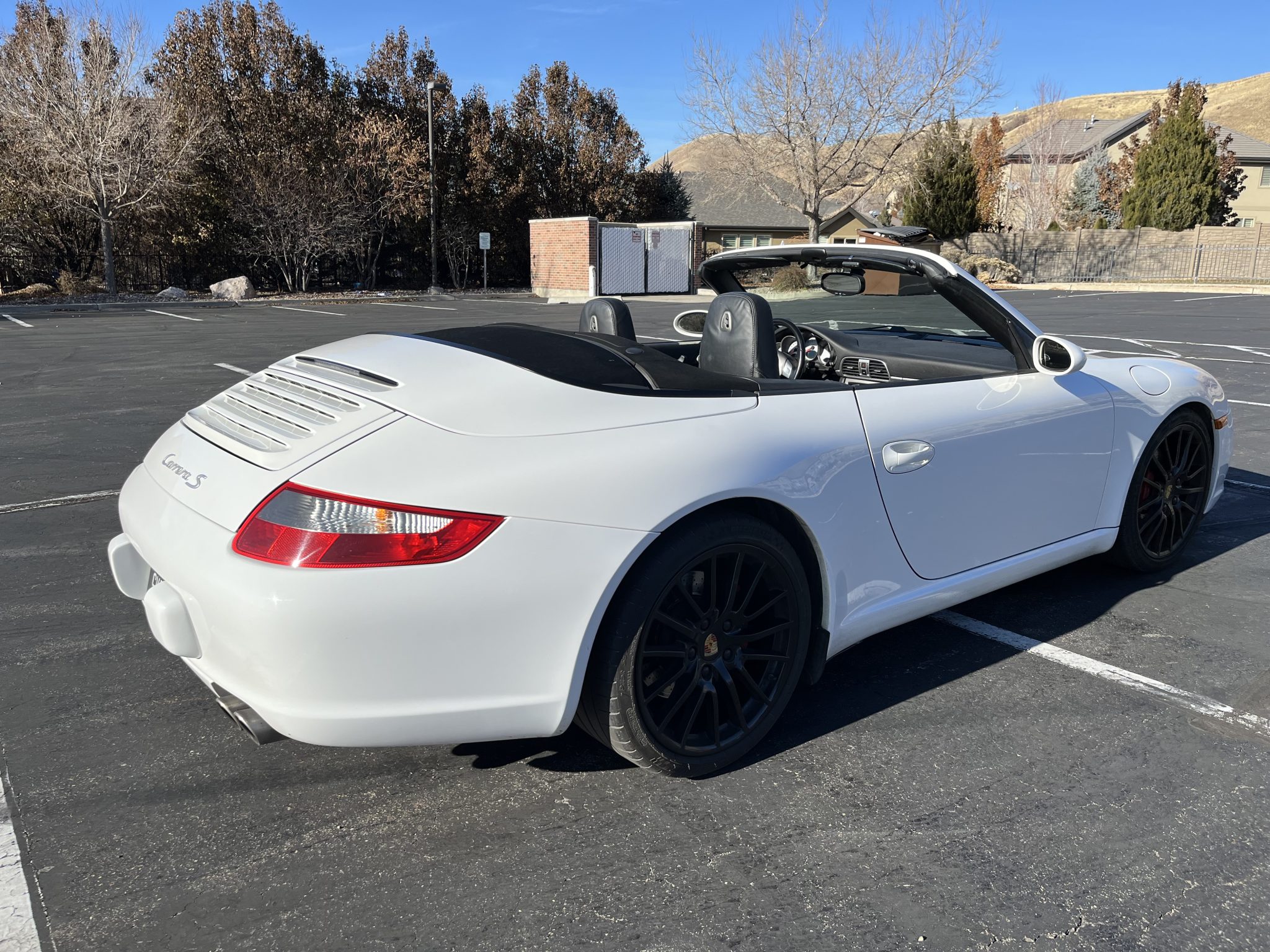 Black-finished 19″ Sport Design wheels are wrapped in 235/35 front and 295/30 rear Michelin Pilot Super Sport tires produced in 2017. Braking is handled by multi-piston Porsche-branded brake calipers fitted over cross-drilled and vented rotors at each end. The car is equipped with Porsche Active Suspension Management (PASM) as well as Porsche Stability Management (PSM), an active brake differential (ABD), and Anti-Slip Regulation (ASR). The outer tie-rod ends were replaced in May 2024.