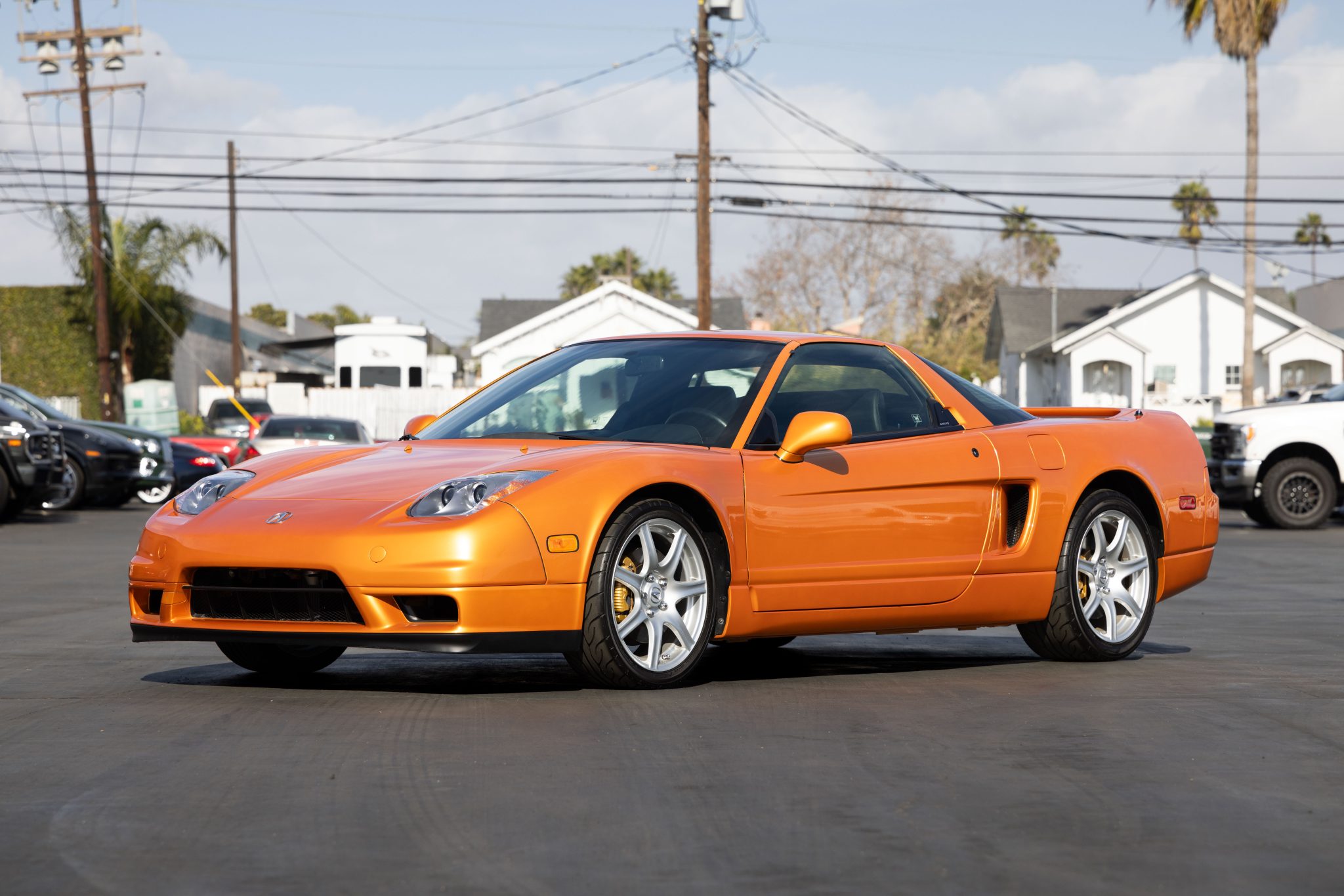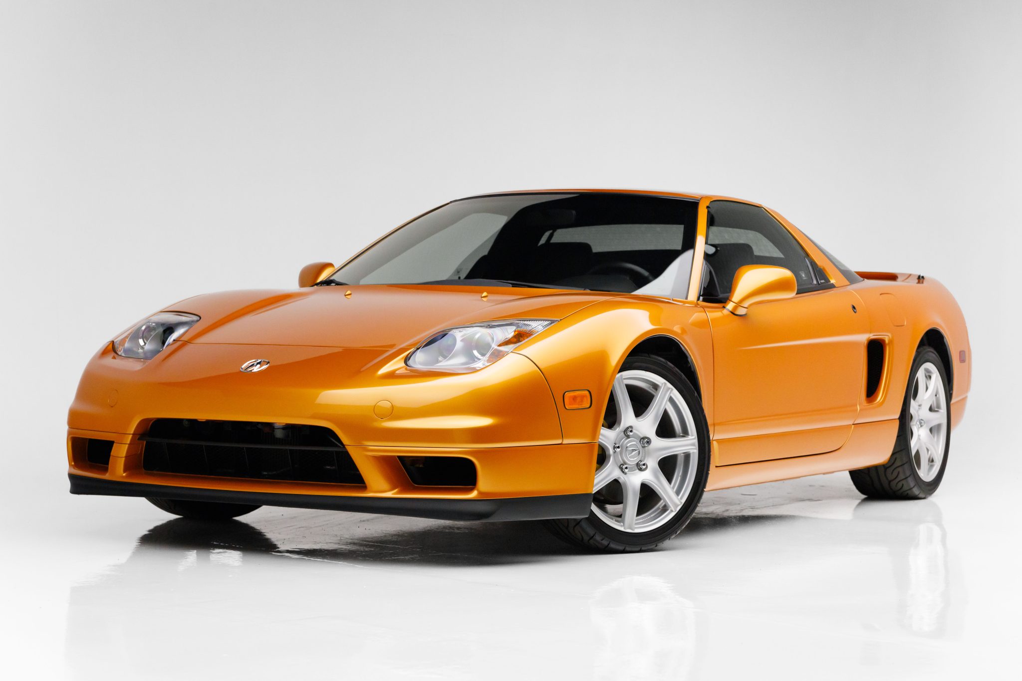 The 17″ forged wheels are mounted with staggered-width Yokohama tires. The car features a four-wheel double-wishbone suspension with front and rear stabilizer bars, and braking is handled by gold-finished NSX-branded calipers over vented rotors at each corner. Blemishes are visible on the front wheels.