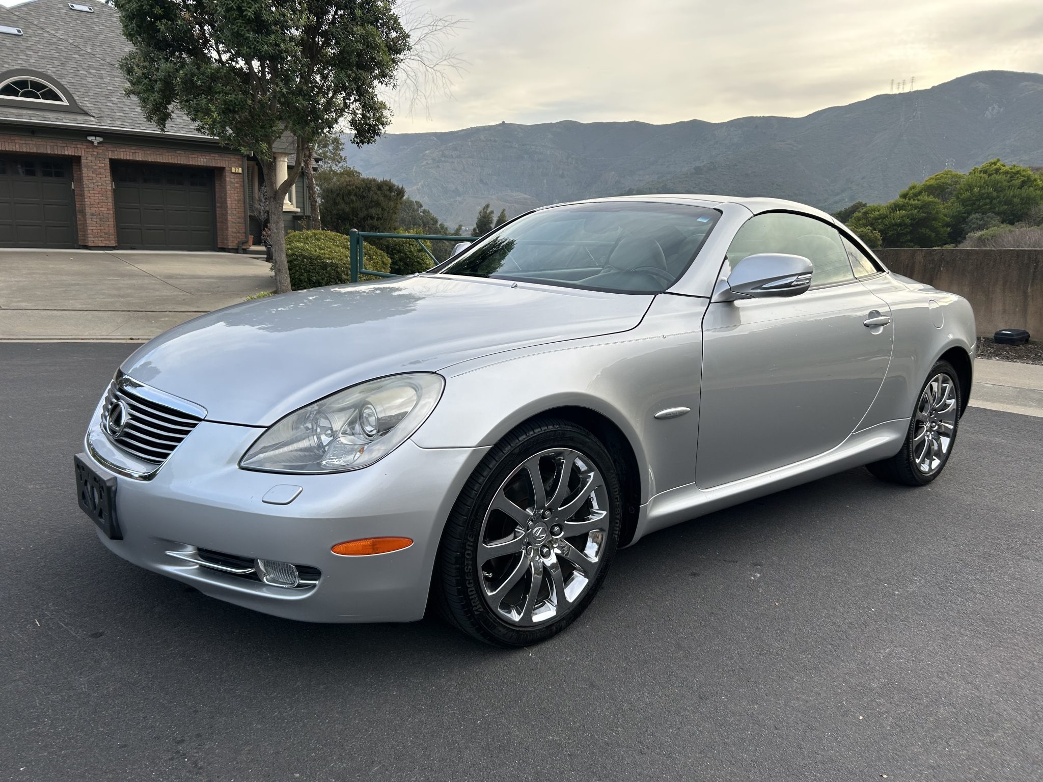 The 18″ chrome-finished wheels are mounted with 245/40 Bridgestone Potenza RE980 AS tires. The car is equipped with traction control and four-wheel independent double-wishbone suspension, and braking is handled by four-wheel disc brakes with ventilated front rotors. Scratches and curb marks are visible on the wheels.