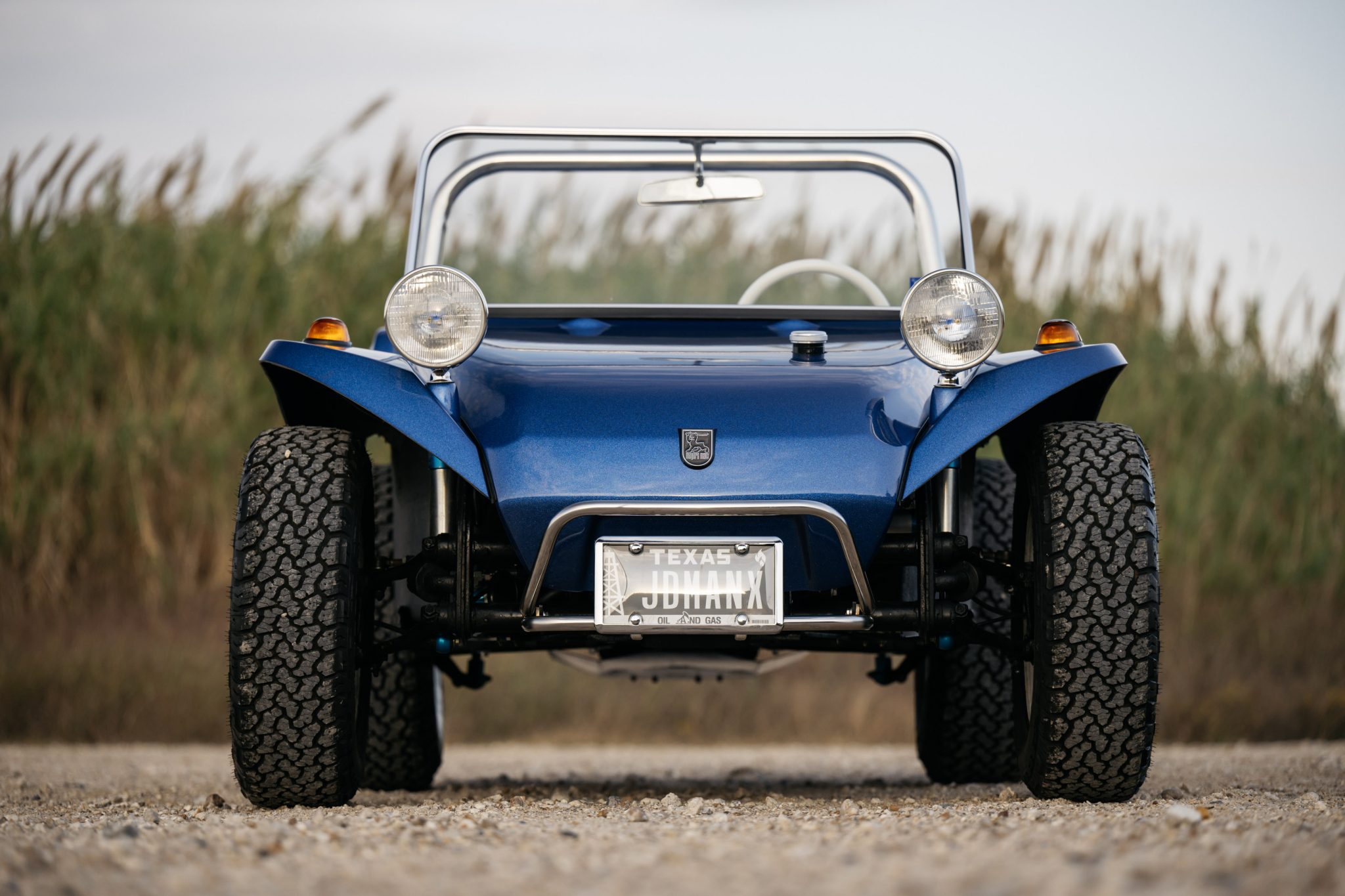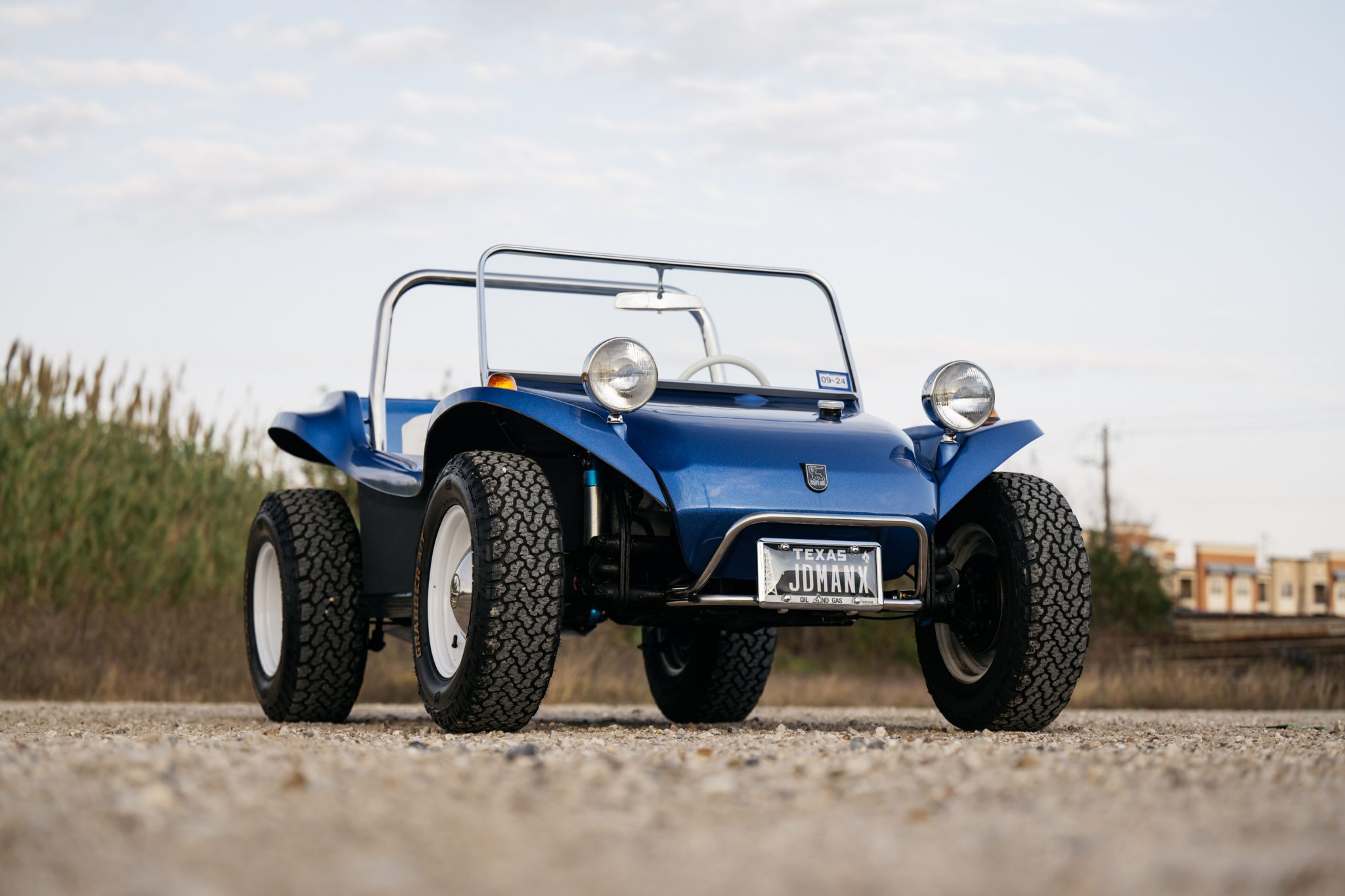 The white-painted Wide-5 “smoothie”-style wheels are wrapped in General Grabber A/T white-letter tires. The four-wheel drum brakes were overhauled and remote-reservoir shocks were fitted. The brake lights intermittently stay illuminated after the brake pedal is released.