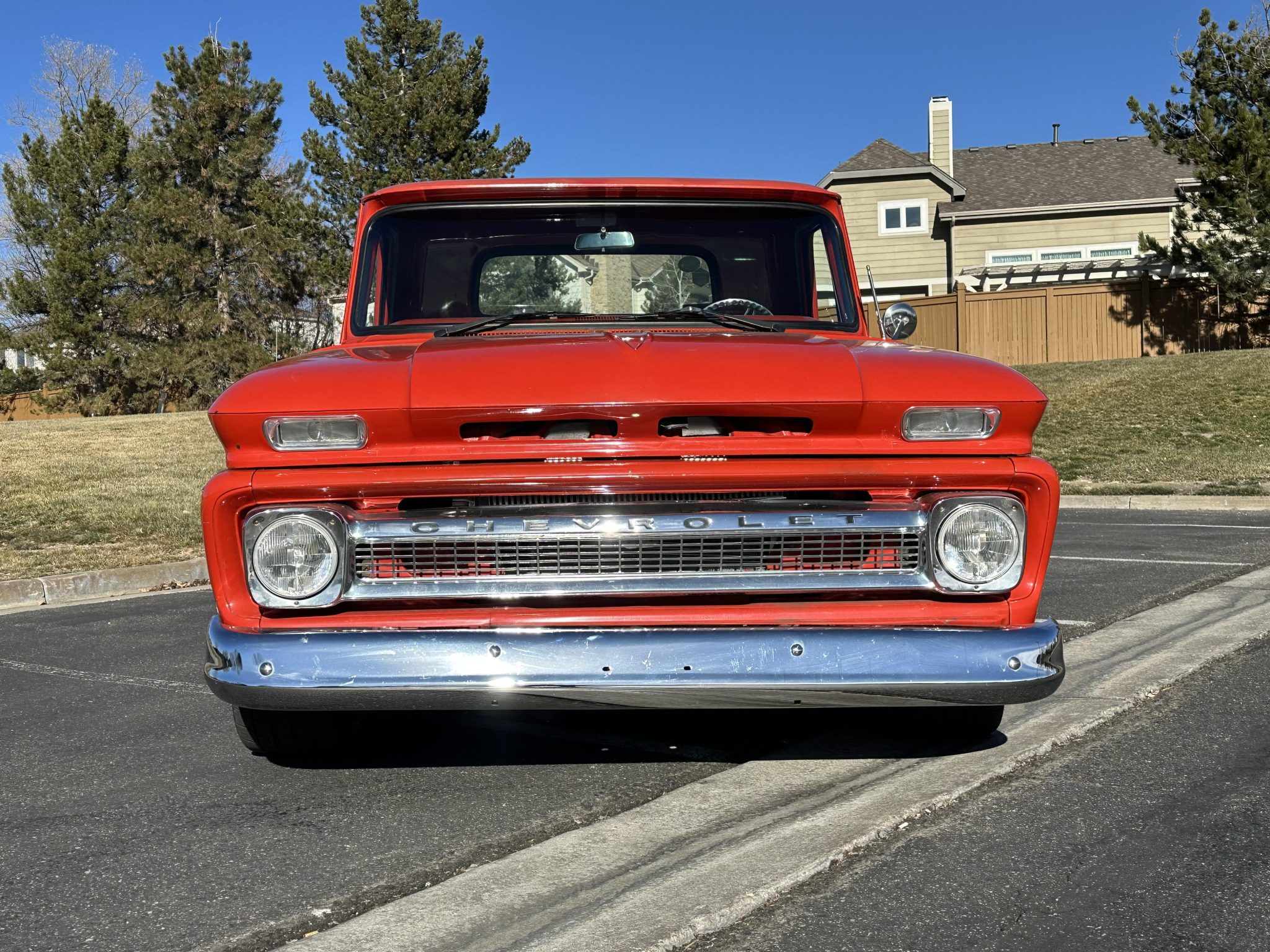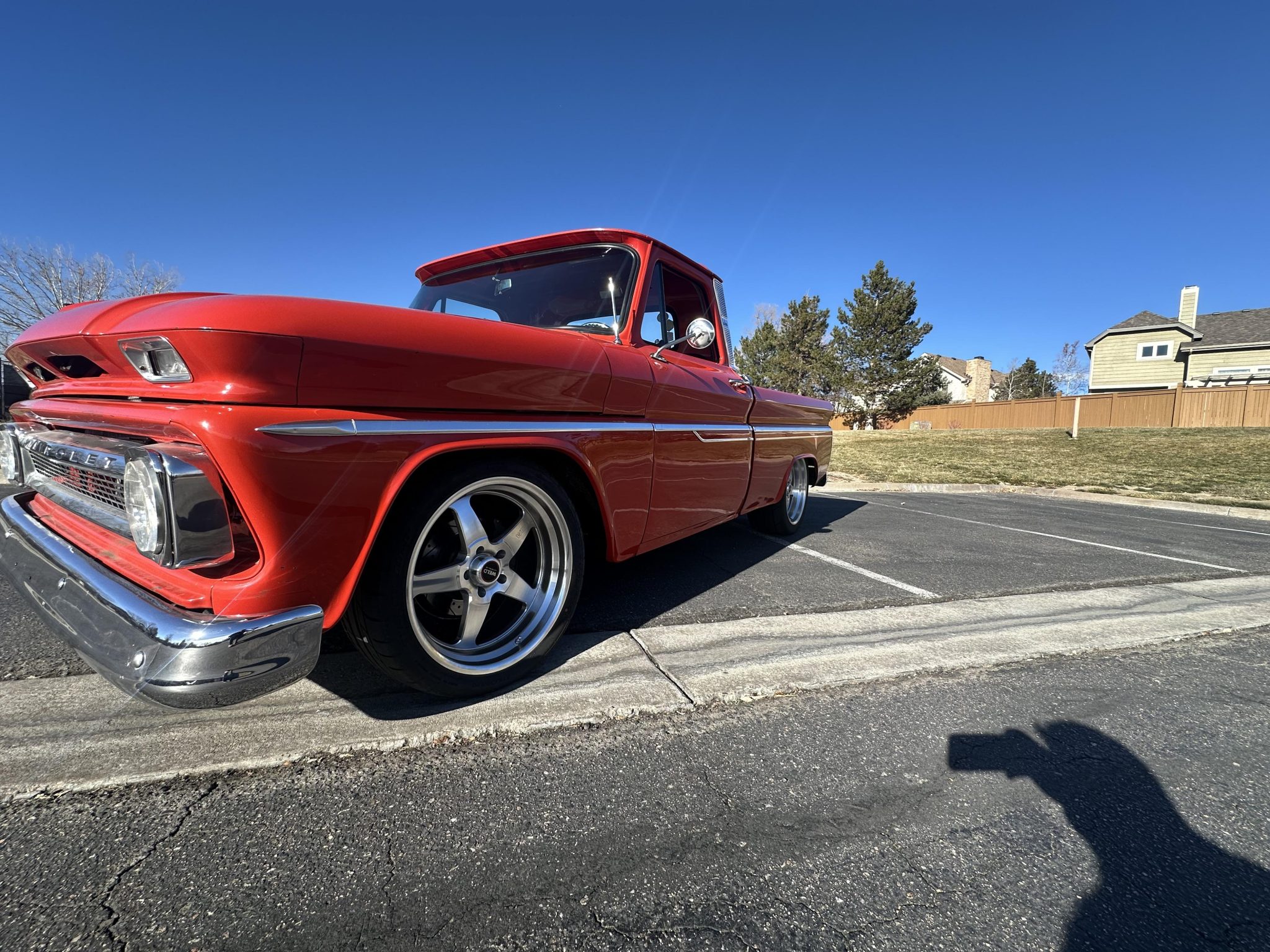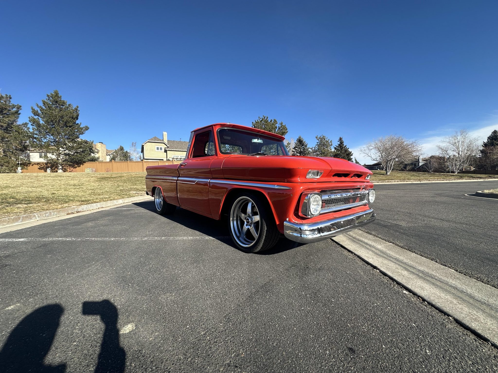 The pickup bed was refurbished with red oak slats and aluminum runners with hidden mounting fasteners, and larger rear wheelhouses were installed to accommodate the larger wheel and tire package.