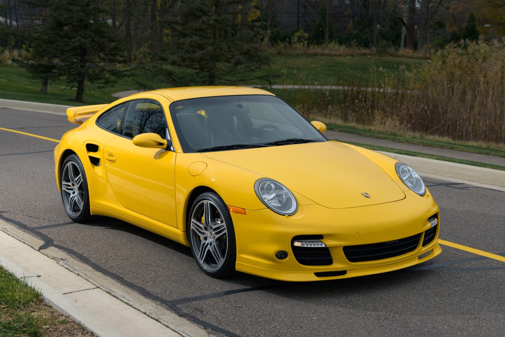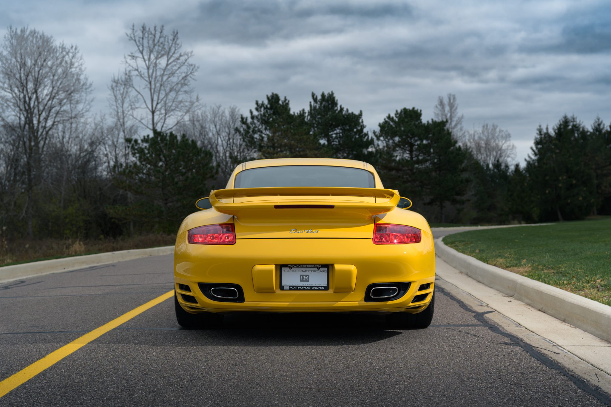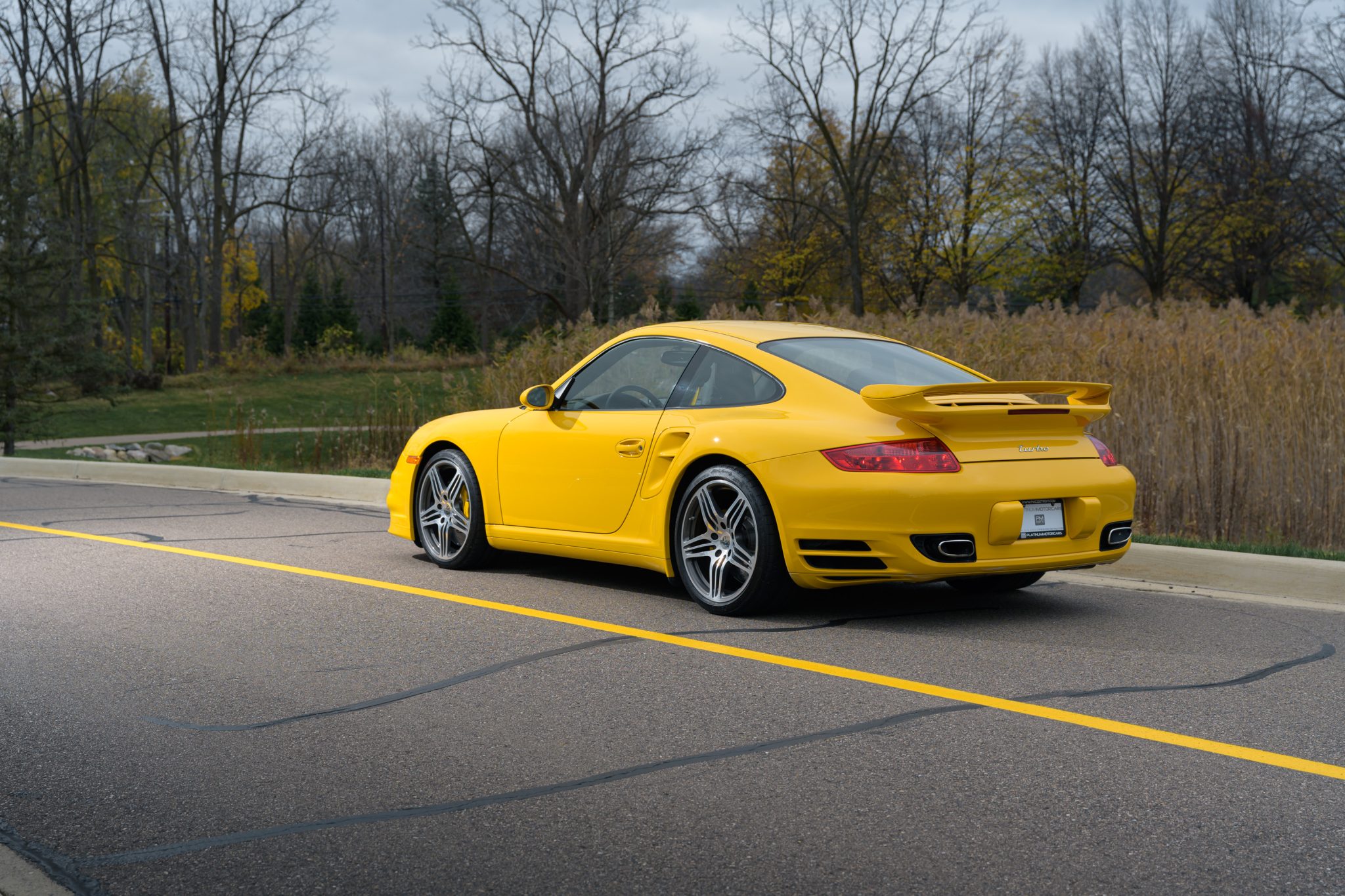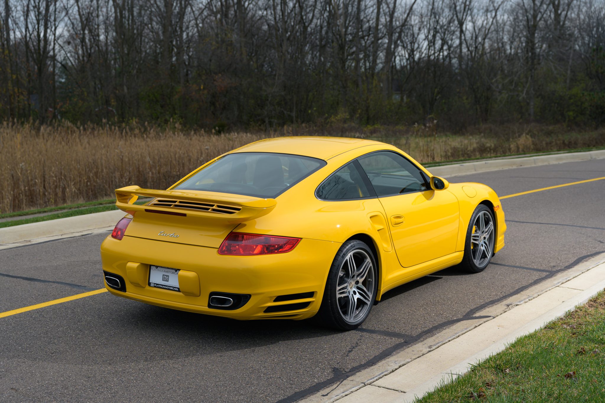 The forged 19″ Turbo wheels are mounted with 235/35 front and 305/30 rear Michelin Pilot Sport tires. The brake system features six-piston front and four-piston rear calipers over ceramic-composite rotors. Porsche Active Suspension Management (PASM) and Porsche Stability Management (PSM) are additional elements.