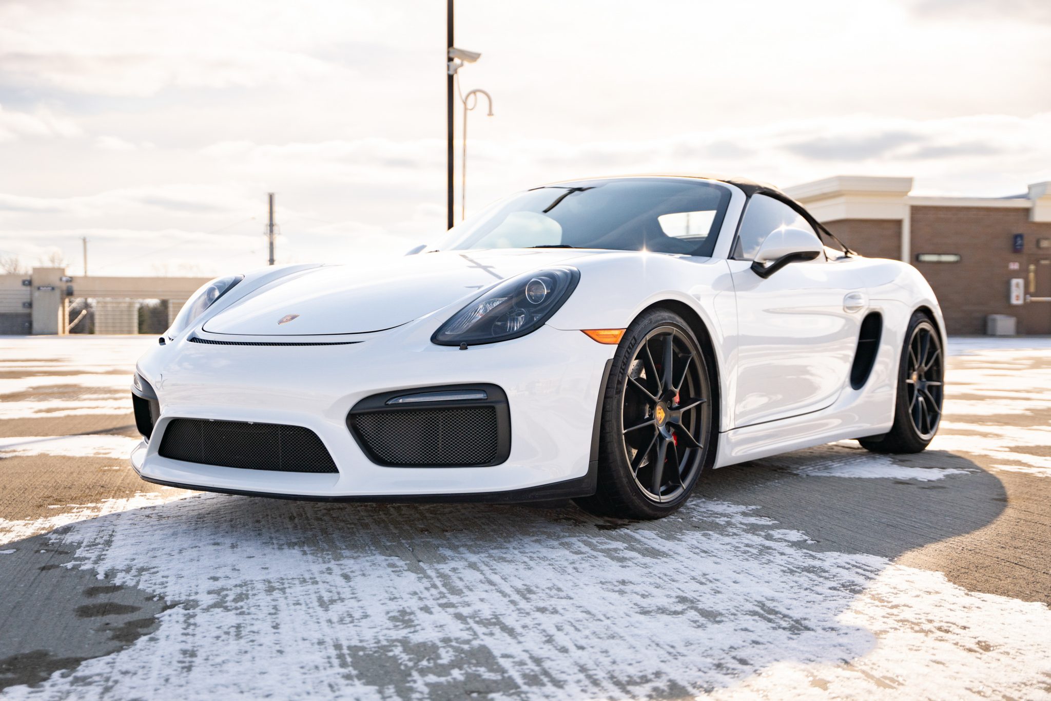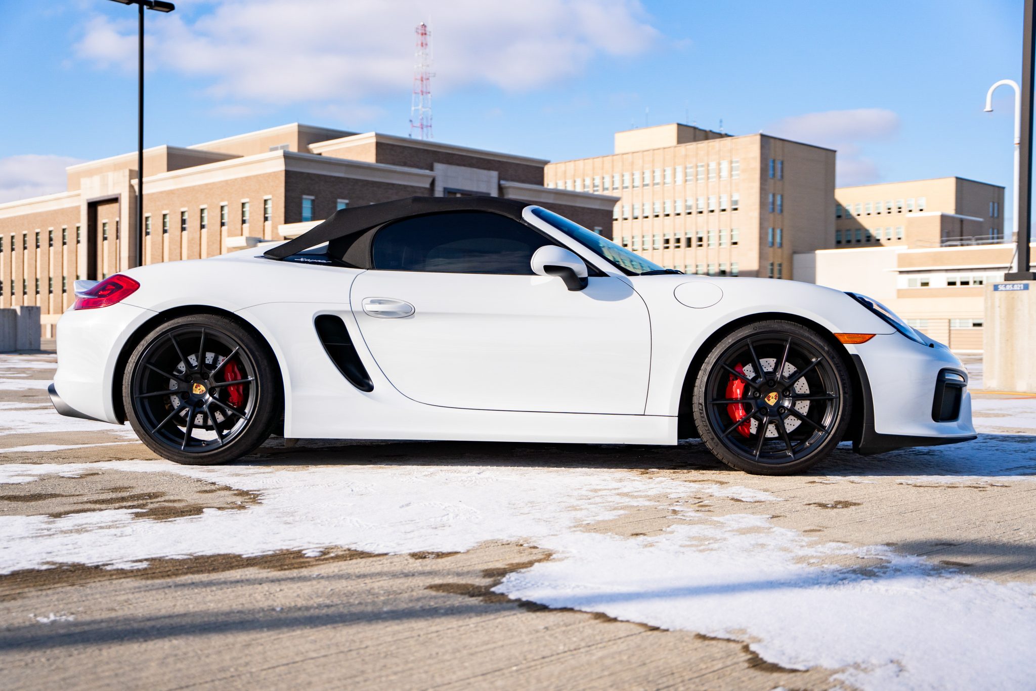 Satin black 20″ Spyder alloy wheels are mounted with Michelin Pilot Sport 4S front and Pilot Super Sport rear tires. Braking is handled by four-wheel cross-drilled and ventilated discs with red-painted Porsche-branded calipers. Boxster Spyders were equipped from the factory with a 20mm lower sport suspension than the standard Boxster. An electromechanical steering rack that was shared with the contemporary 911 Turbo was also fitted as standard.