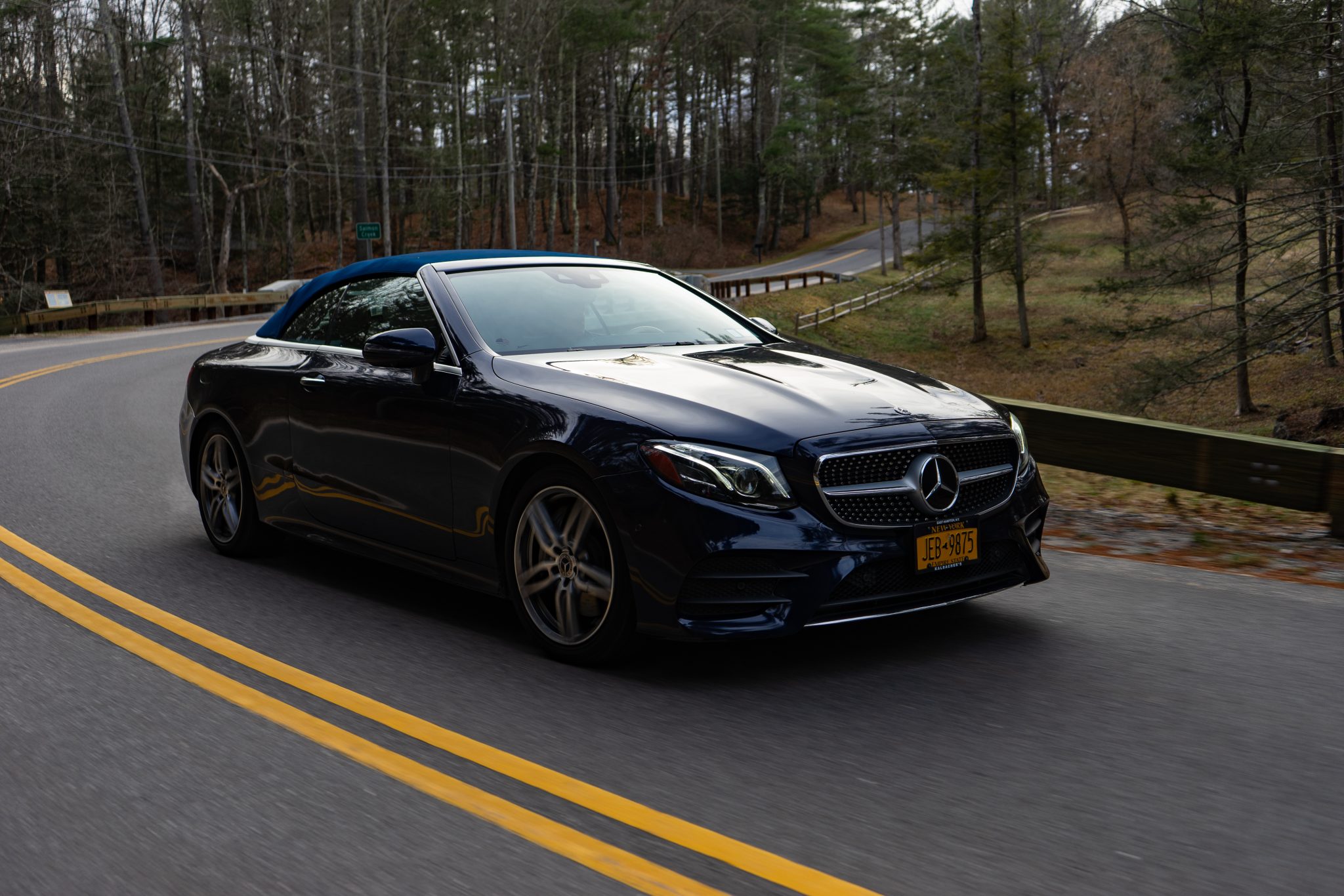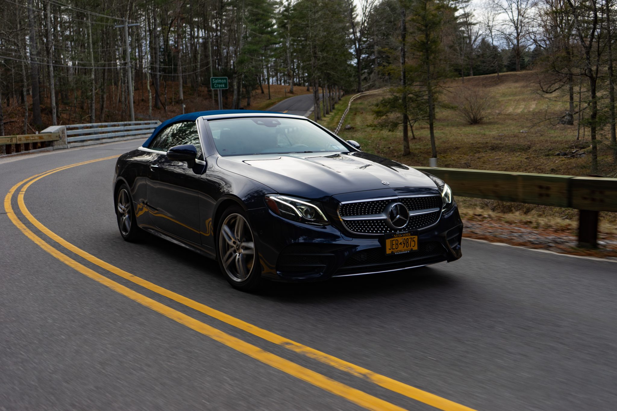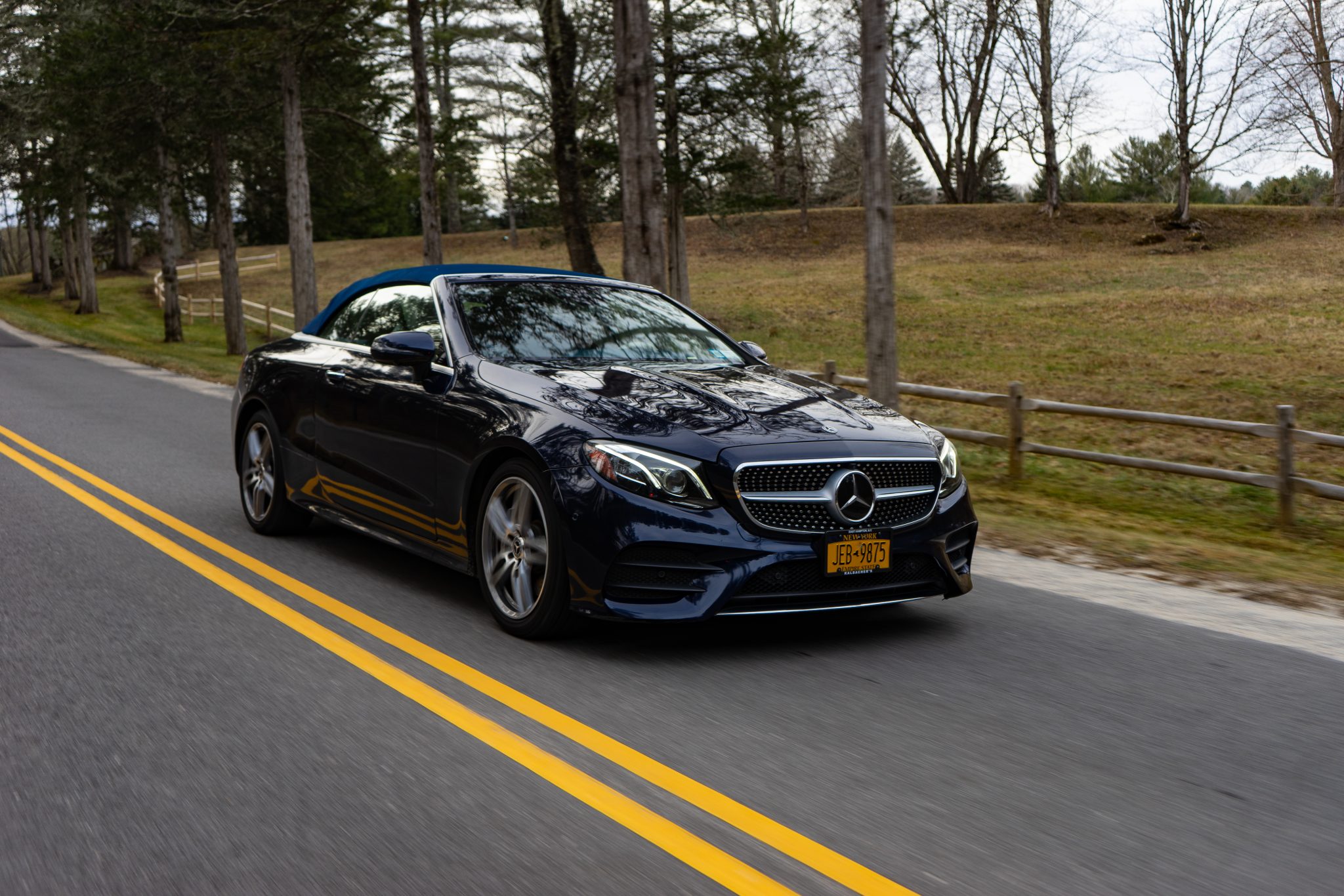 The 19″ AMG twin five-spoke wheels show curb rash and are mounted with Bridgestone Driveguard Plus front tires and Goodyear Eagle Sport rears. Braking is handled by discs at each corner.