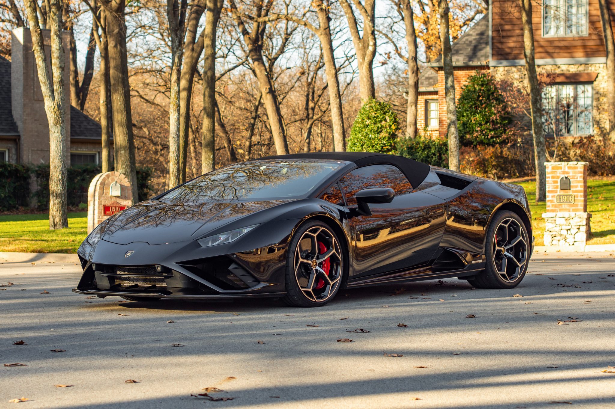 The 20″ Aesir wheels feature high-gloss black inserts and are mounted with staggered Pirelli P Zero tires. The carbon-ceramic disc brakes feature red Lamborghini-branded calipers, and the car is equipped with Lamborghini dynamic steering, a front-end lift system, and electronic traction control.