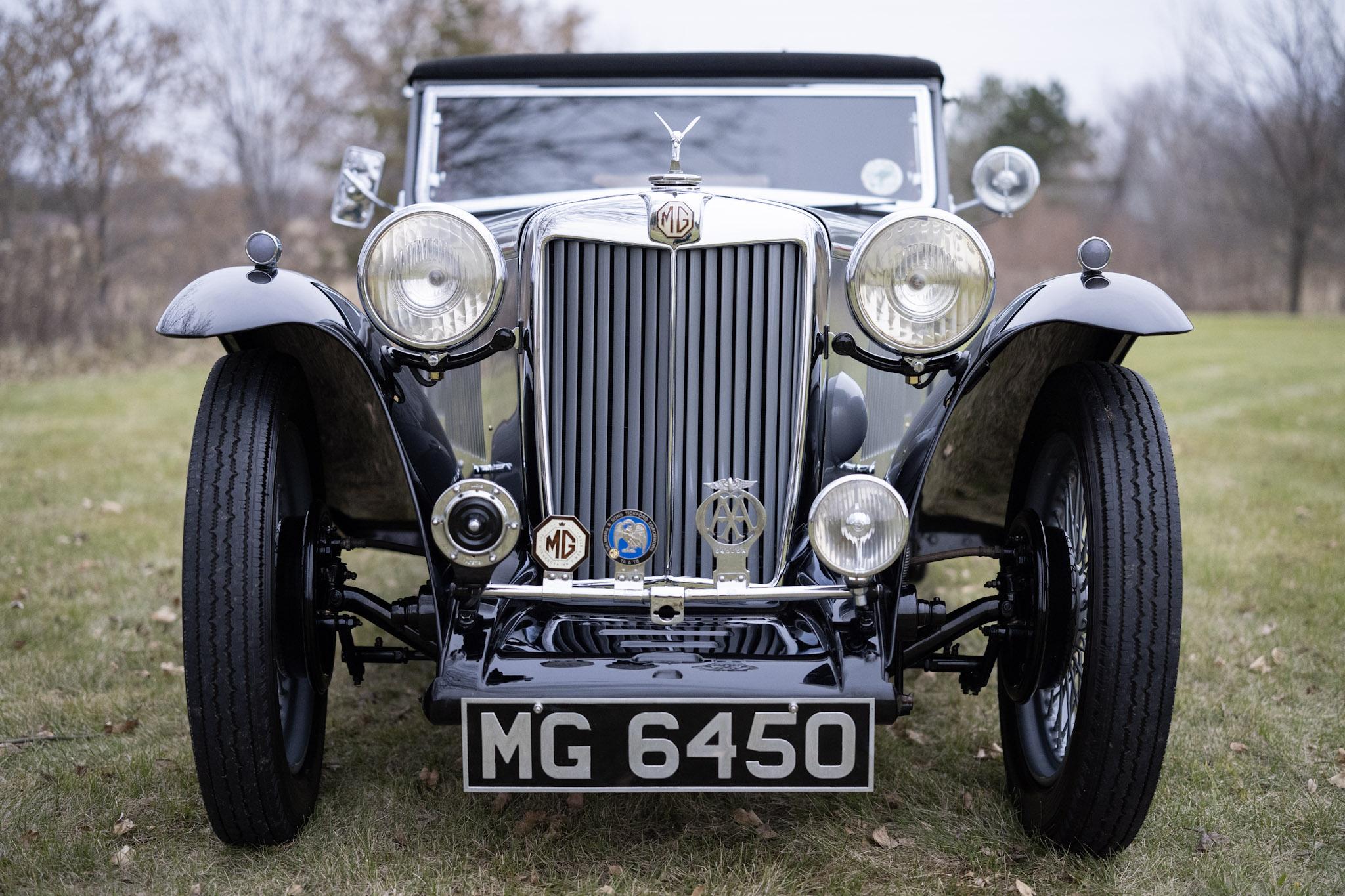 This example was refinished in metallic gun-metal gray with red pinstriping and black fenders during the refurbishment performed between 1987 and 1990, which included repairs to the ash framework and body panels. Features include rear-hinged doors, a badge bar hosting a single driving lamp, a midge radiator mascot, trafficators, a passenger-side spotlamp, a rectangular driver-side mirror, and a black convertible top designed to be used fully open, fully closed, or covering the rear shelf area only. A 1939-expiring UK tax disc is affixed inside the windshield.