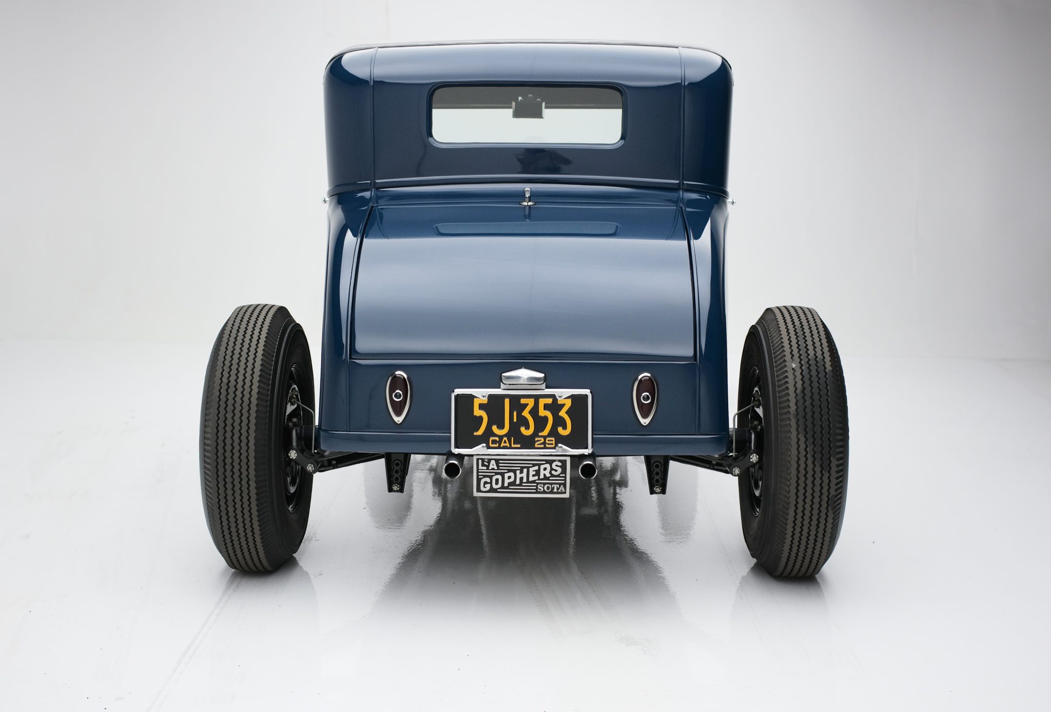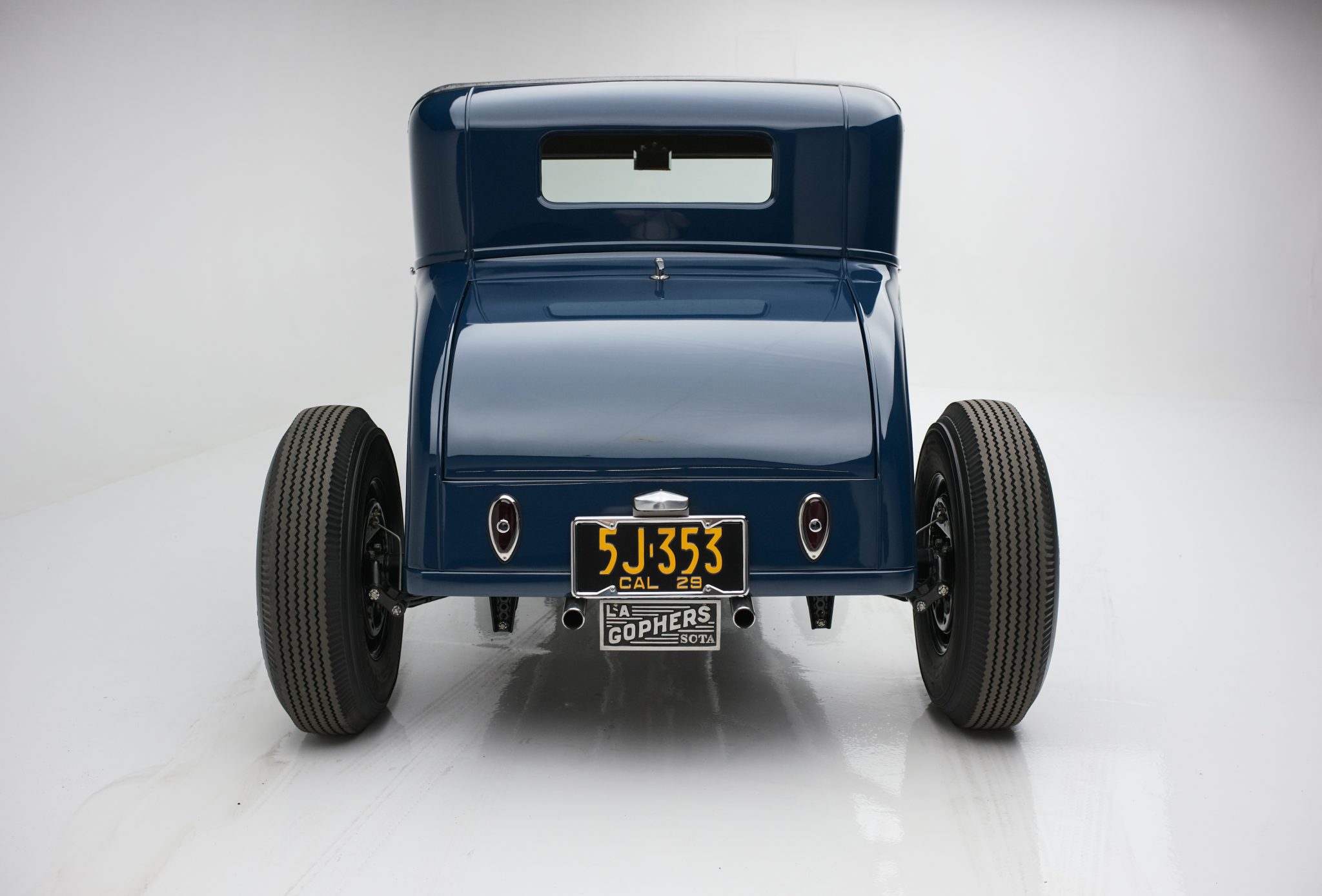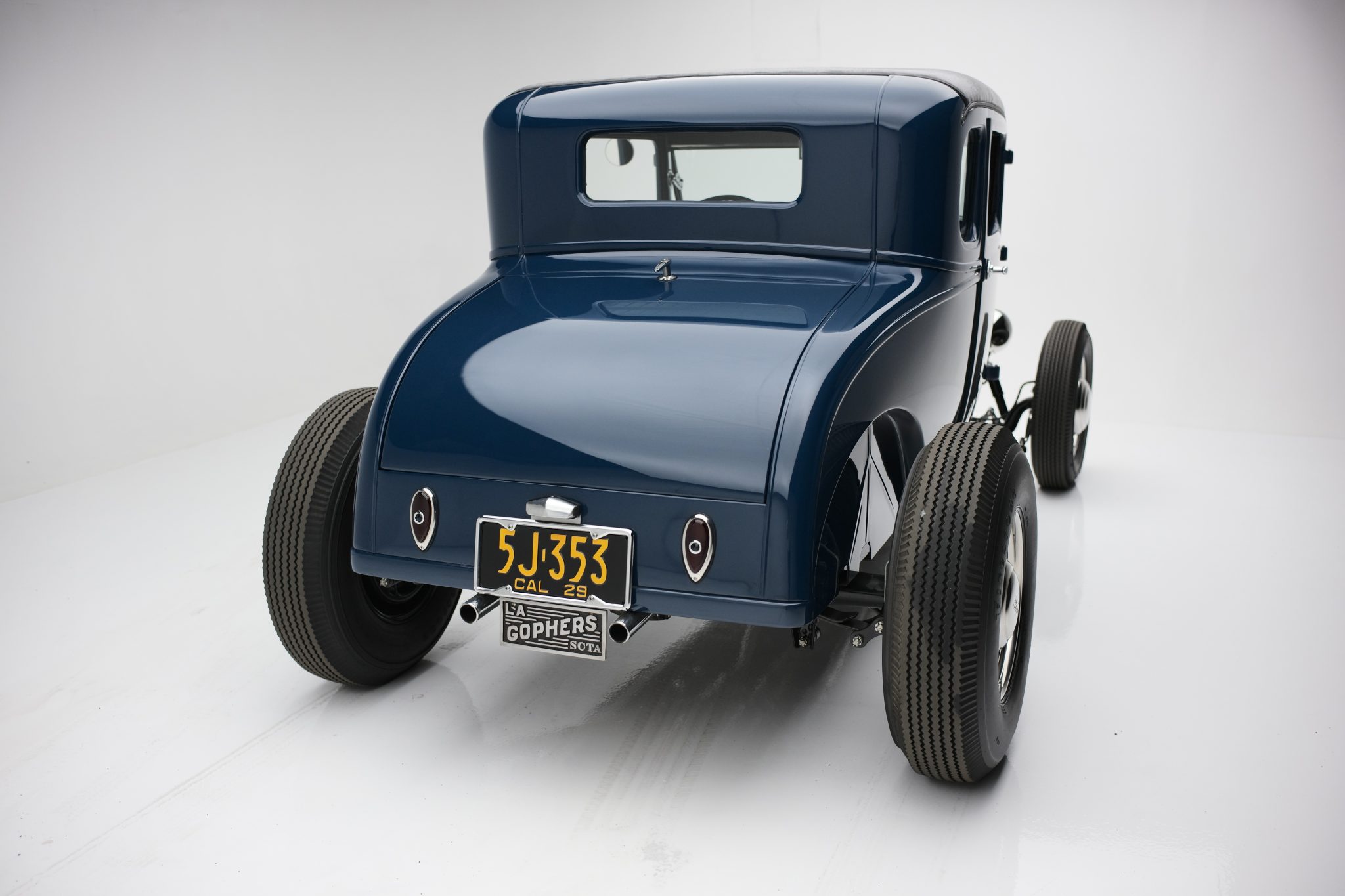 Staggered-width 16″ steel wheels wear chrome trim rings and hubcaps and are mounted with “big and little” 5.50 front and 7.50 rear Firestone Deluxe Champion bias ply tires. The car rides on transverse leaf springs front and rear along with a drop front axle and an F1-sourced steering box. Stopping power is provided by hydraulically actuated drum brakes all around.