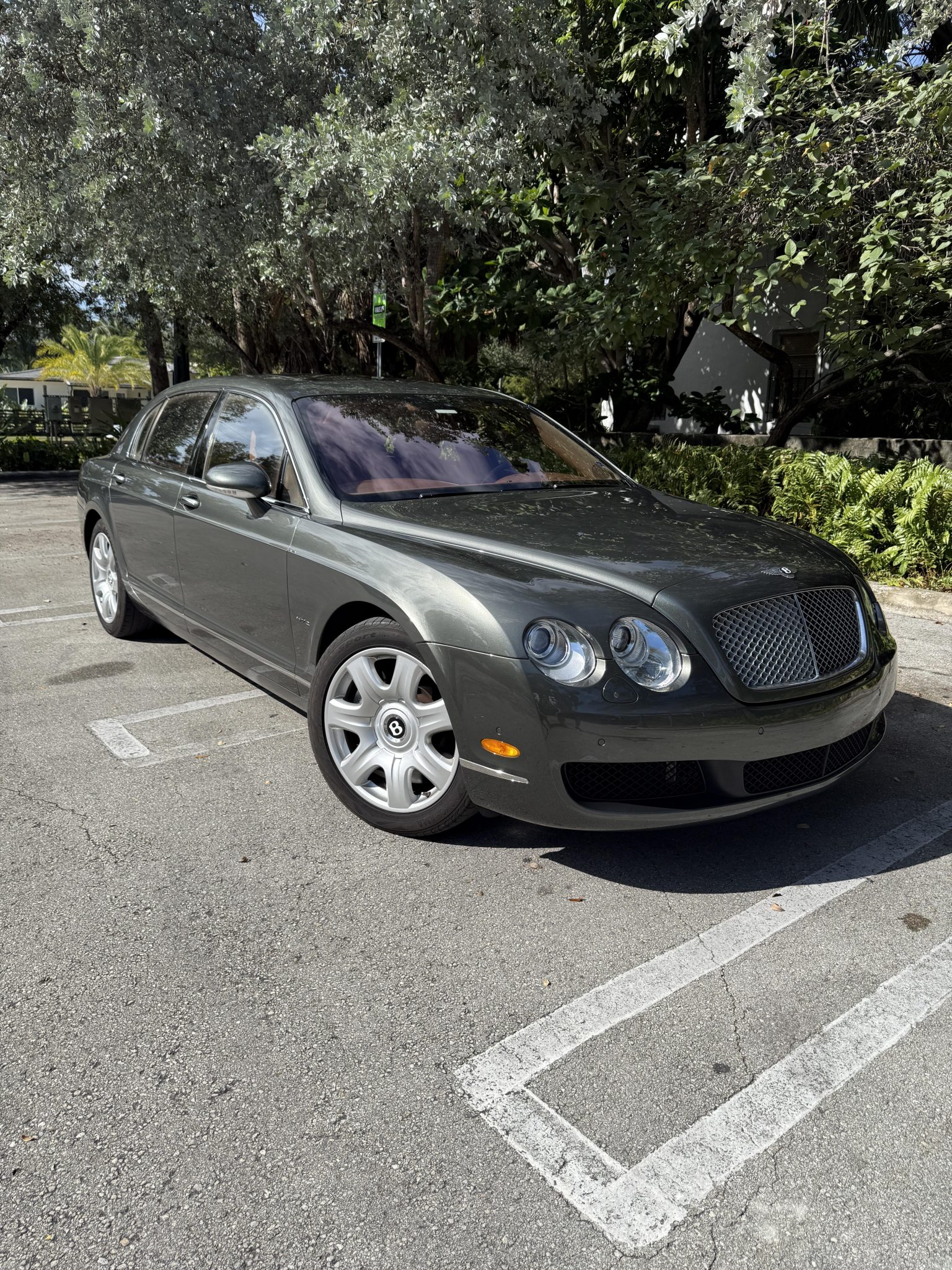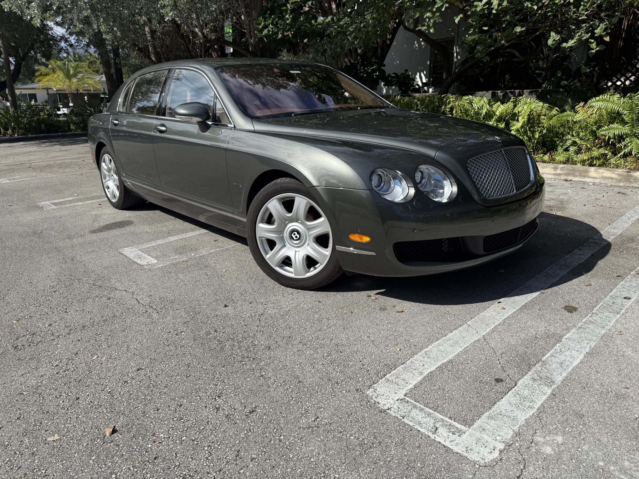 The 19″ seven-spoke alloy wheels are mounted with Yokohama Advan Sport tires. Braking is handled by Bentley-branded calipers fitted over ventilated discs at each corner. The car came factory equipped with a self-leveling air suspension.