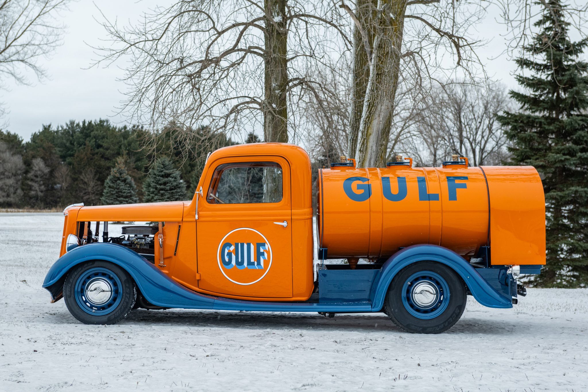 The 15” artillery wheels are finished in blue with Ford-branded hubcaps and are mounted with 225/70 Starfire Solarus tires. The truck rides on AFCO Racing adjustable coilovers and is further equipped with a Mustang II–style front end with rack-and-pinion steering as well as an adjustable rear torque arm and radius rods. Braking is handled by discs up front paired with drums out back.