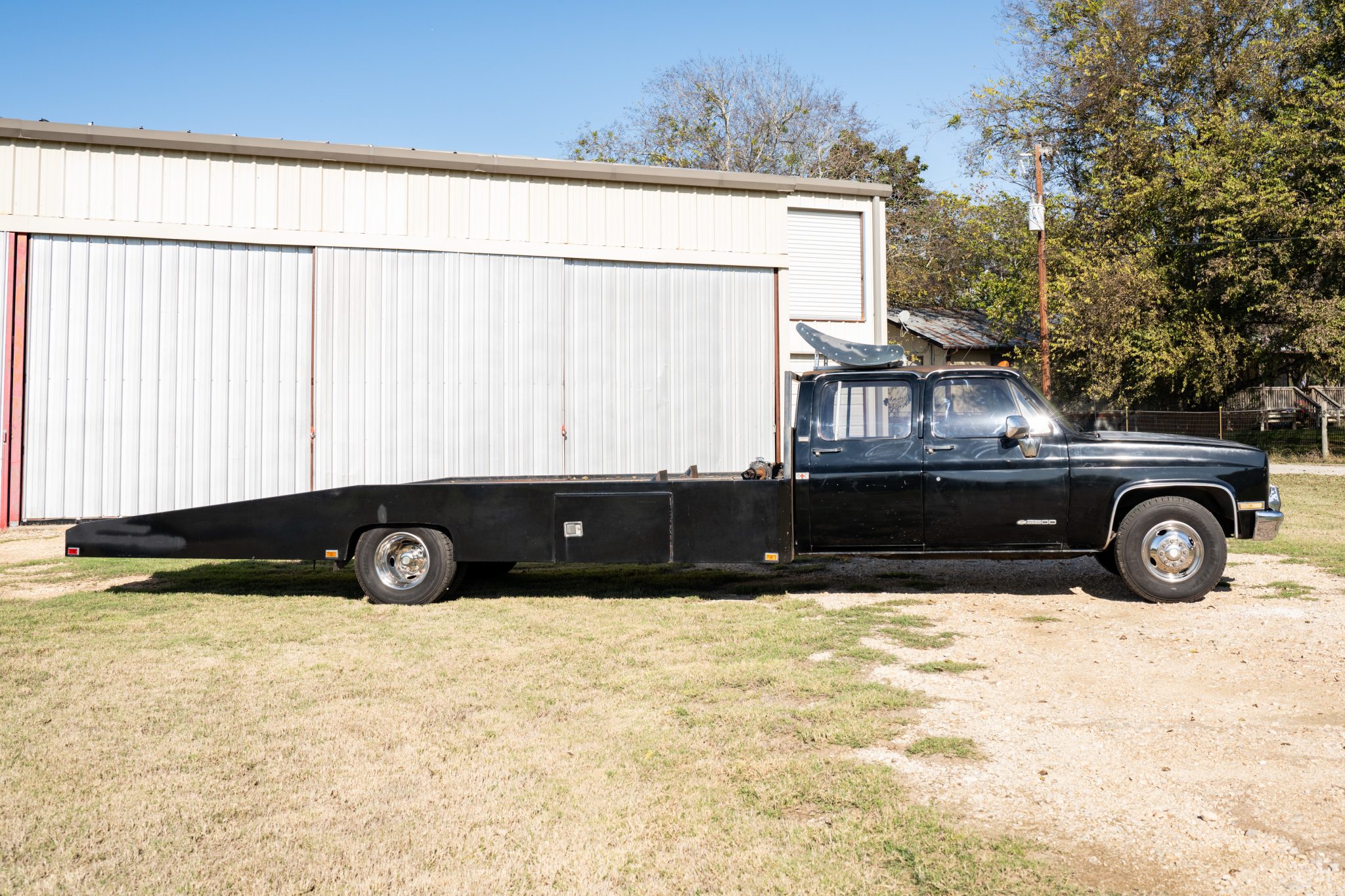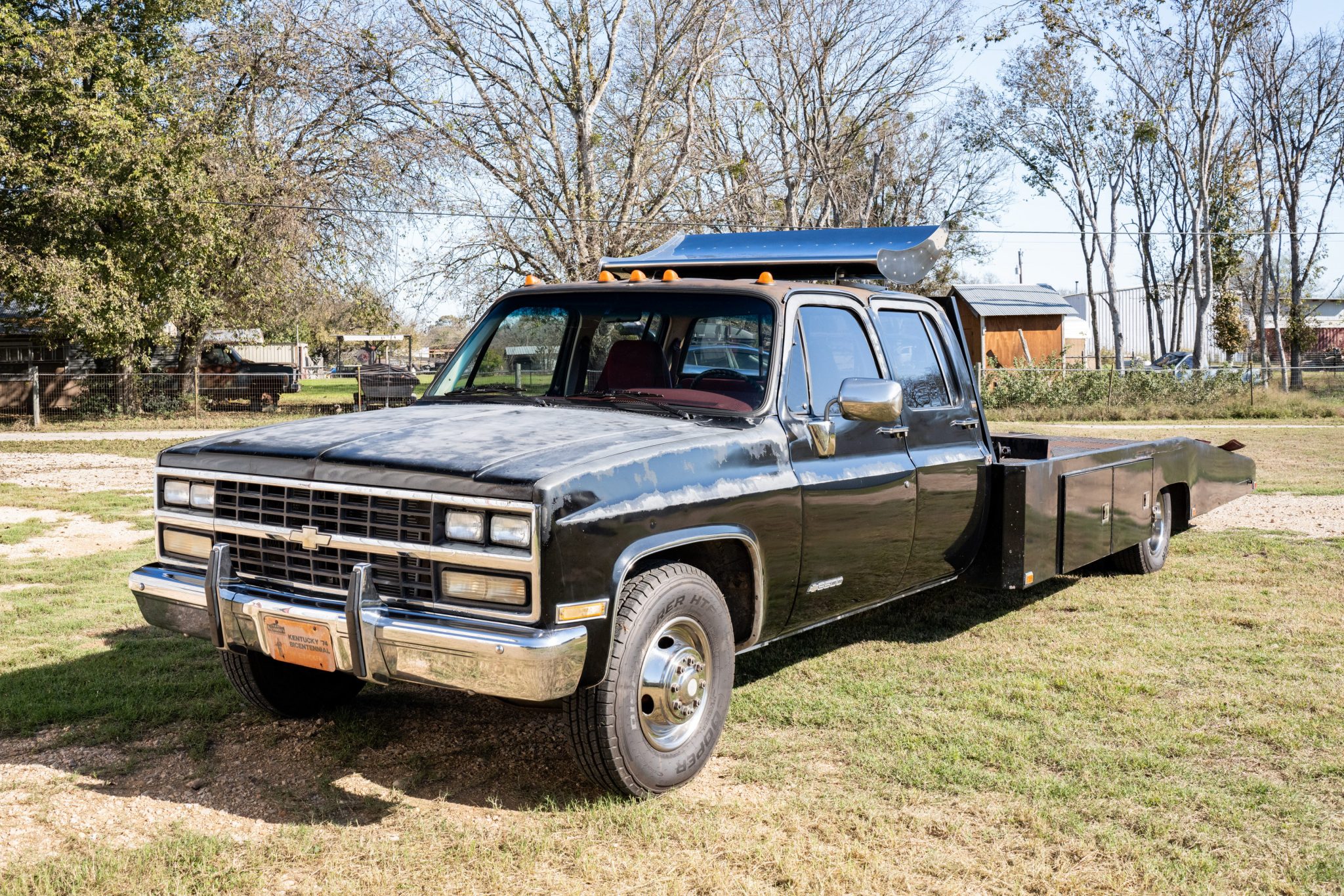 Chrome-finished eight-lug 16″ wheels are mounted with 235/85 Cooper Discoverer HTP tires that were replaced in February 2024. Braking is provided by power-assisted front discs and rear drums; the brake rotors and drums were replaced under current ownership, as were the shocks and the front and rear wheel bearings.
