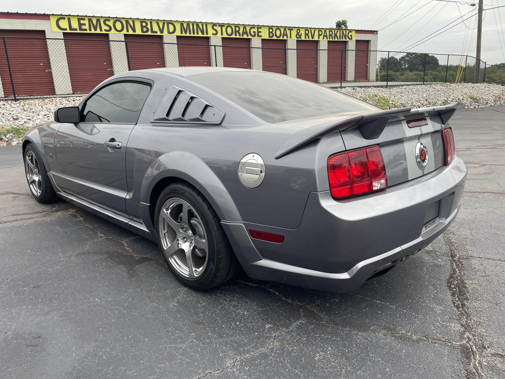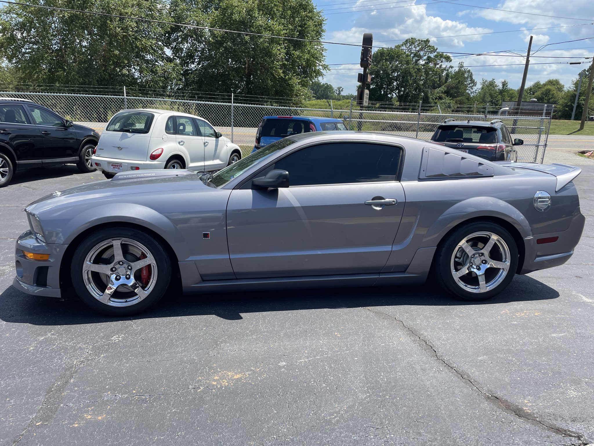 Chrome-finished 18″ Roush forged five-spoke wheels are mounted with Nitto NT05 tires with 2012 date codes. Roush suspension modifications consist of revised springs, dampers, and anti-sway bars. Stopping power is provided by red Roush-branded four-piston calipers over slotted 14″ two-piece rotors up front paired with the factory setup out back.