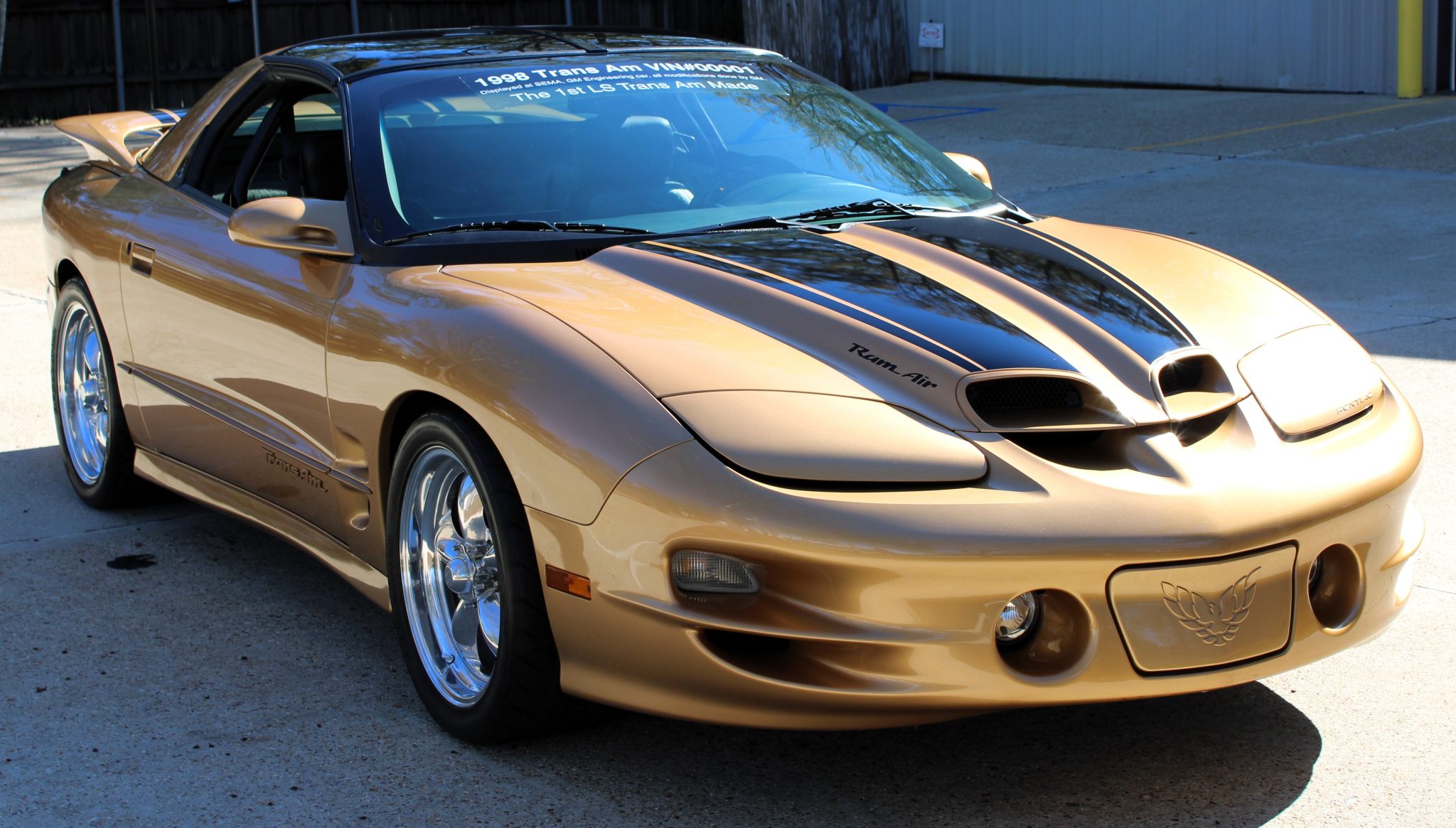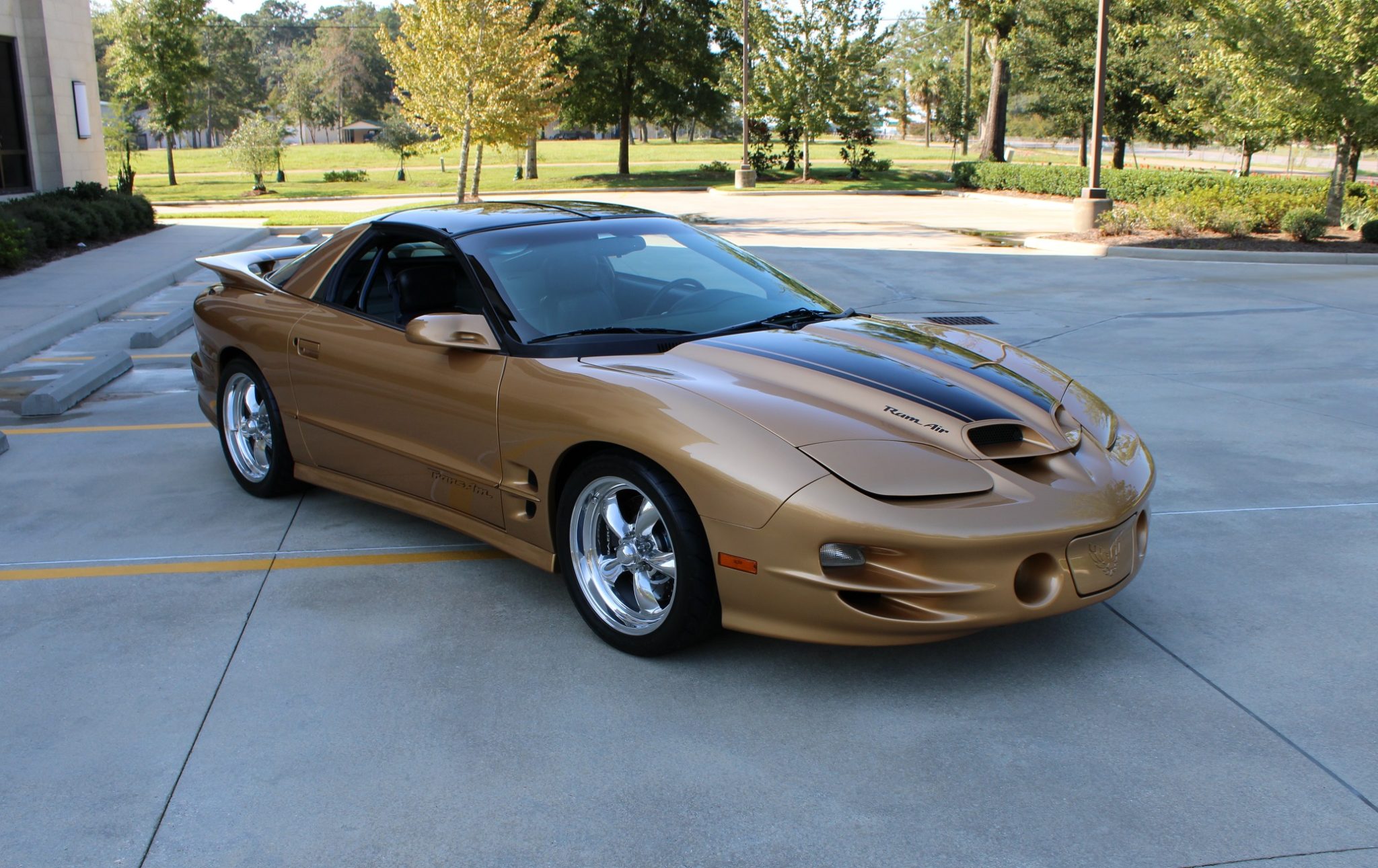 Sport Gold Metallic (380E) paint adorns the exterior and is accented by black stripes on the Ram Air hood and raised rear spoiler. Details include removable T-top roof panels, pop-up headlights, fog lights, and a Hurst-Equipped tail panel badge.