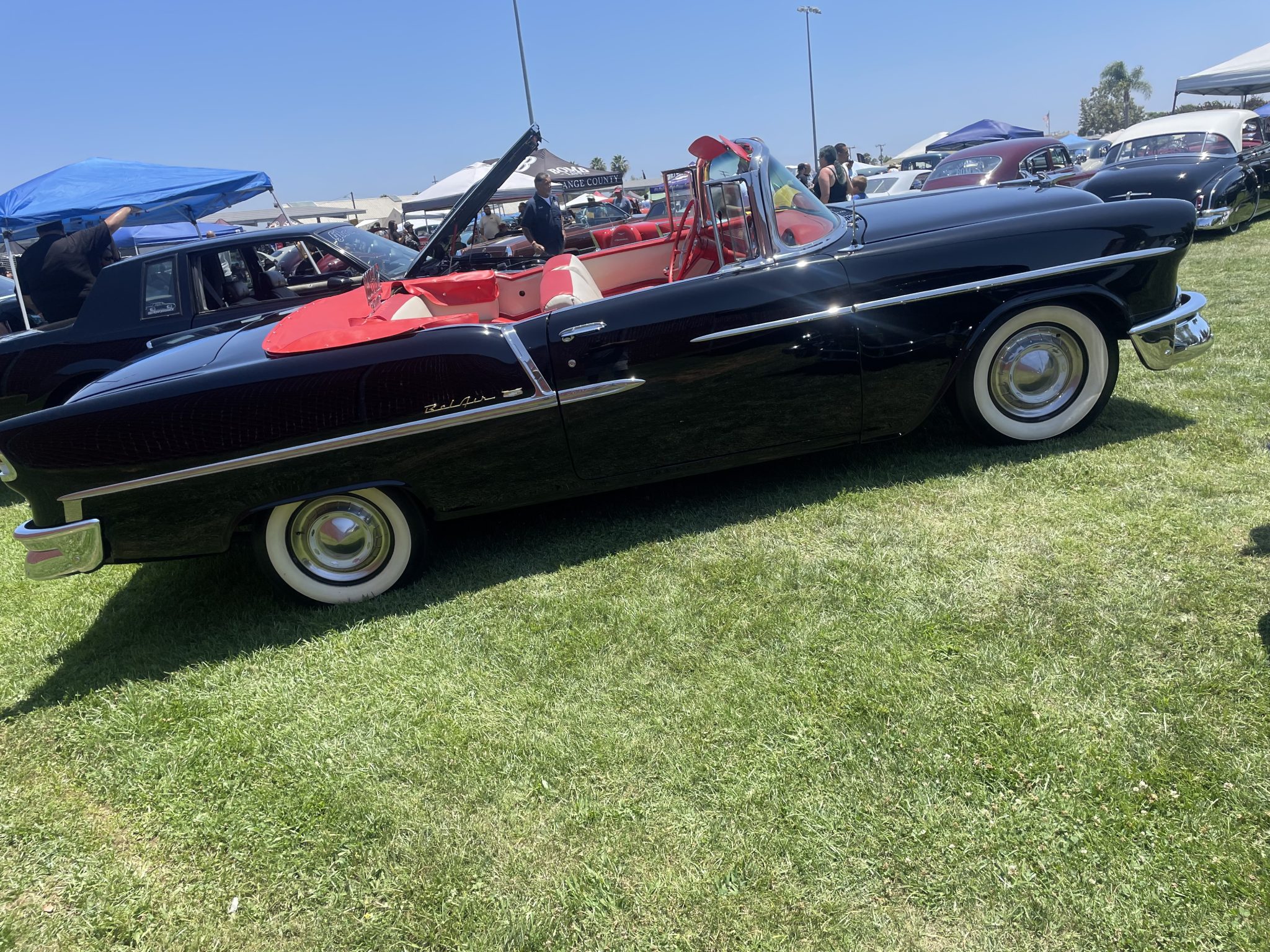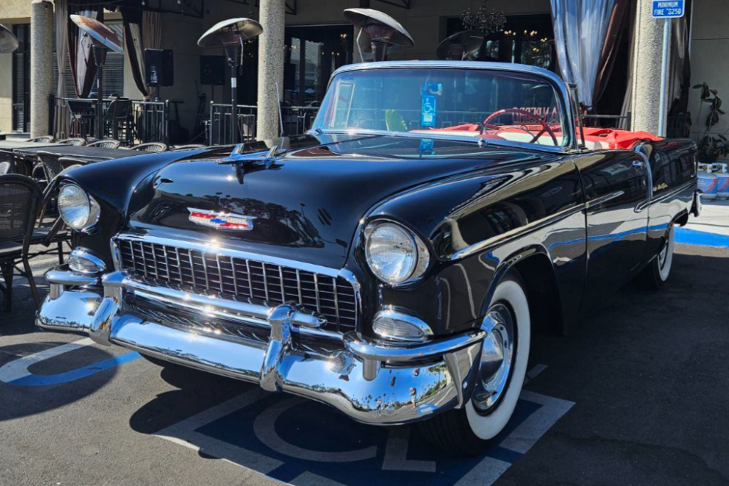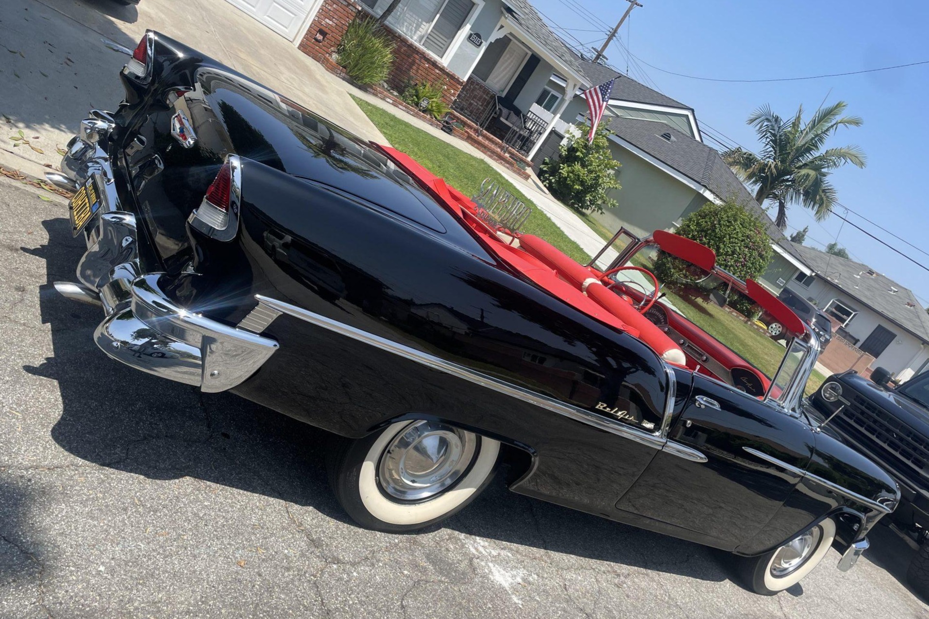 The 15″ body-color steel wheels wear bowtie covers and are mounted with older Cushion Ride whitewall tires. Braking is provided by front and rear drums.