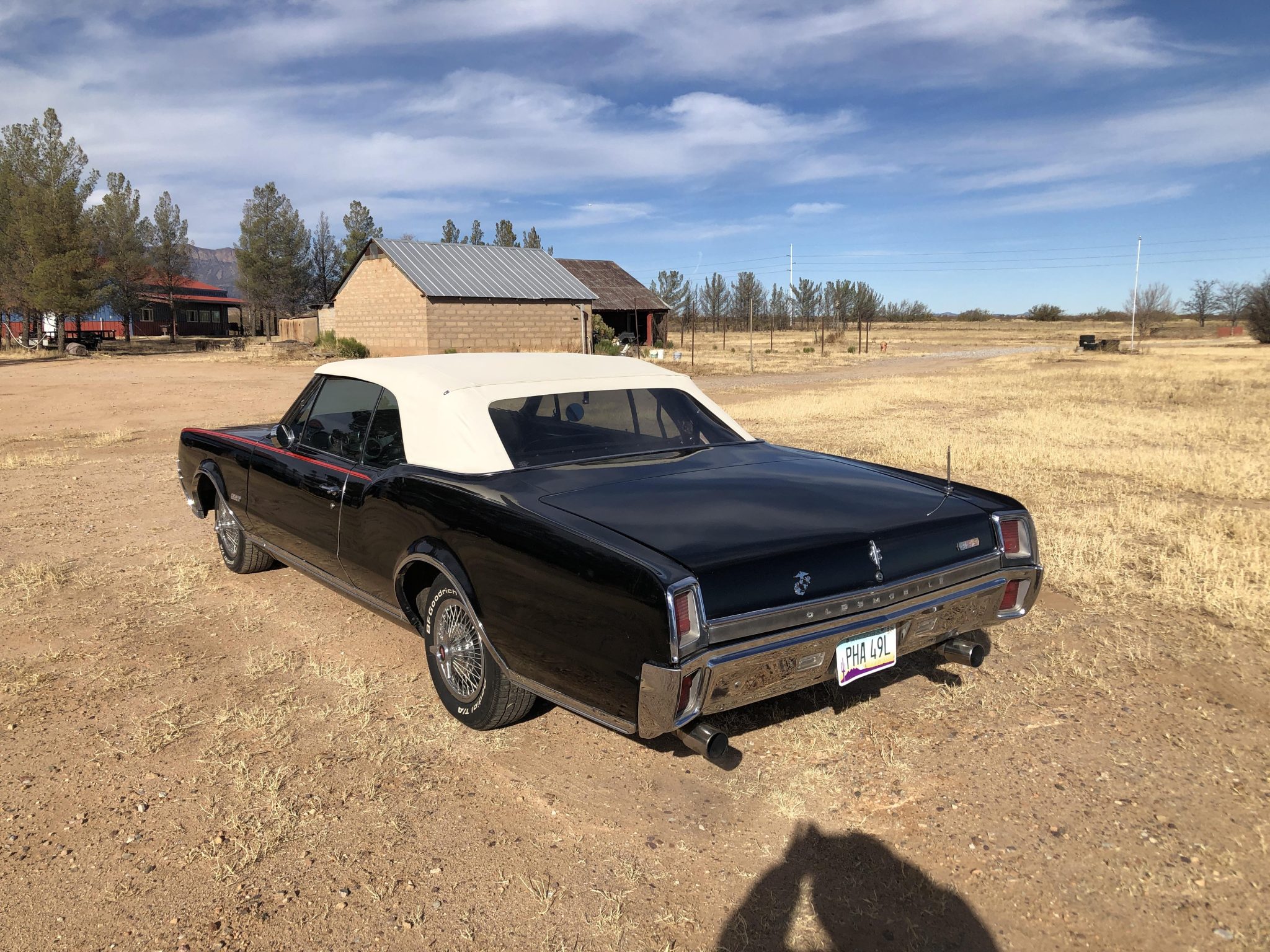 Black 14″ steel wheels wear wire-spoke wheel covers and are mounted with 205/70 BFGoodrich Radial T/A white-letter tires. A non-matching spare is located in the trunk. The car is equipped with power steering, and braking is handled by power-assisted drums.