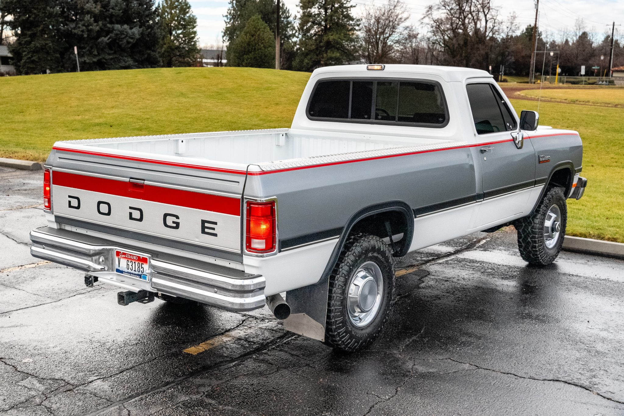The 16″ steel wheels feature bright hubcaps and are mounted with 235/85 Goodyear Wrangler Duratrac tires. The truck is equipped with manually locking front hubs and power steering, and braking is provided by power-assisted front discs and rear drums.