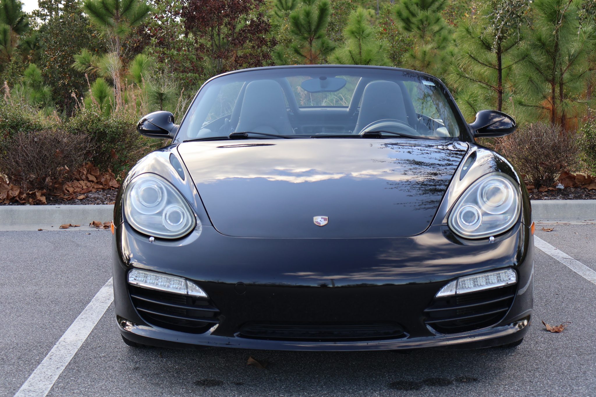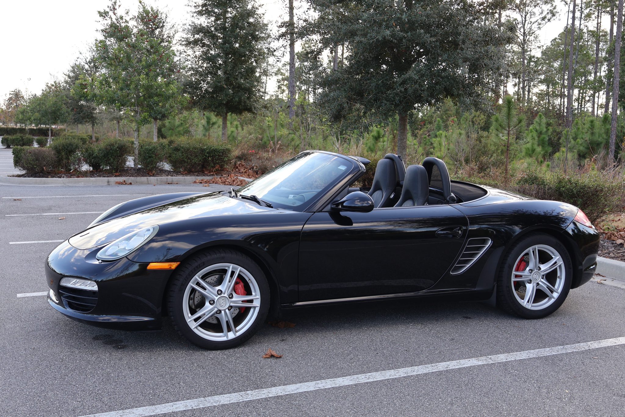 The 18″ Boxster S II wheels are mounted with 235/40 front and 265/40 rear Michelin Pilot Sport 4S tires said to have been installed in early 2024. The car is equipped with Porsche Stability Management (PSM), and braking is handled by red four-piston Porsche-branded calipers over cross-drilled rotors measuring 12.5″ and 11.8″ front and rear, respectively.