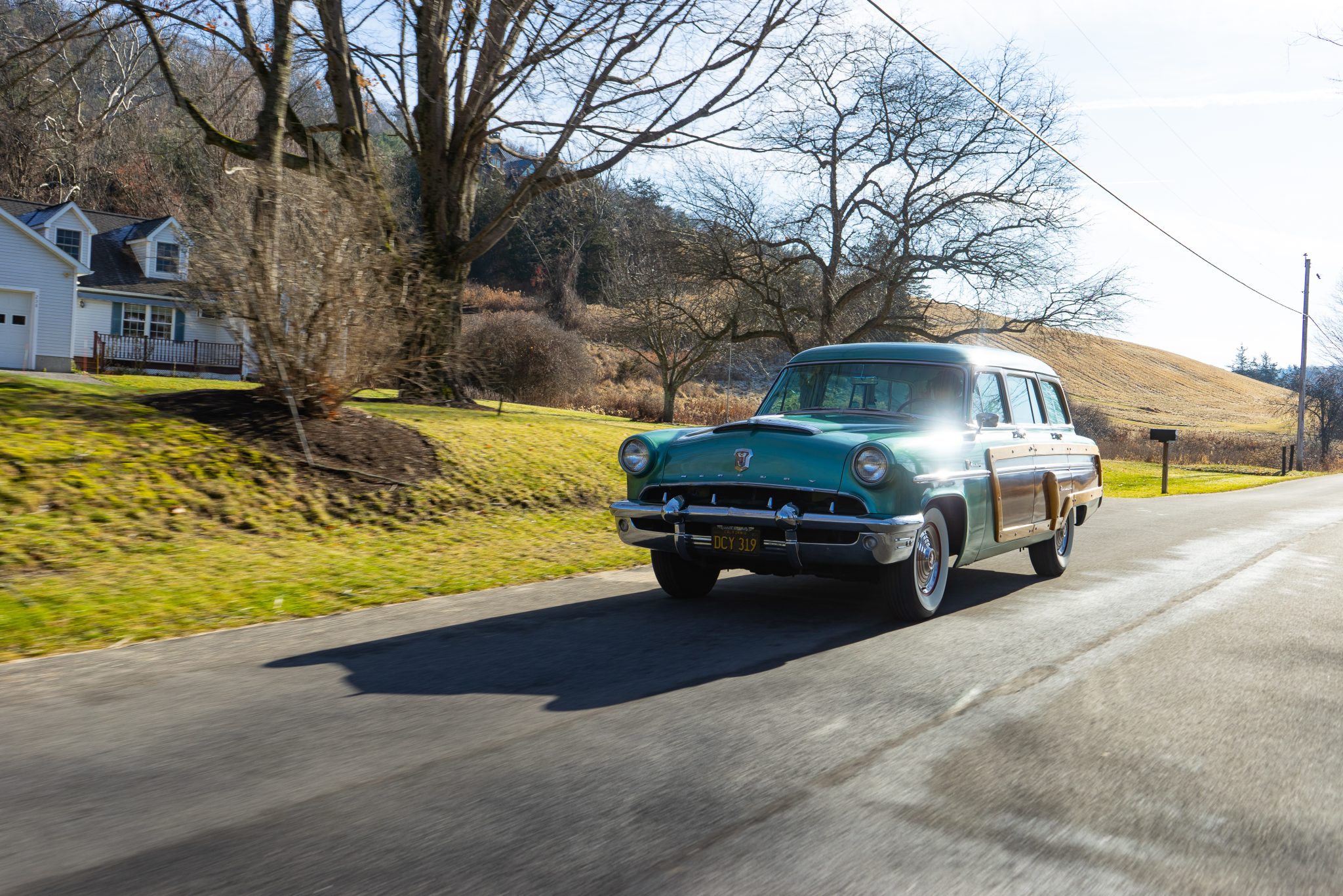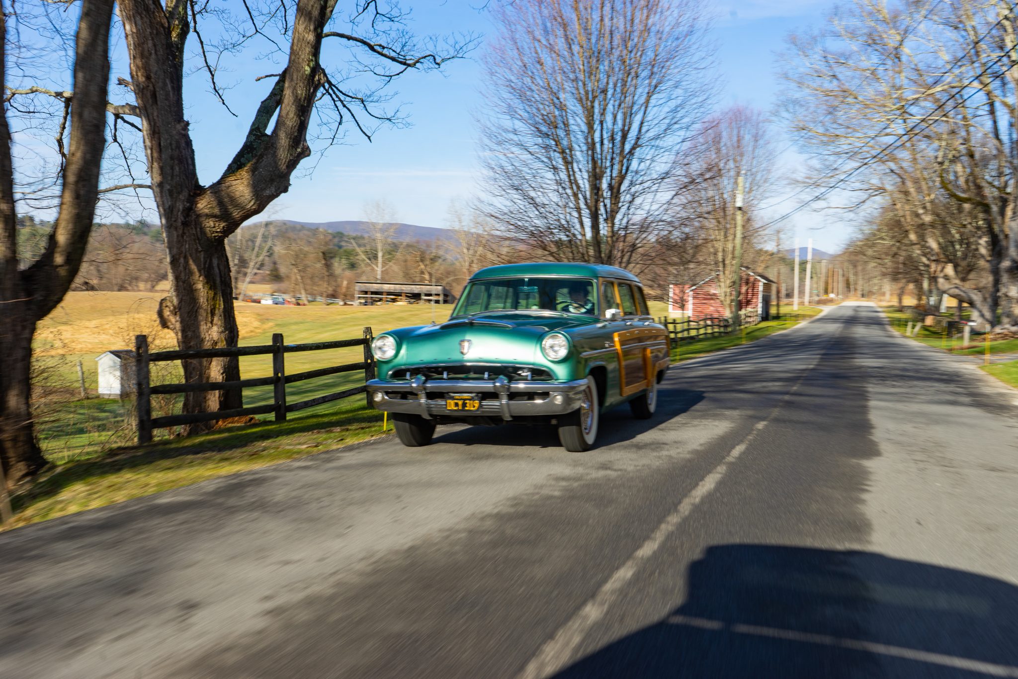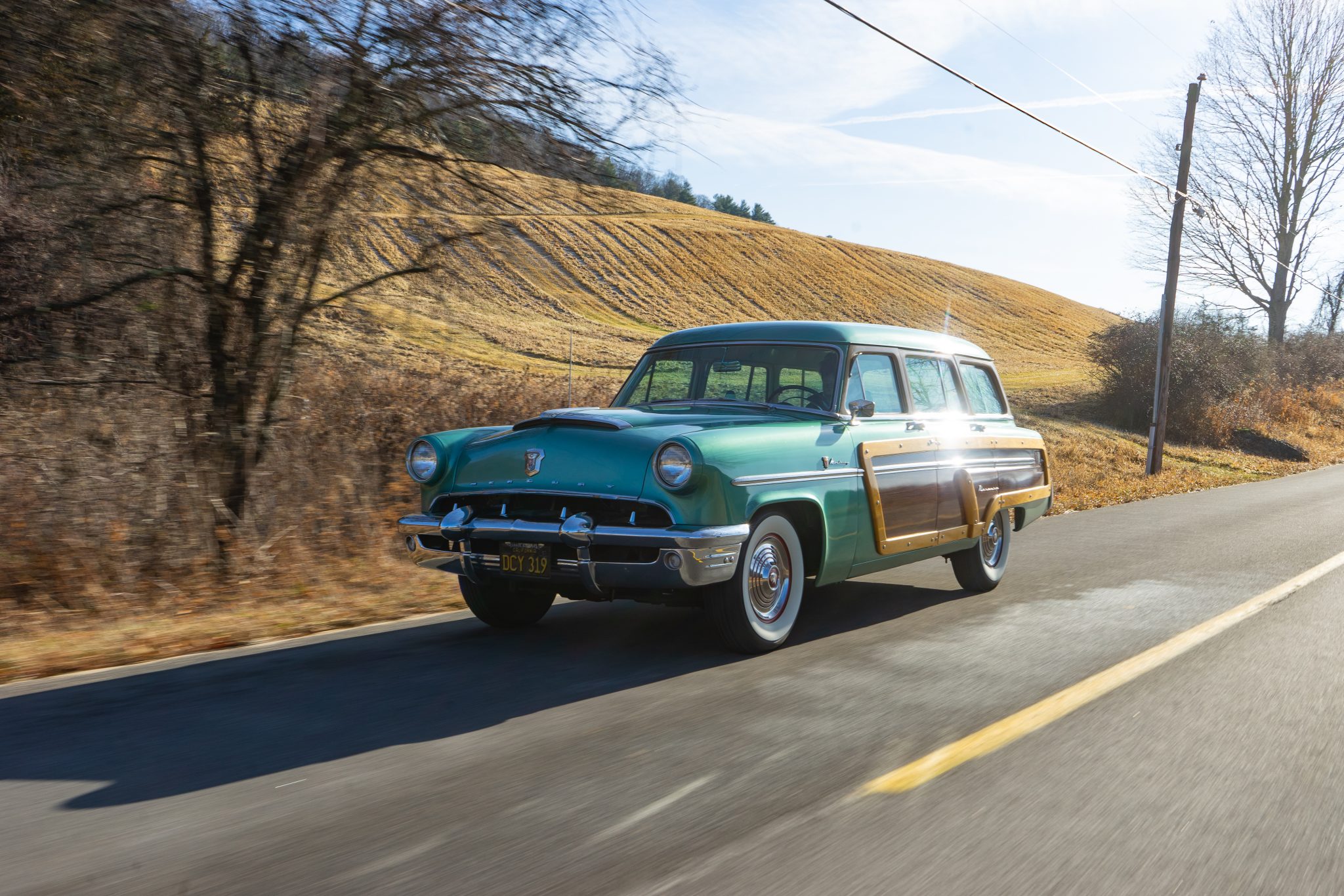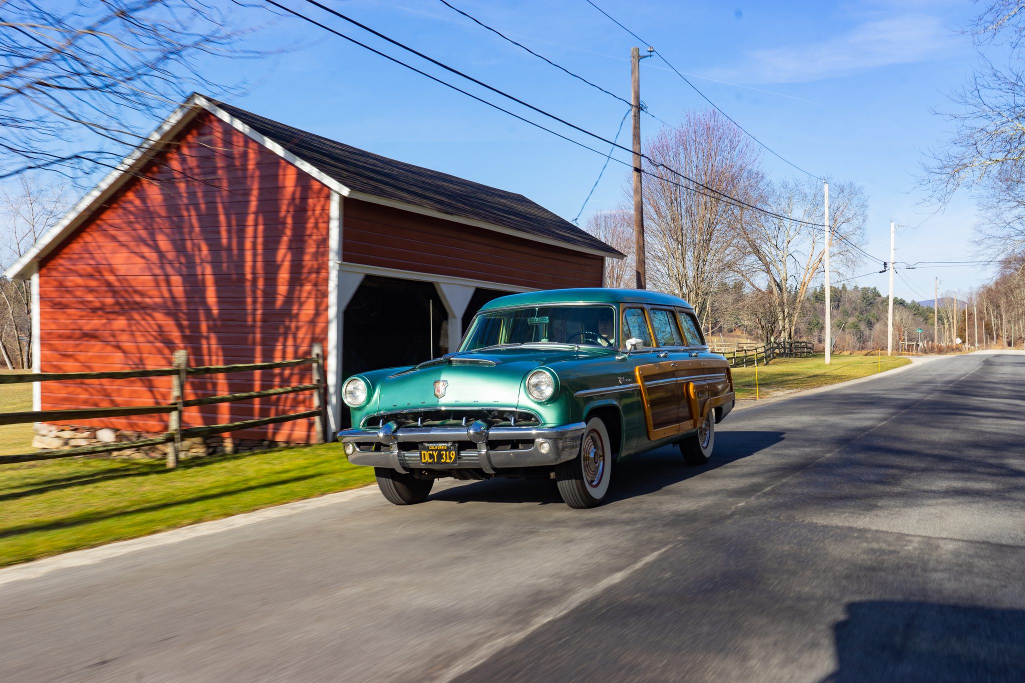 Red-painted steel wheels wear chrome covers, and they are mounted with 7.60–15 BFGoodrich Silvertown bias-ply whitewall tires. The Monterey features a coil-sprung independent front suspension, while a solid axle with semi-elliptical leaf springs can be found at the rear. The car is equipped with power steering, and braking is provided by power-assisted drums.