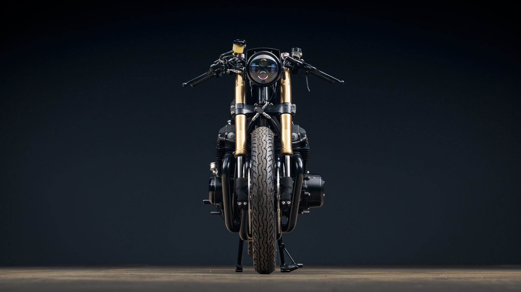 Wire-spoke 18″ wheels are mounted with 100/90 front and 120/90 rear Pirelli Route MT66 tires. Stopping power is provided by dual drilled disc brakes with Tokico calipers up front and a drum brake at the rear. Suspension consists of a black and gold-finished inverted fork in addition to a pair of shocks connected to the swingarm.
