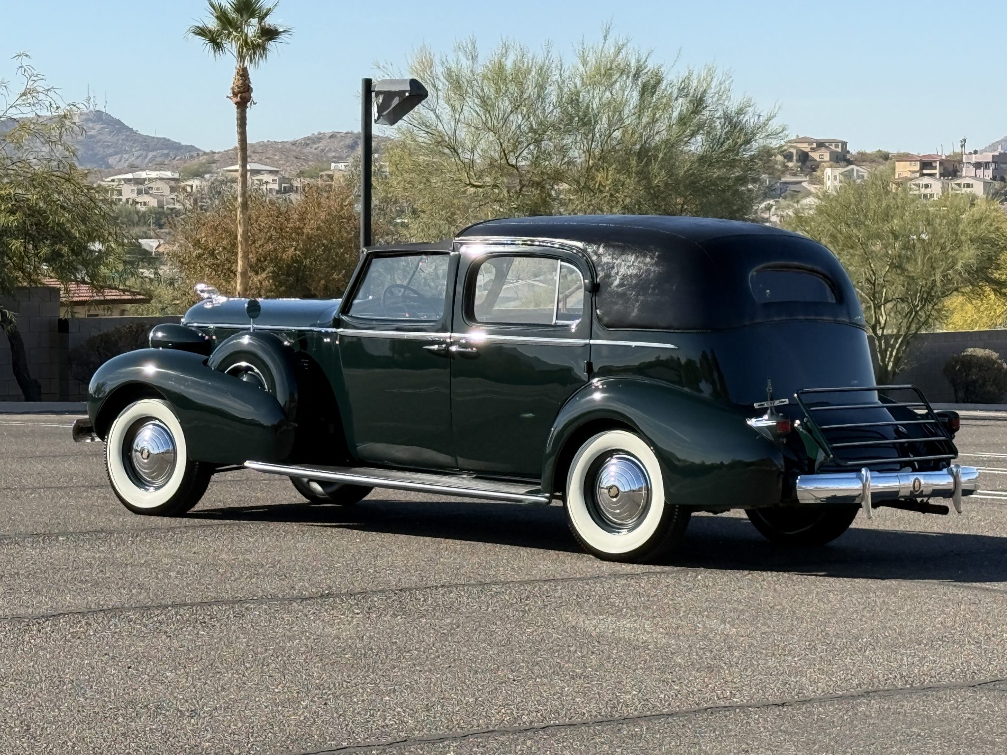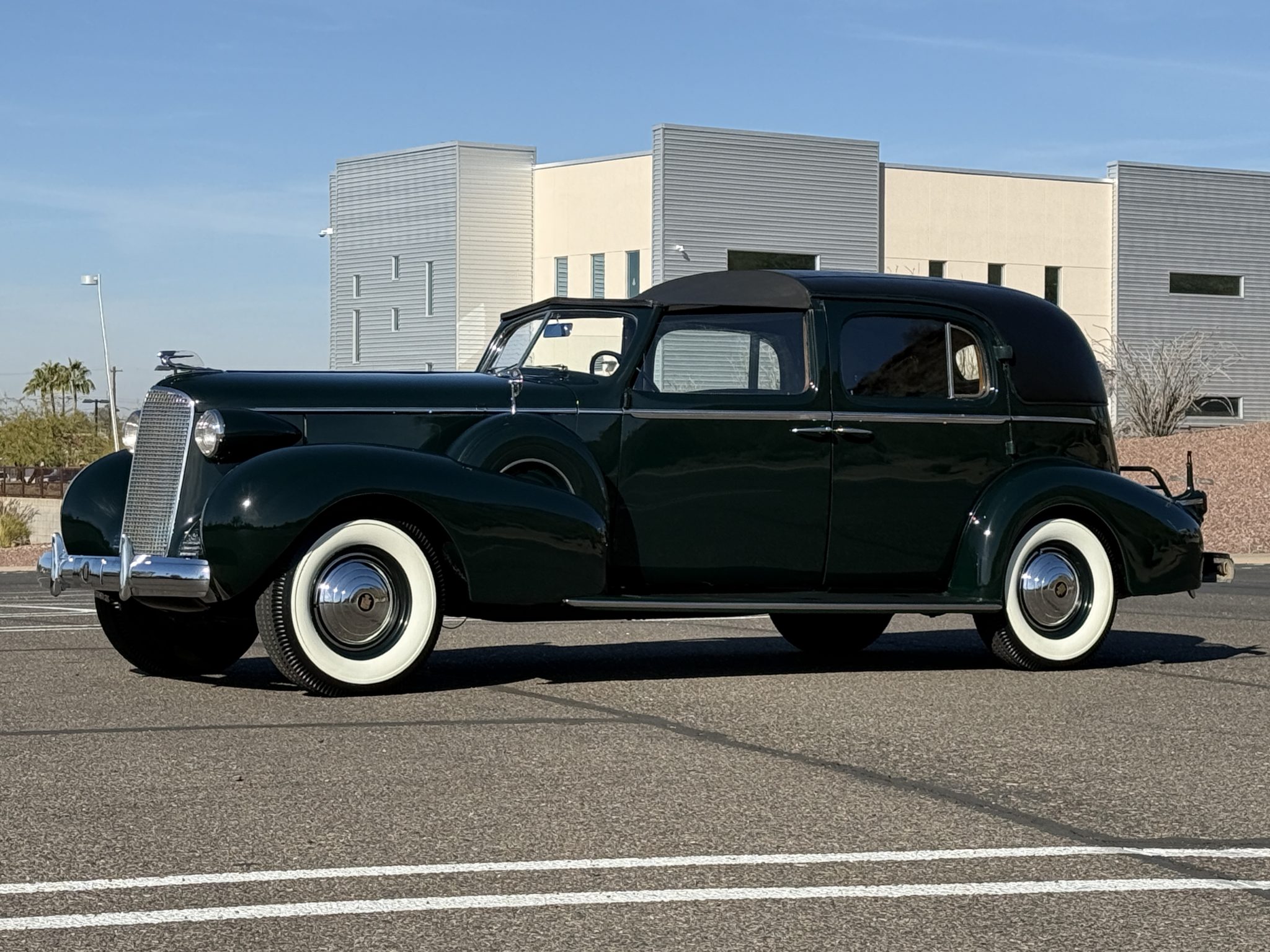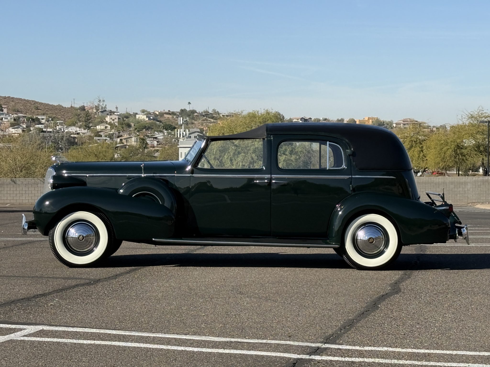Body-color steel wheels wear chrome Cadillac crest hubcaps and trim rings, and they are mounted with older BFGoodrich Silvertown bias-ply whitewall tires. Twin spare tires are mounted inside body-color covers topped with mirrors in the front fenders. The four-wheel drum brakes were bled and adjusted in 2024.