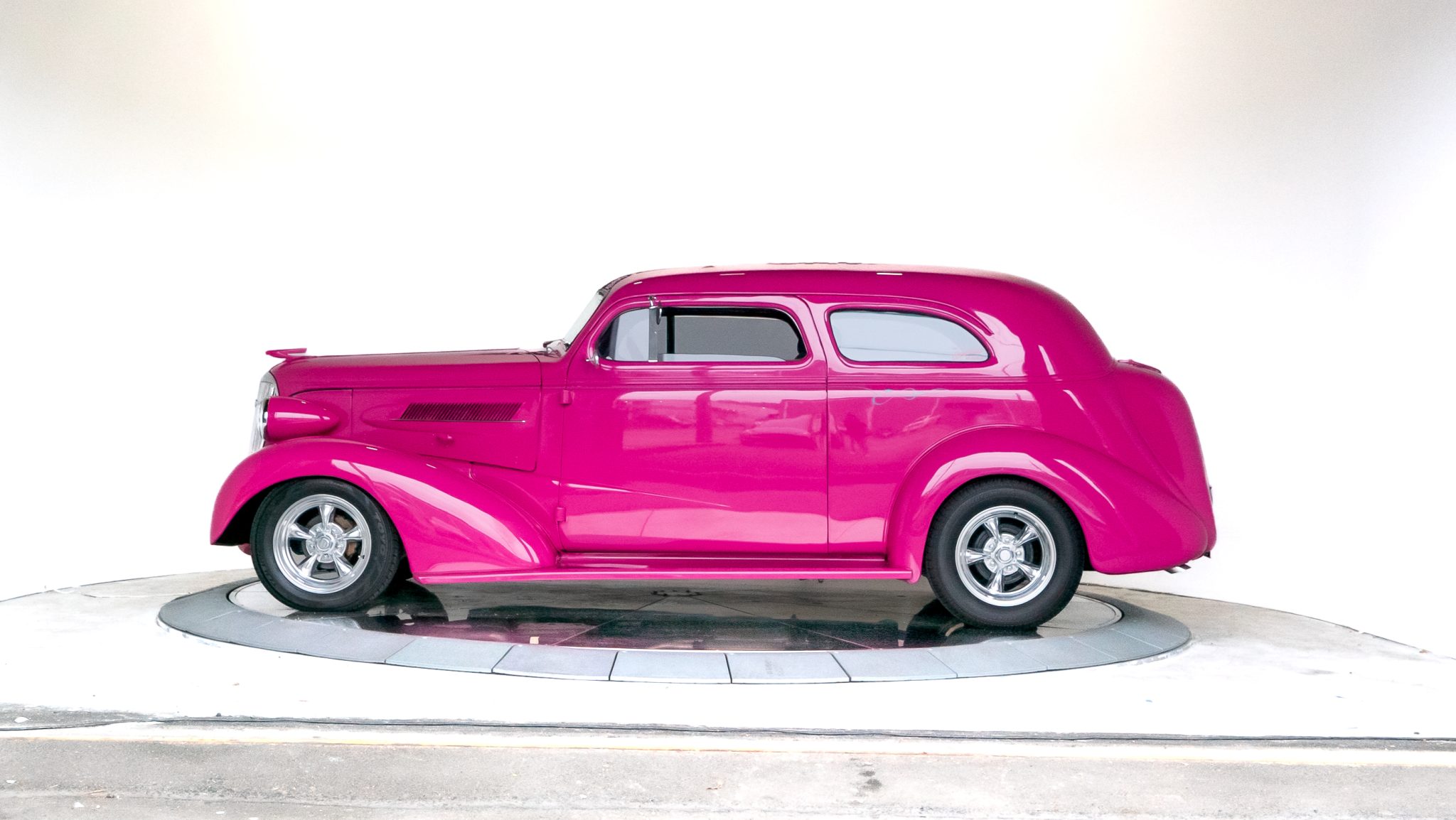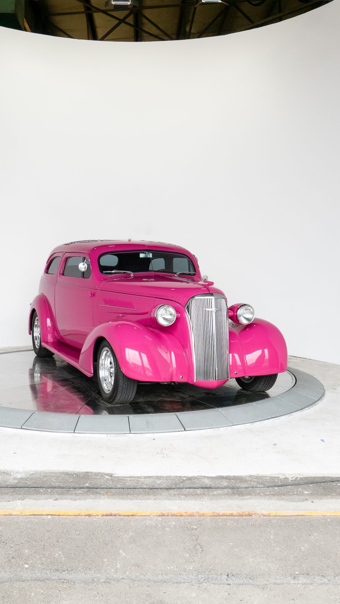Chrome-finished American Racing 15” wheels are mounted with 205/60 Toyo Tourevo LS II tires up front and 235/60 Super Sport Futura GLS units out back. A Mustang II-style front subframe with power-assisted rack-and-pinion steering has been added, and the live rear axle is supported by longitudinal leaf springs. Braking is handled by front discs and rear drums.