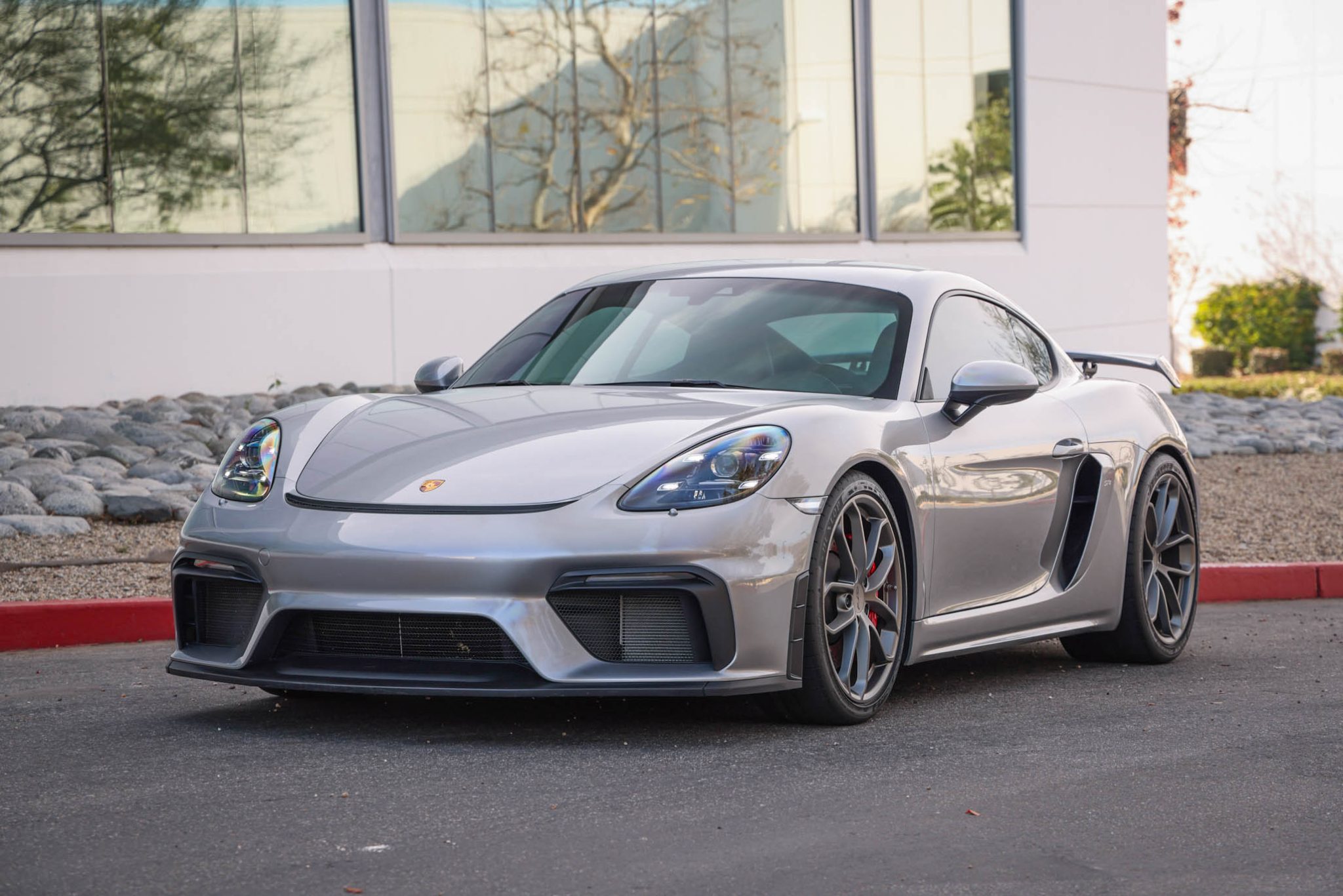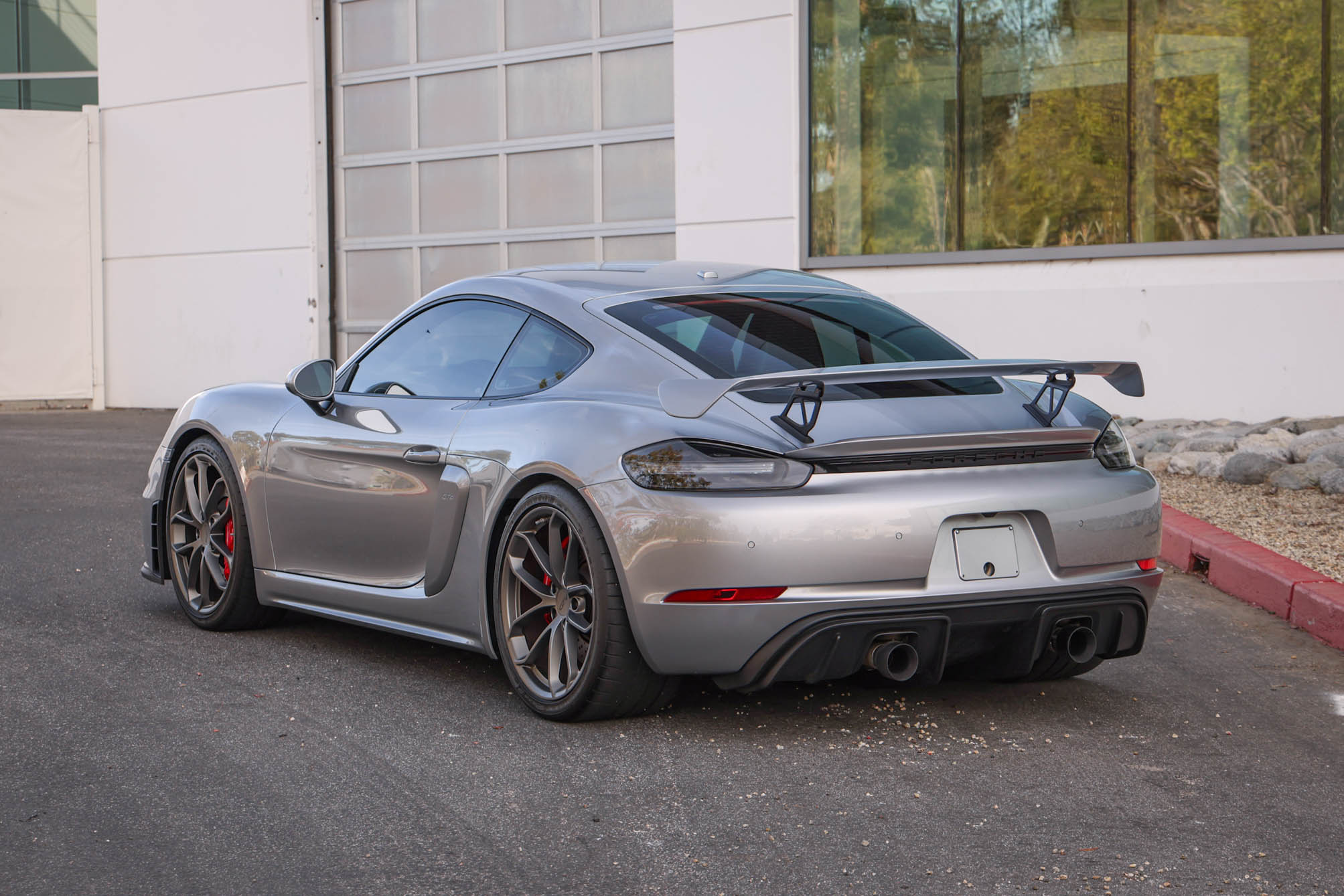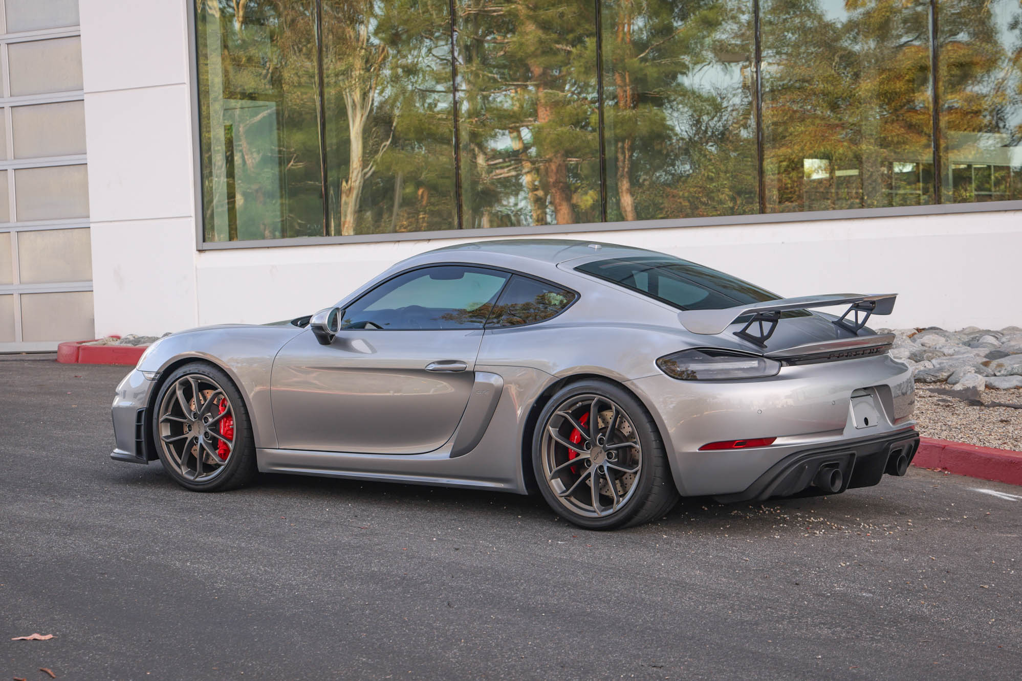 The 20″ Cayman GT4 alloy wheels are mounted with 245/35 front and 295/30 rear Dunlop Sport Maxx Race 2 tires. Stopping power is provided by ventilated and cross-drilled rotors with red-finished calipers at each corner. The car is equipped with Porsche Active Suspension Management (PASM). A brake fluid flush was performed in August 2024.