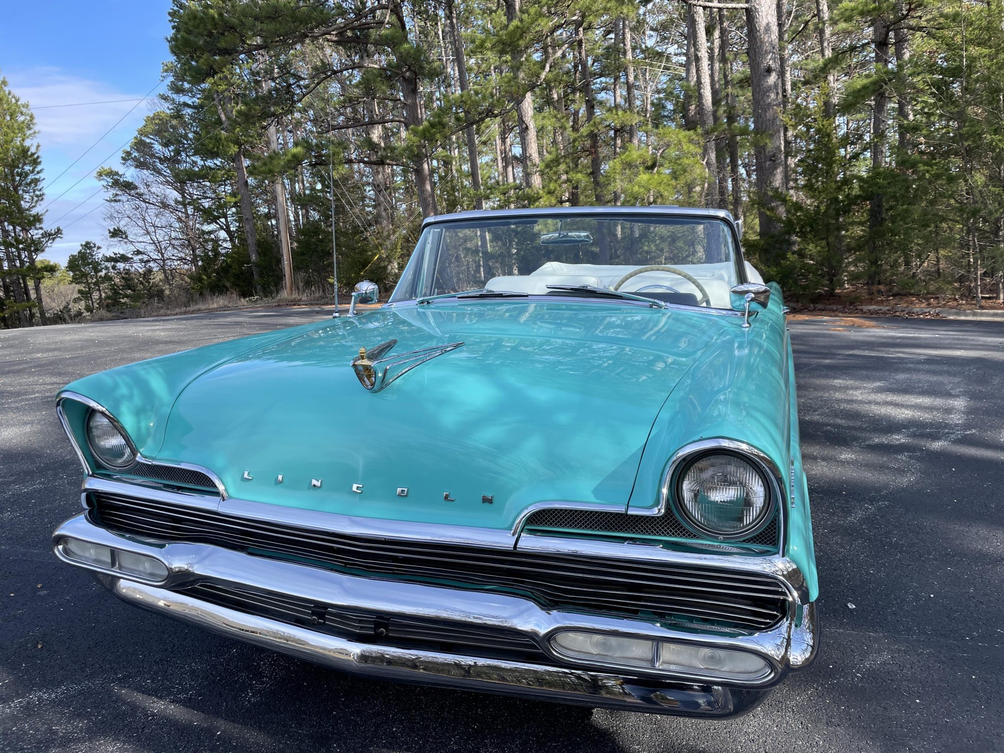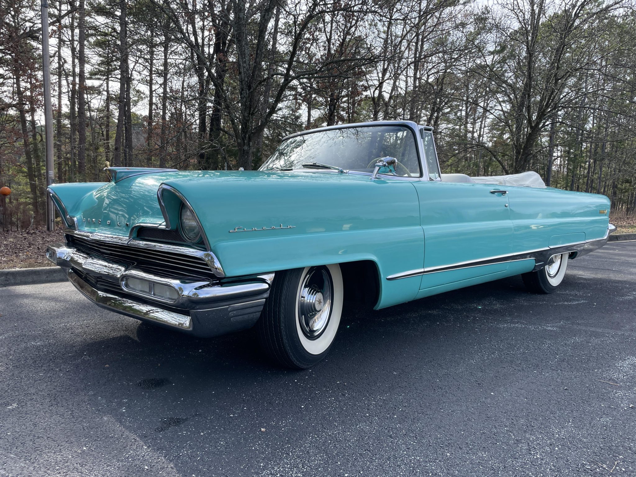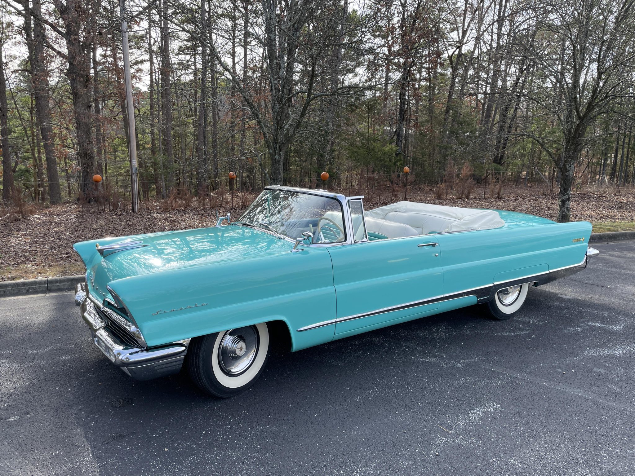 Black-finished steel wheels wear chrome covers and are mounted with L78–15 Remington whitewall tires. A matching spare wheel and tire are stowed in the trunk. The Premiere rides on a 126″ wheelbase and features a coil-sprung independent front suspension and a live rear axle with semi-elliptical leaf springs. A set of overload springs were installed on the rear axle under previous ownership. The car is equipped with power-assisted steering and four-wheel drum brakes. A replacement brake light switch was installed in January 2025, and the brake system was also bled at that time.