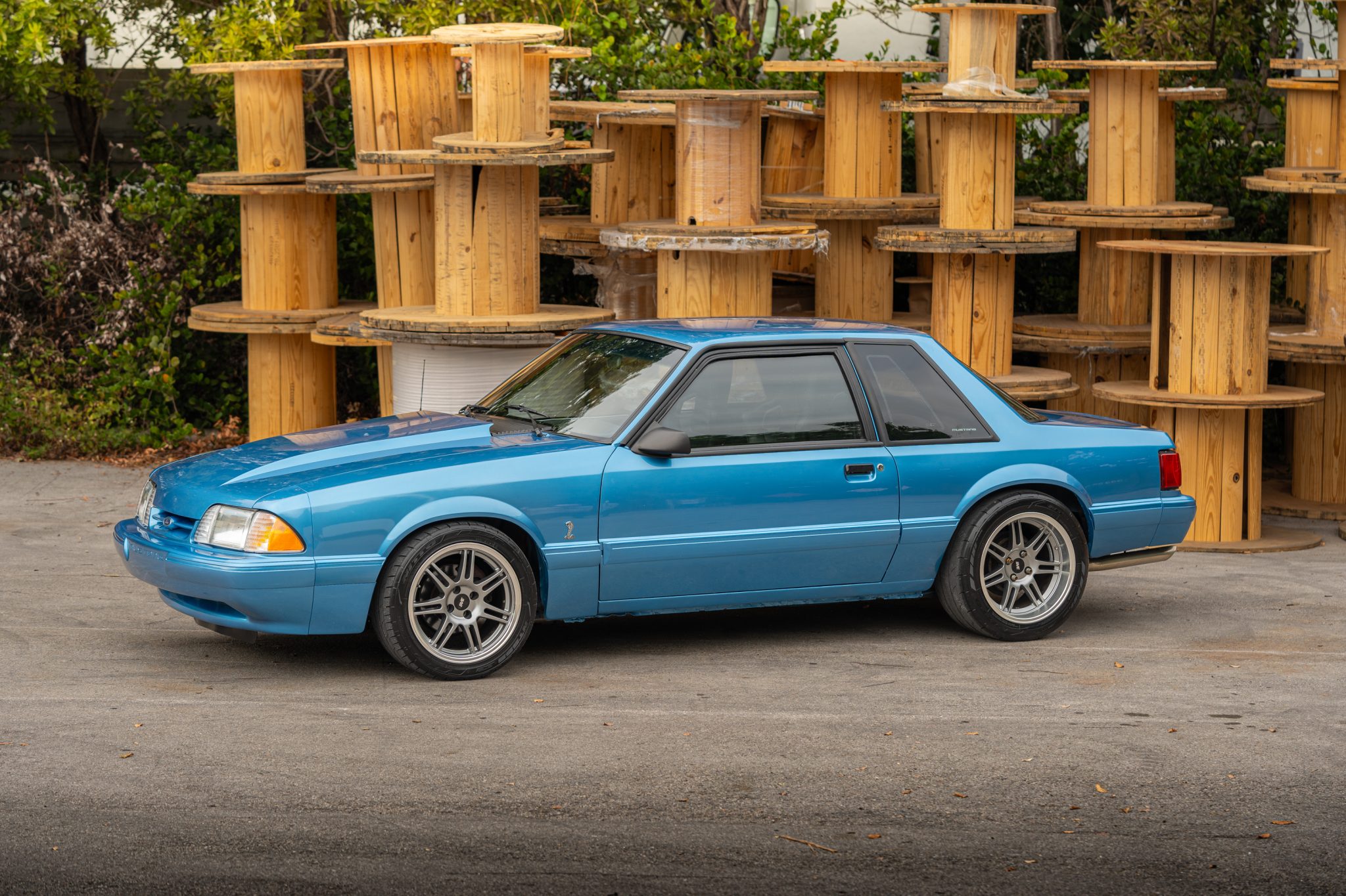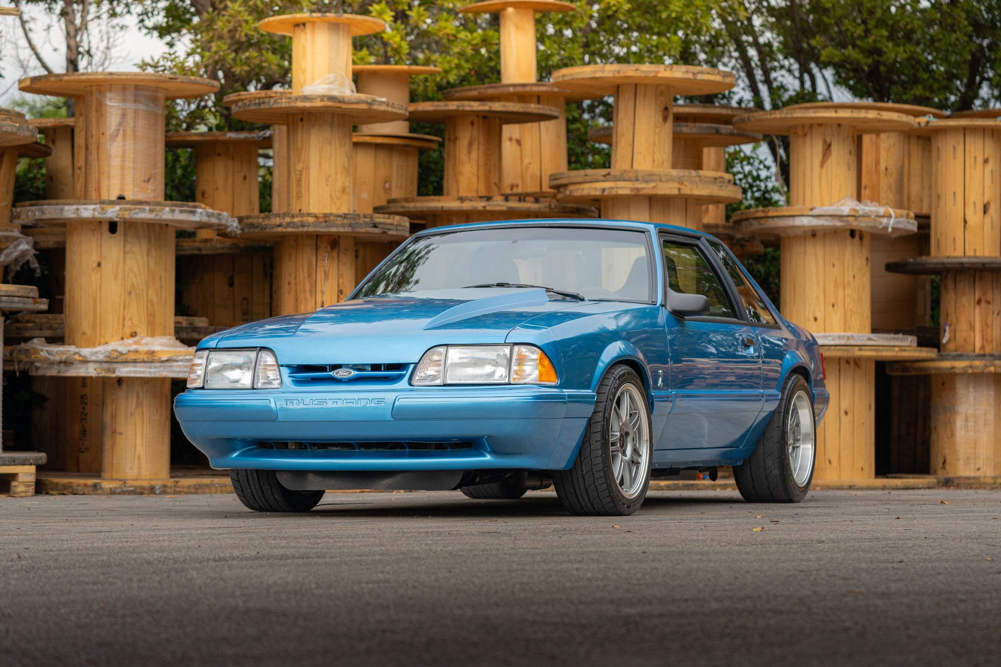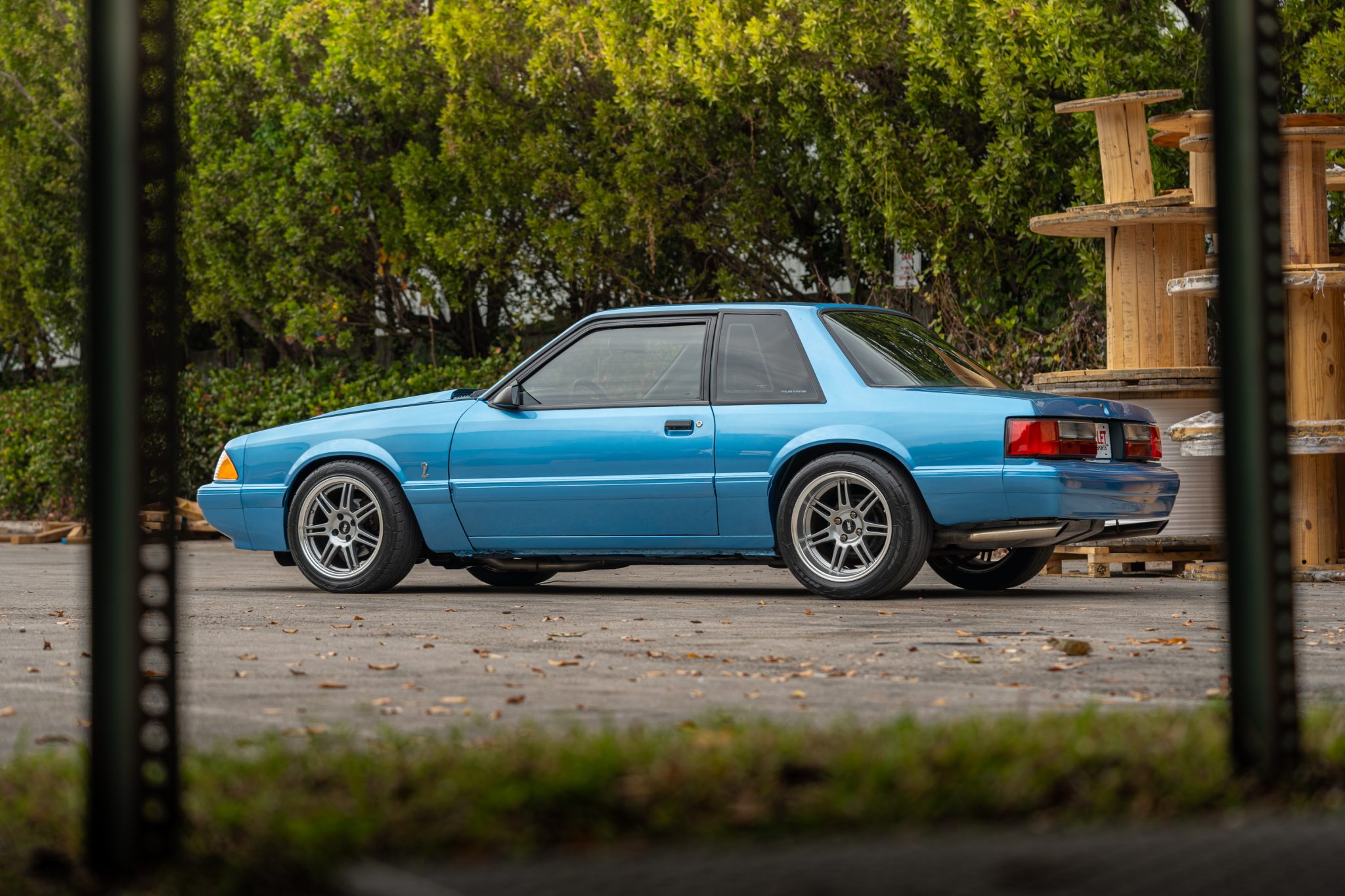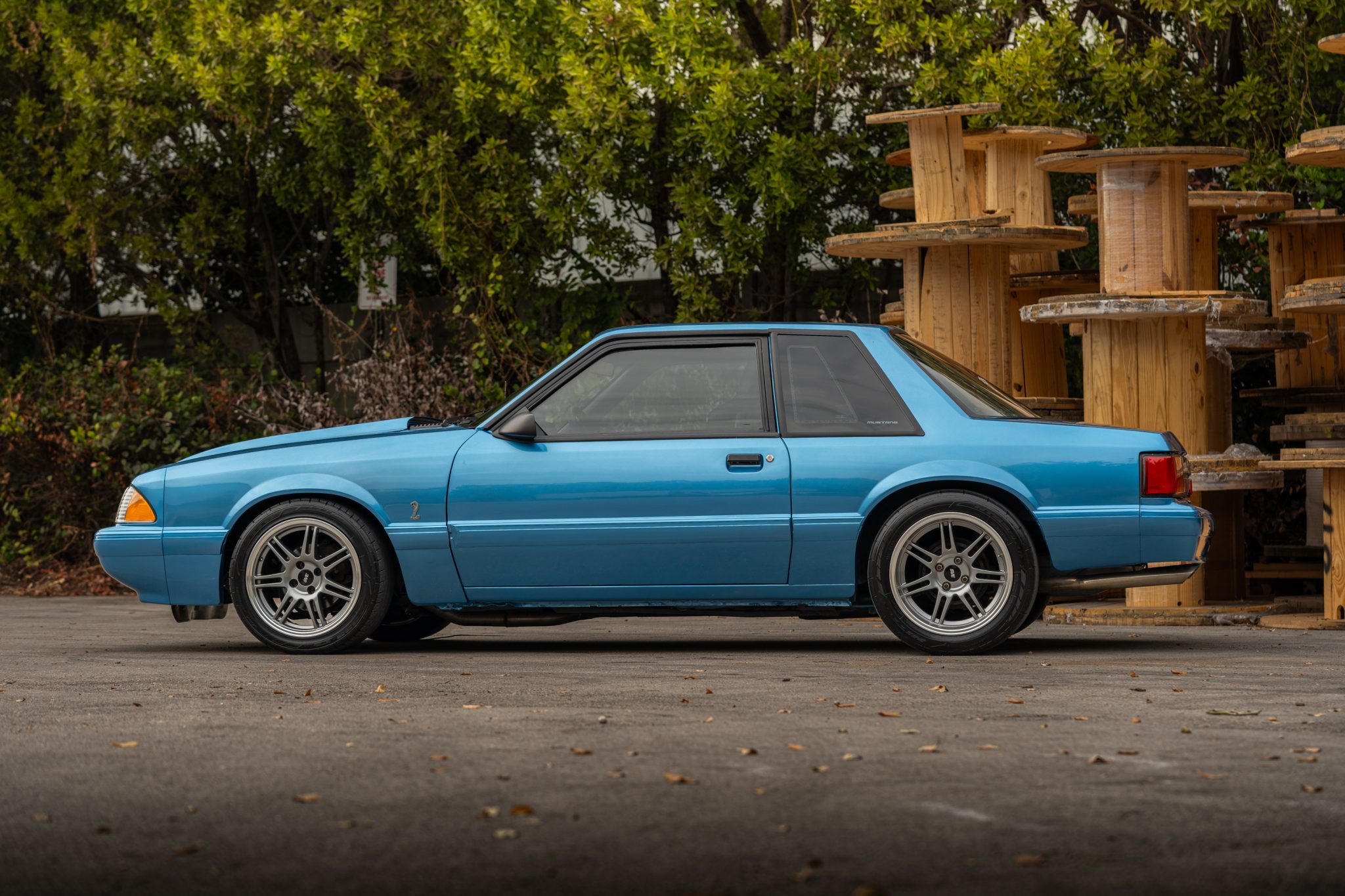 Split seven-spoke 17″ wheels are mounted with 255/40 front and 275/40 rear Nitto NT555R Extreme Drag tires. The suspension has been modified with a tubular front cradle, Bilstein front struts, and aftermarket front lower control arms. Braking is handled by power-assisted front discs and rear drums.