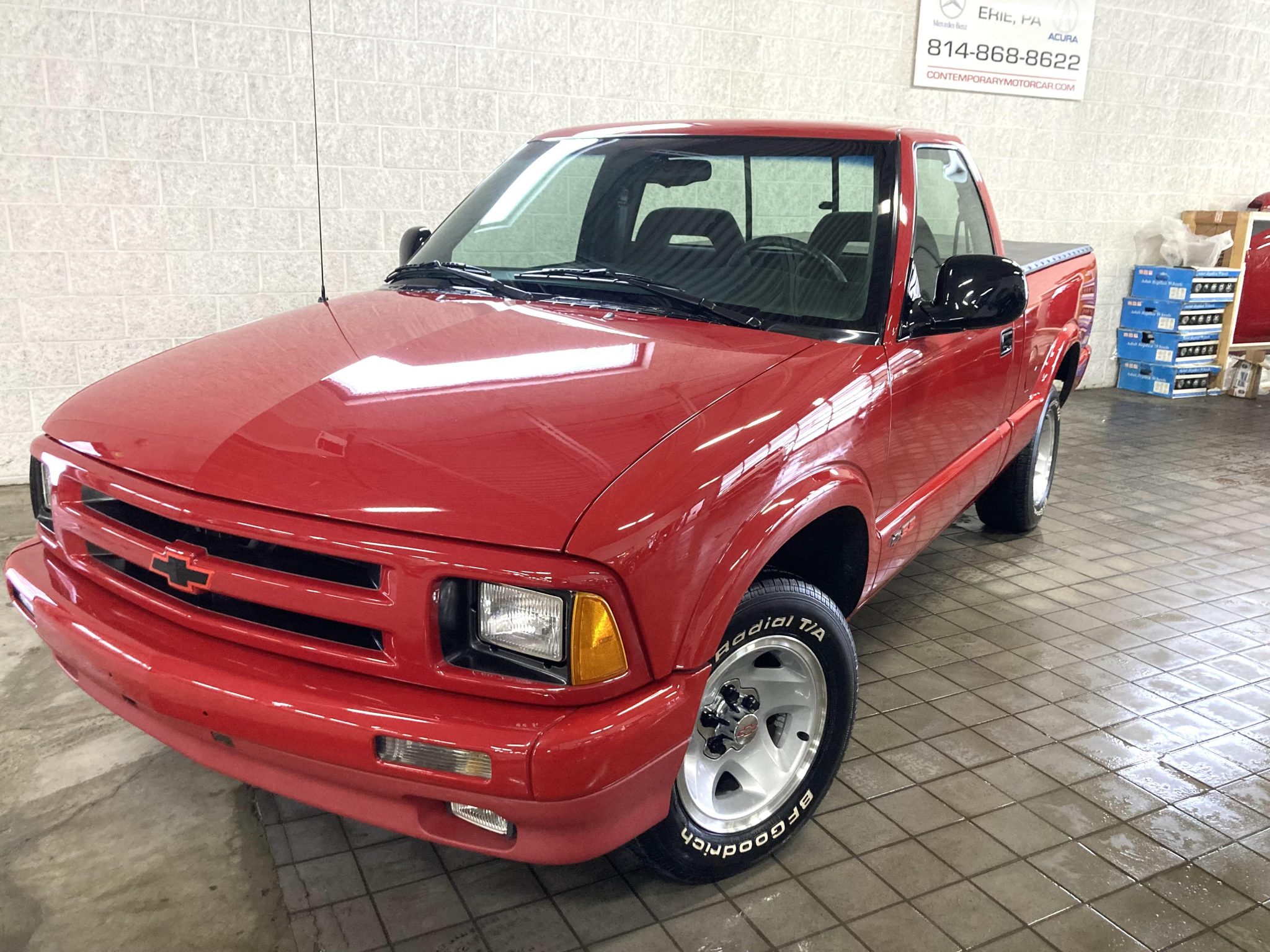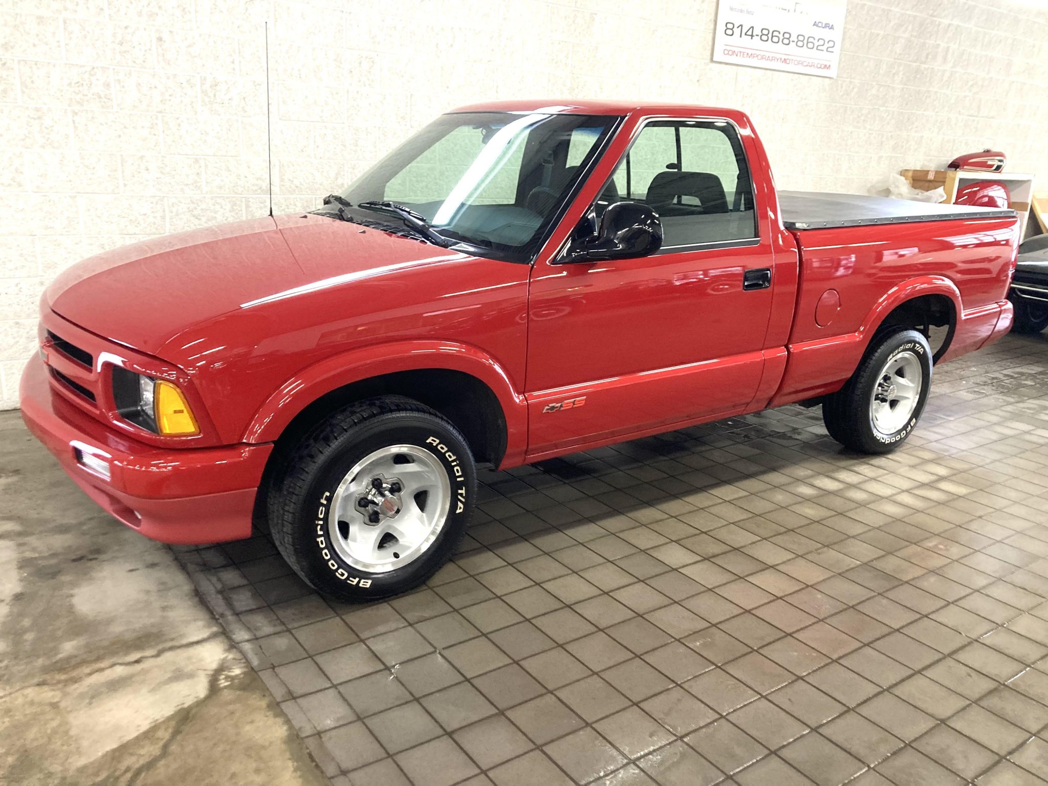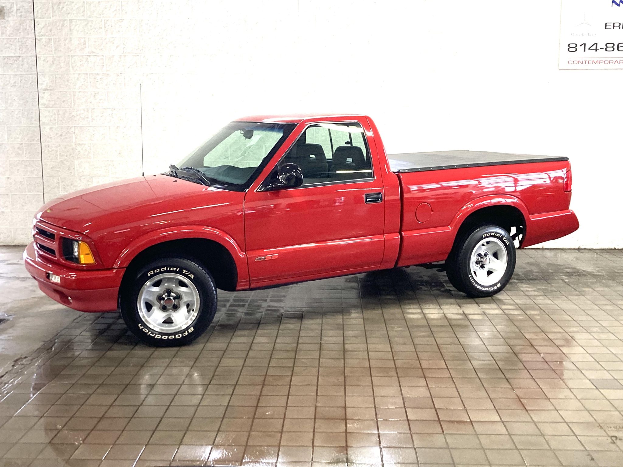 The 15″ five-spoke alloy wheels are mounted with 215/65 BFGoodrich Radial T/A white letter tires. The truck was optioned with the Sport Handling Package, and braking is provided by anti-lock front discs and rear drums.