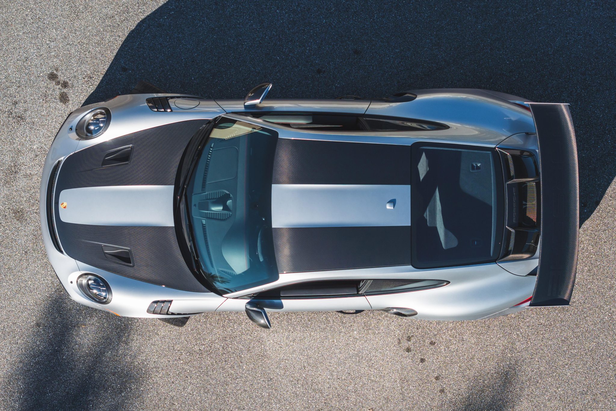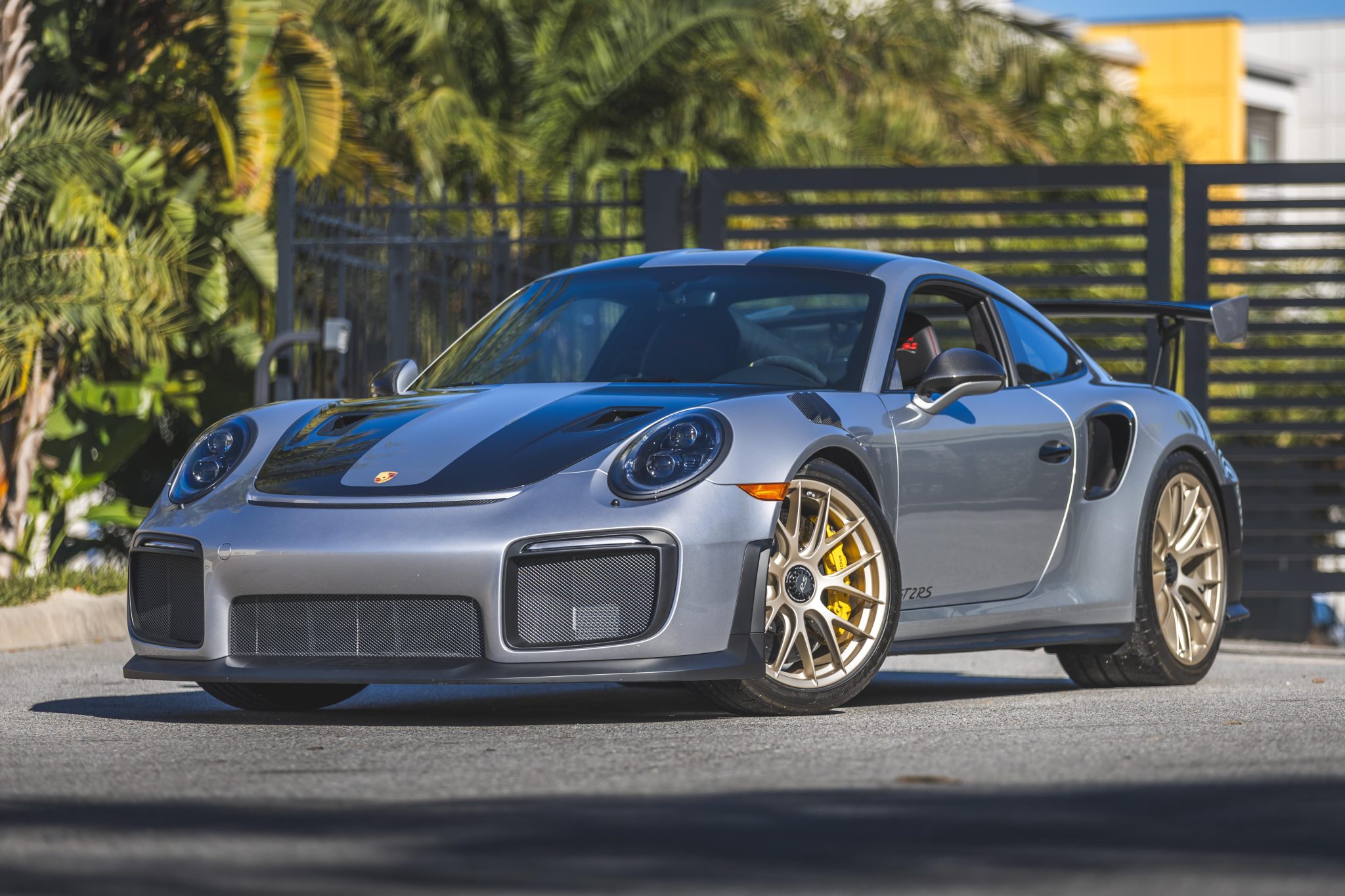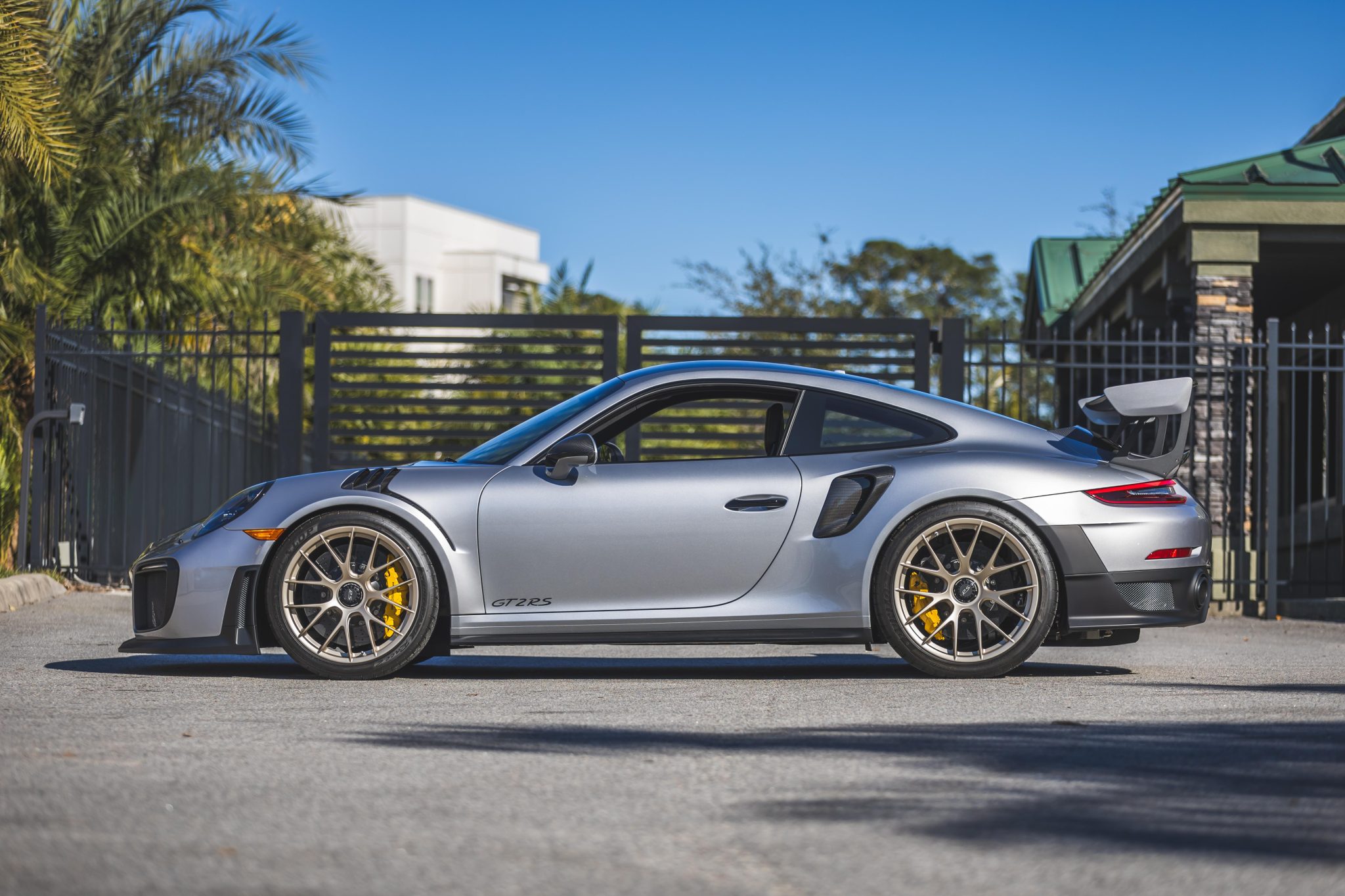 Center-locking 20″ and 21″ magnesium wheels are mounted with 265/35 front and 325/30 rear Dunlop Sport Maxx Race 2 tires produced in 2018. The car is equipped with adjustable dampers and anti-roll bars, Porsche Active Suspension Management, Porsche Stability Management, a front-axle lift system, and rear-axle steering. Porsche Ceramic Composite Brakes were standard on the GT2 RS and feature yellow calipers and cross-drilled rotors.