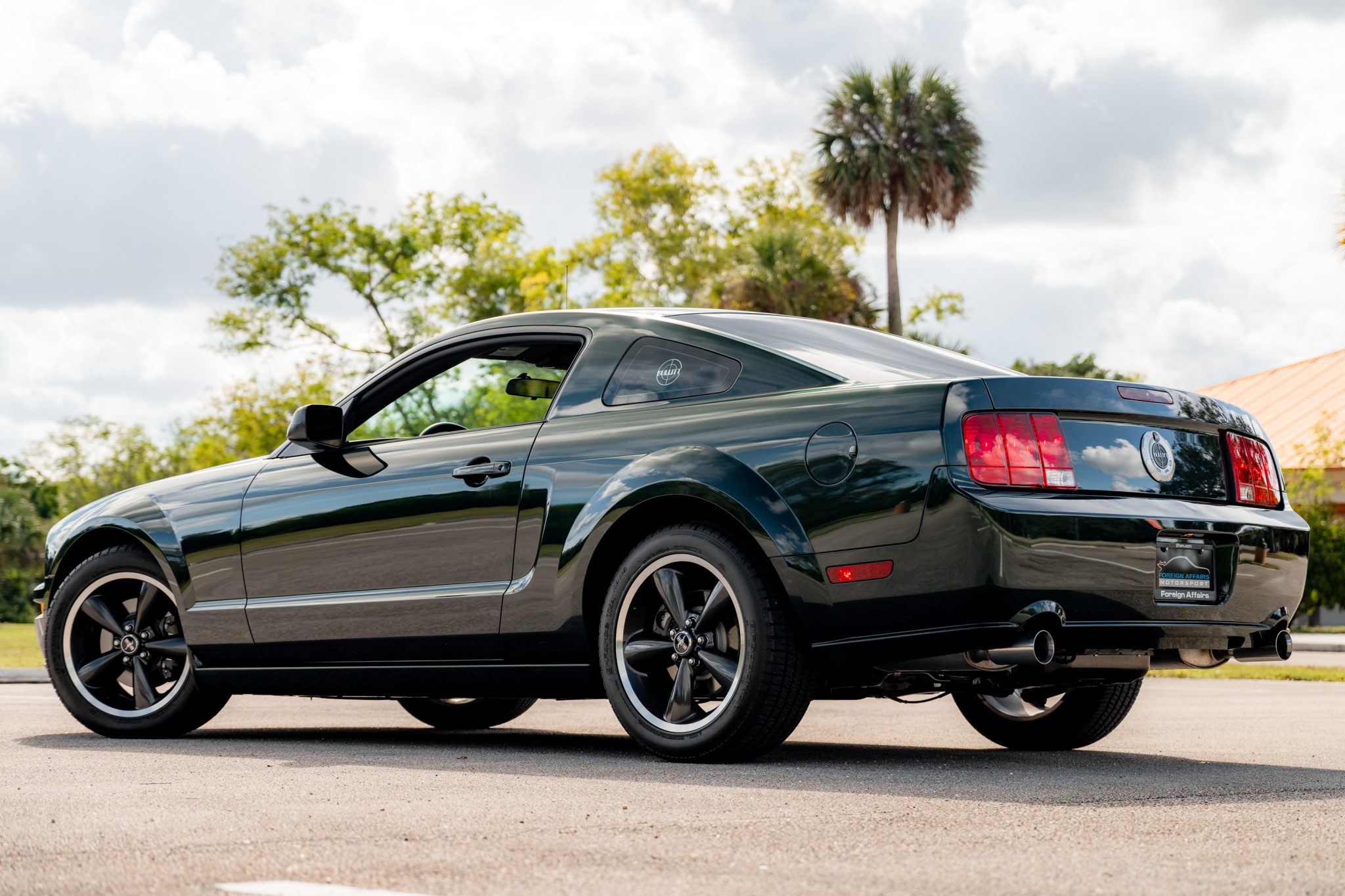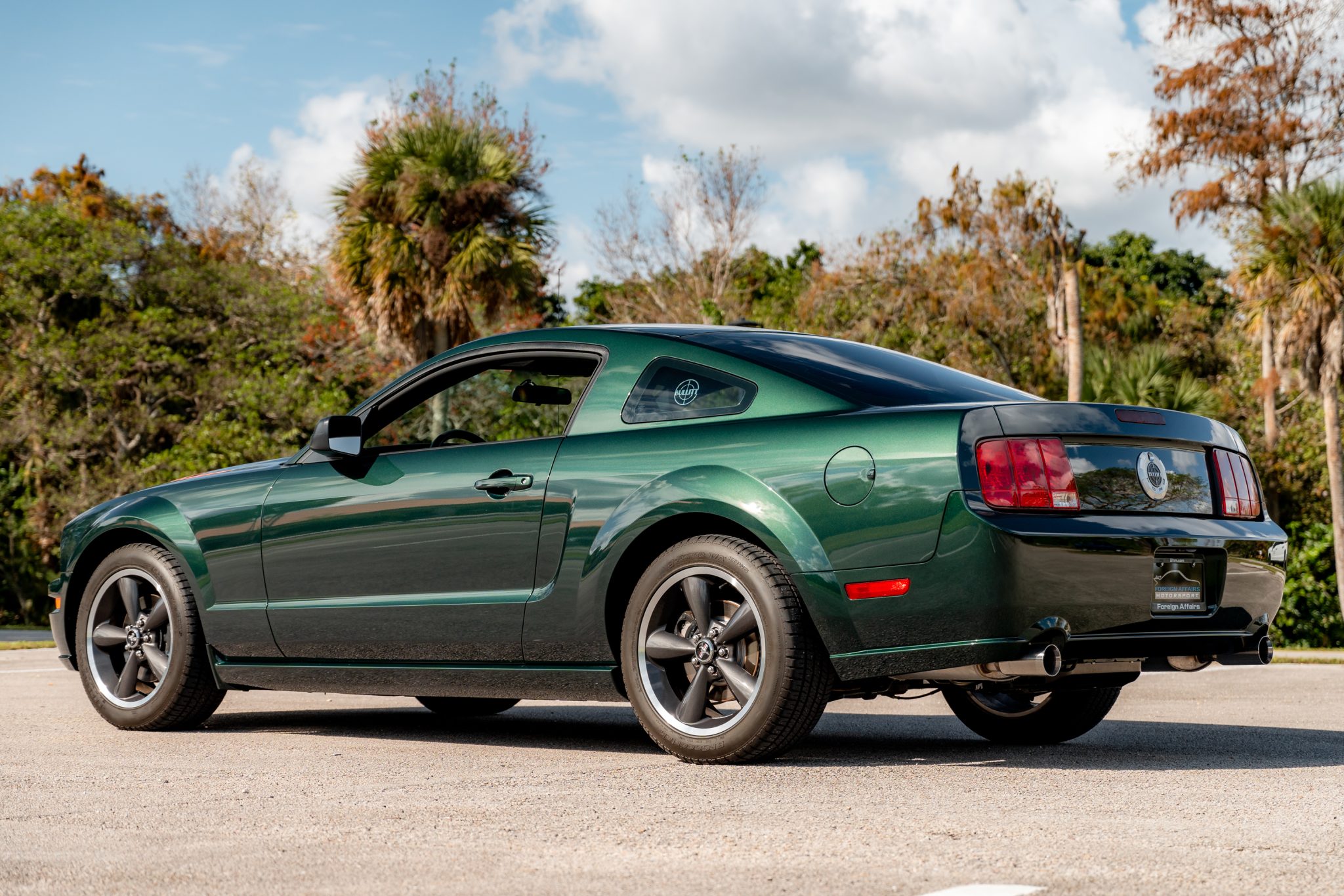 Bullitt-specific 18″ cast-aluminum Dark Argent wheels are mounted with BFGoodrich g-Force T/A KDWS tires measuring 235/50 all around. Bullitt examples were factory-equipped with stiffer springs, revised dampers, and a strut-tower brace. Stopping power is provided by four-wheel disc brakes.