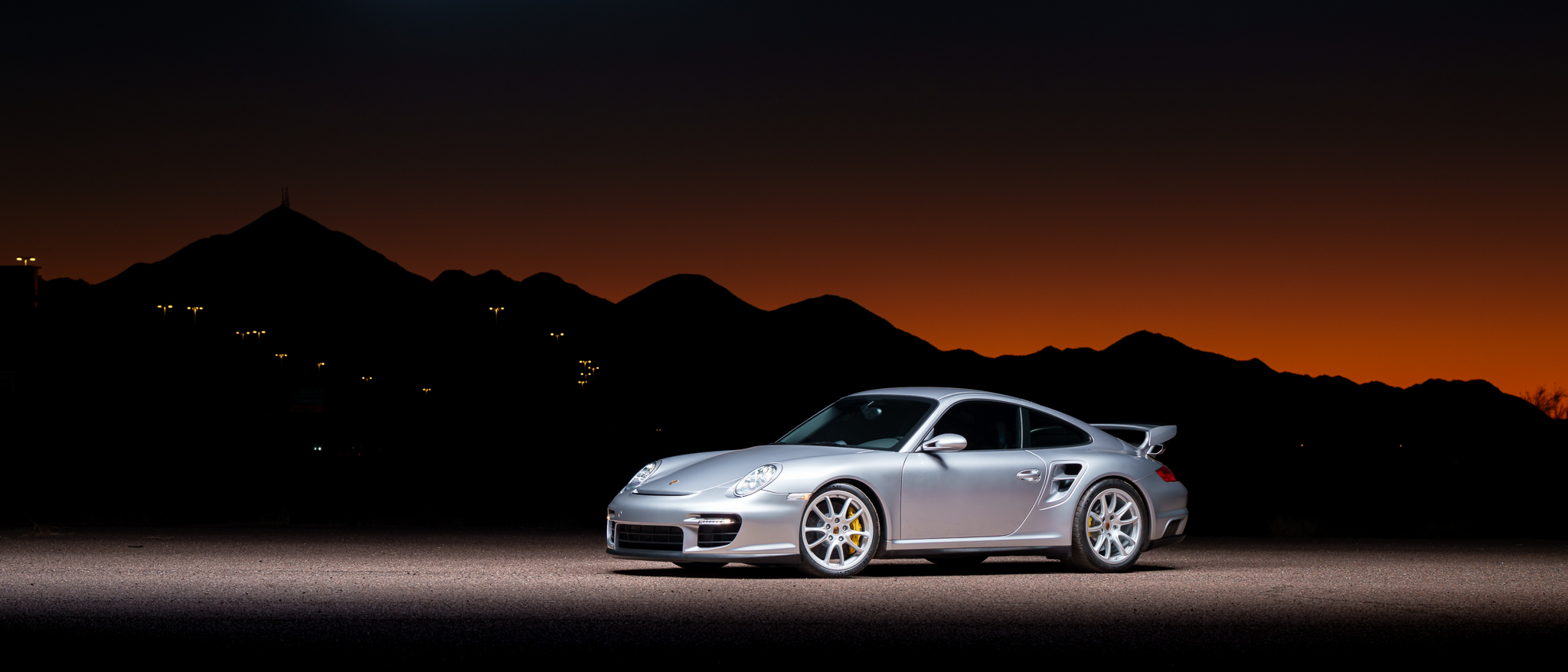 Staggered-width 19″ GT2 wheels are finished in silver and are mounted with Michelin Pilot Sport Cup 2 tires that were installed in April 2024. The GT2 is equipped with Porsche Active Suspension Management (PASM), and it features stiffer dampers, higher spring rates, and a ride height one inch lower in comparison to the contemporary 911 Turbo. The Porsche Ceramic Composite Brakes (PCCB) feature yellow six- and four-piston calipers along with cross-drilled rotors. The rear wheels were repaired in April 2024.