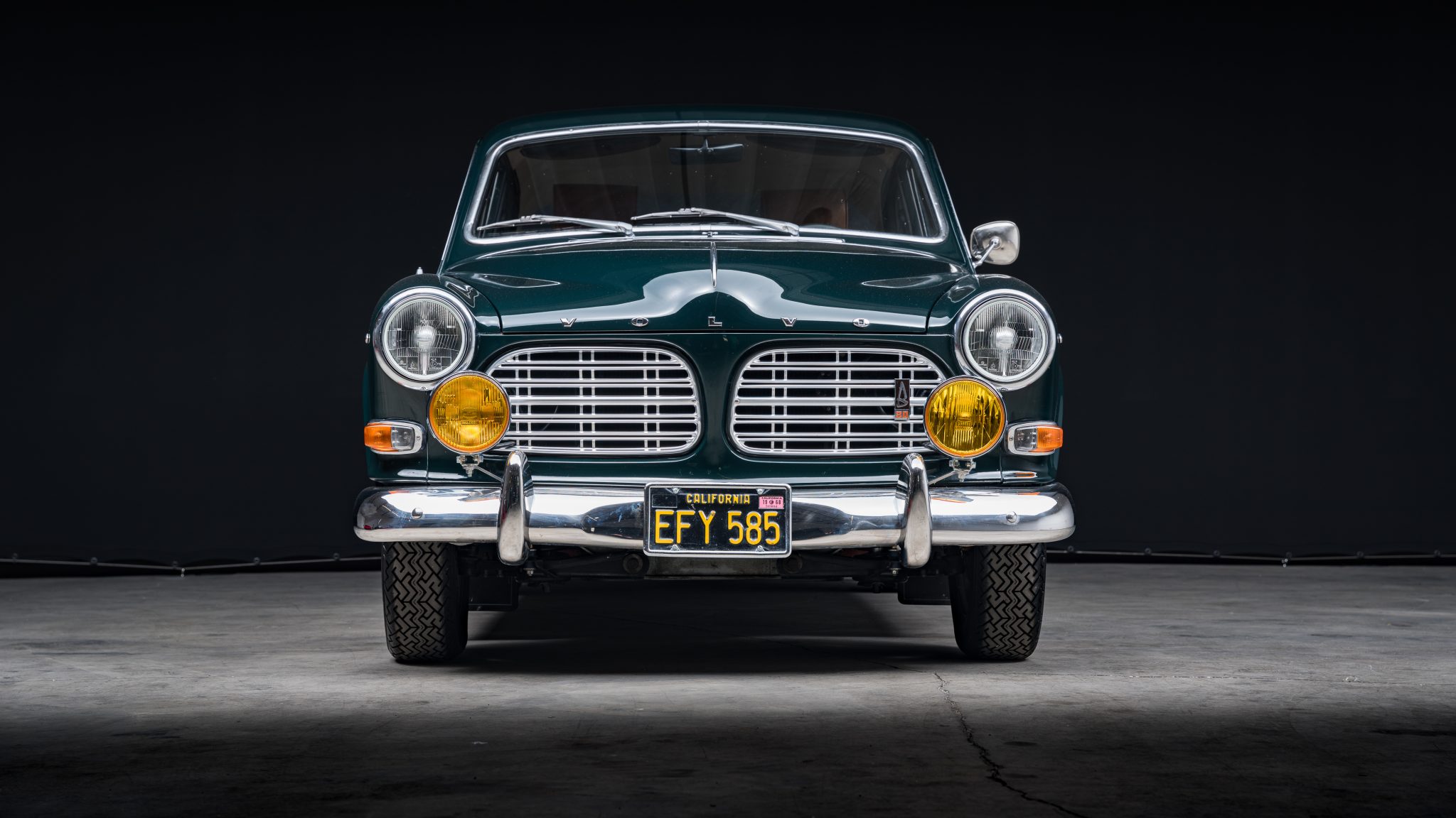 Silver-finished 15″ slotted steel wheels with polished hubcaps sourced from a 122 wagon have been added, and they were mounted with 165-series Pirelli Cinturato tires in August 2023. Chassis modifications consist of an IPD front sway bar, Progressive Suspension springs, and Koni shocks. Disc brakes are fitted at each corner, and the rear brake pads were replaced in July 2021.