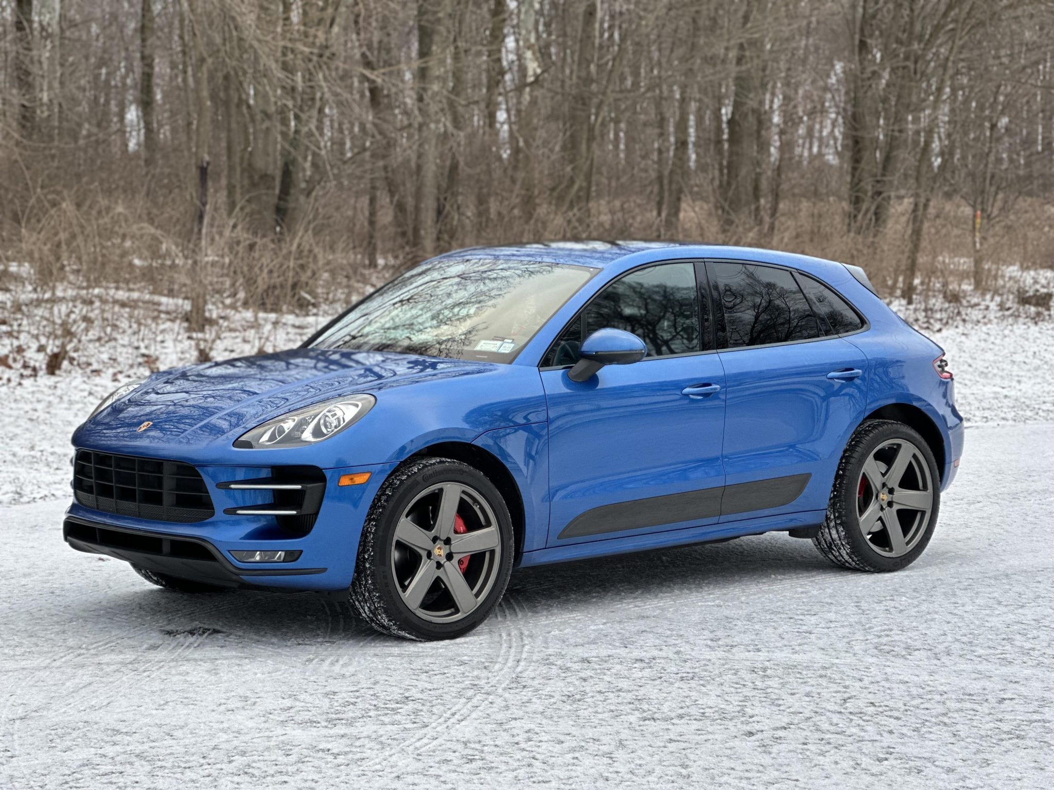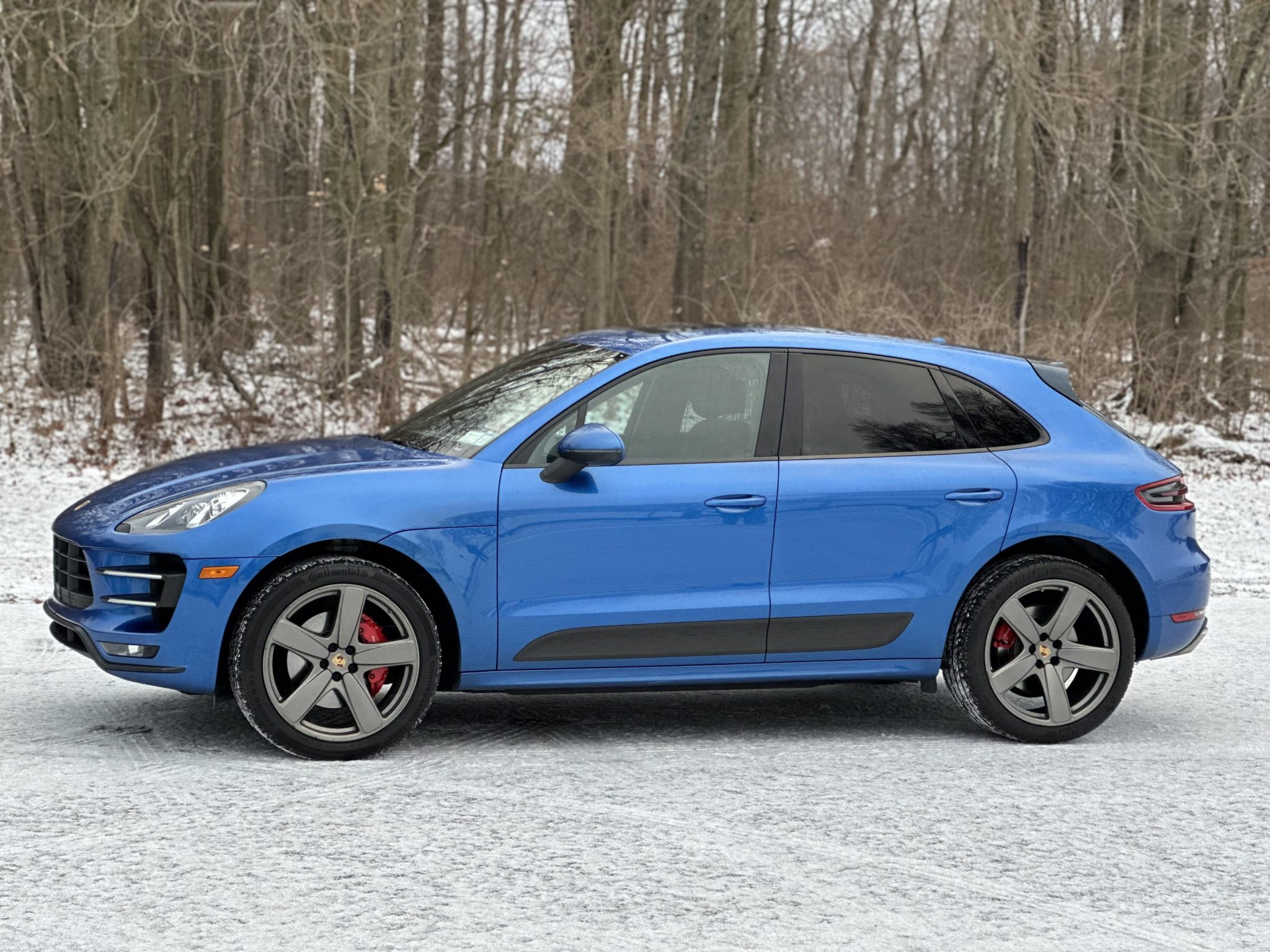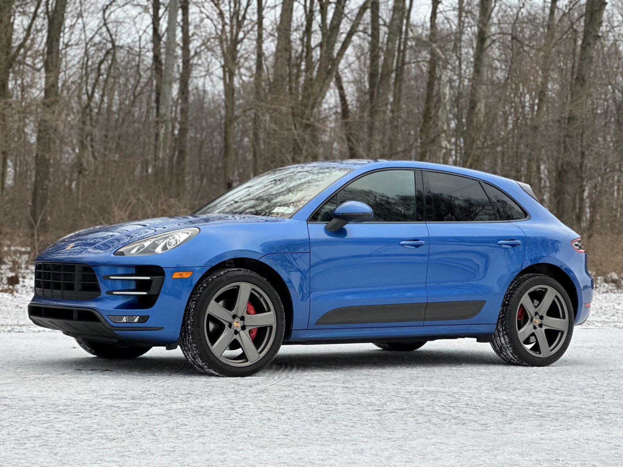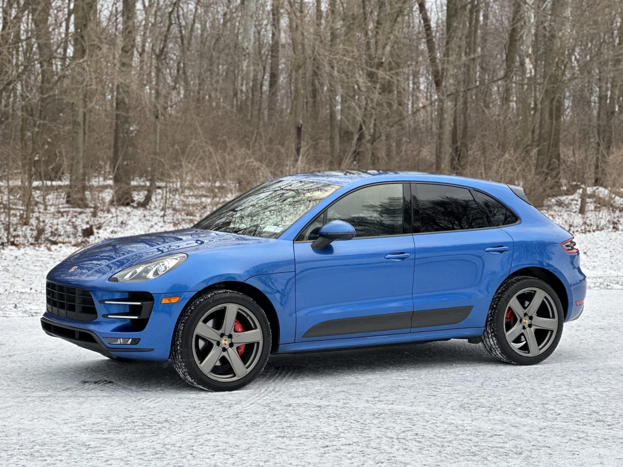 Platinum Satin-finished 21″ Sport Classic wheels are mounted with Continental and Michelin tires. The vehicle is equipped with air suspension and PASM, and stopping power is provided by four-wheel disc brakes with red Porsche-branded calipers. Multiple wheels have curb damage.